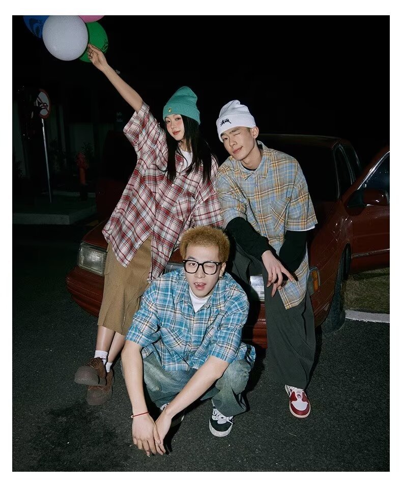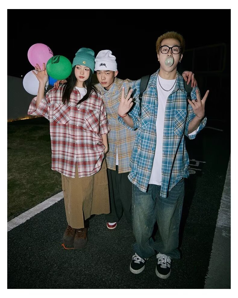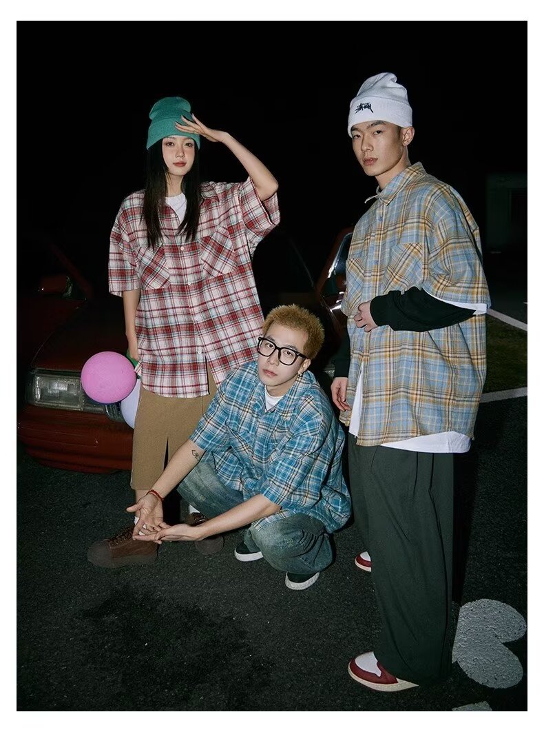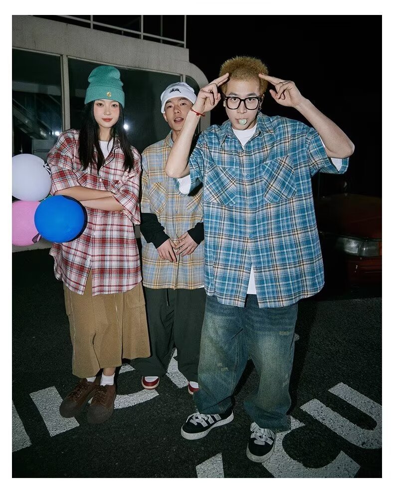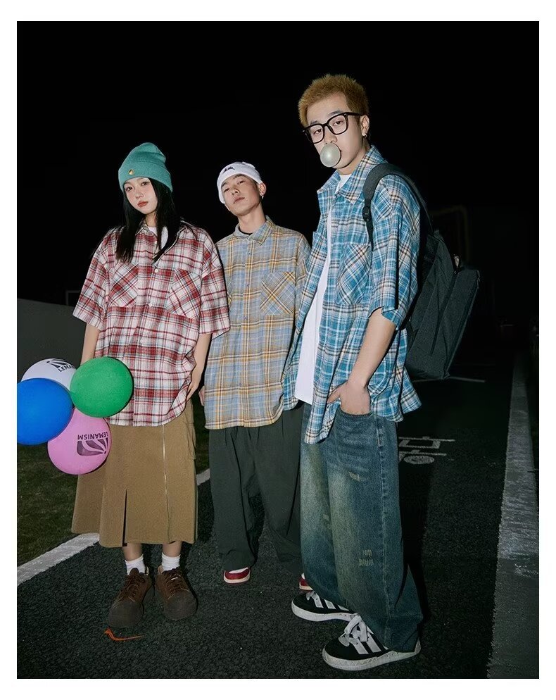여름 일본식 반팔 체크 셔츠 남성용 트렌디 브랜드 느슨한 반소매 셔츠 올매치 커플의 셔츠 남자 2024스토어 가기