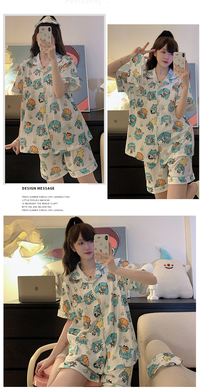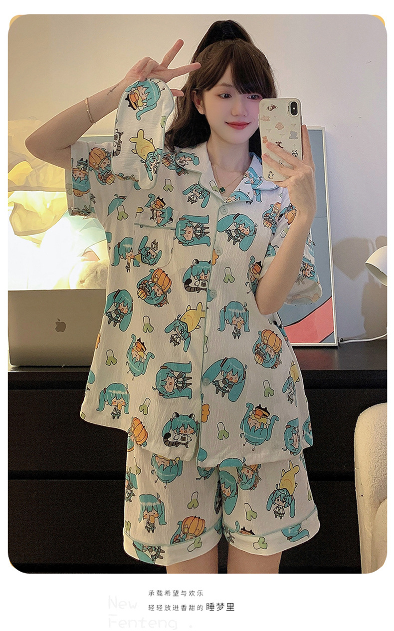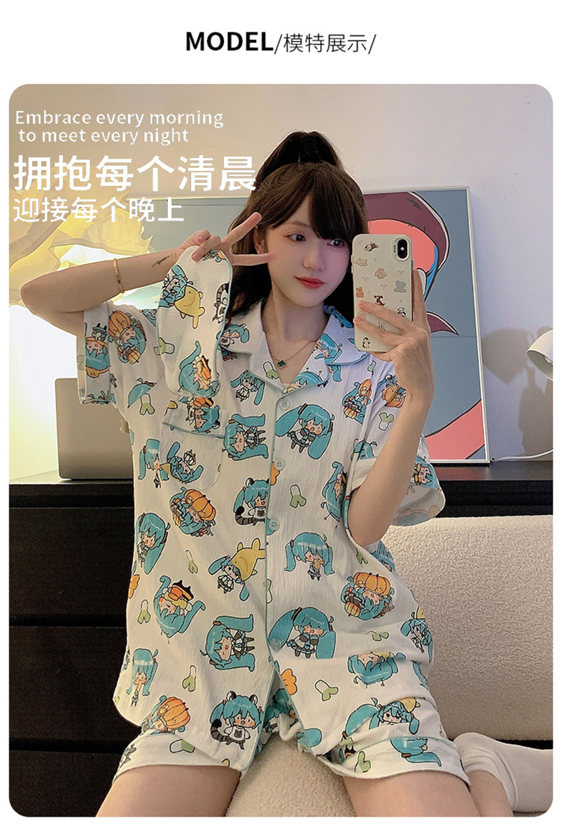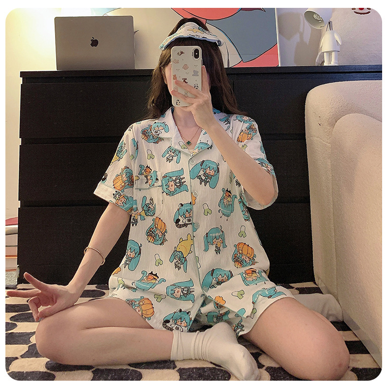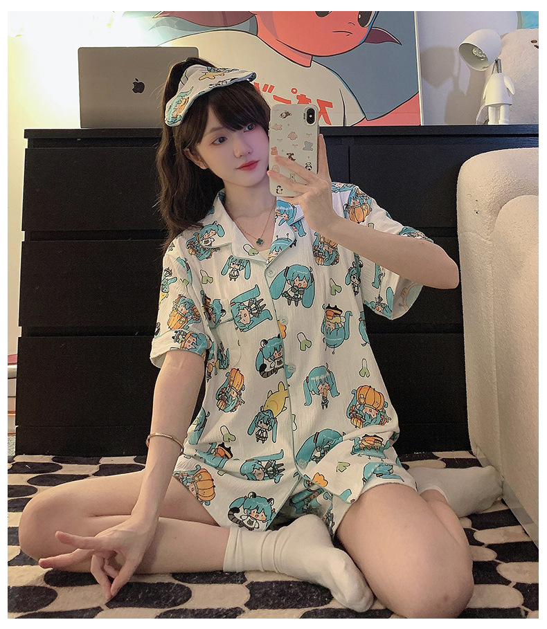 하츠네 미래 퓨어 코튼 파자마 여성 여름 만화 반팔 자동차 의류 투피스 세트 아이 마스크스토어 가기