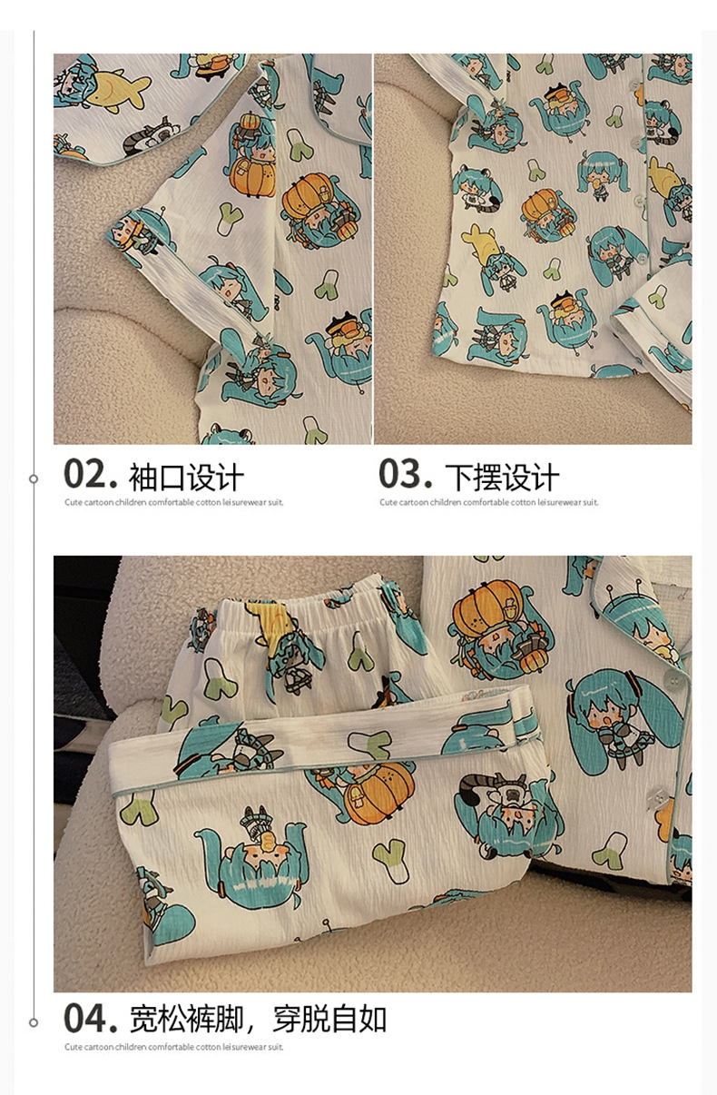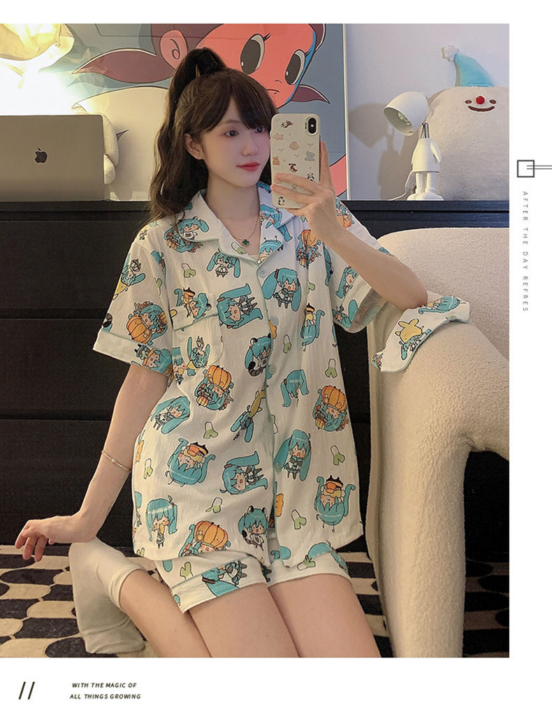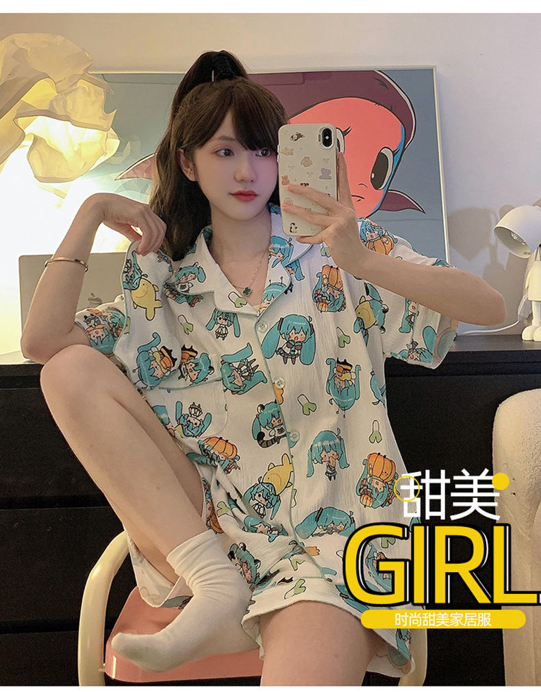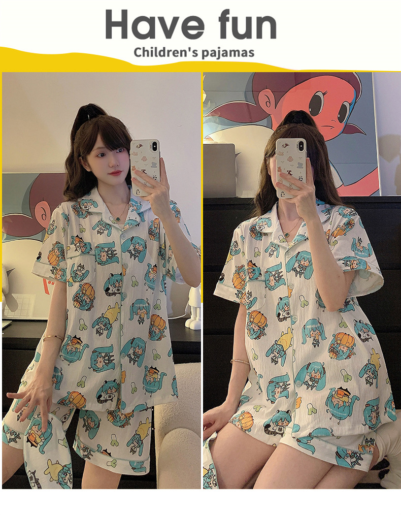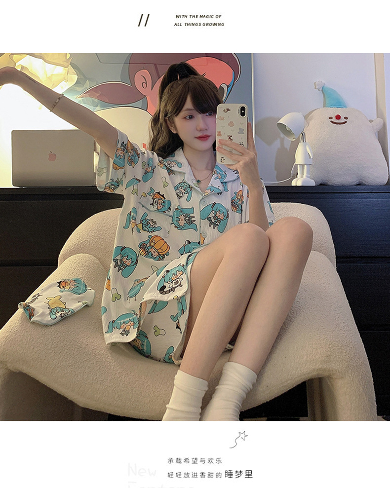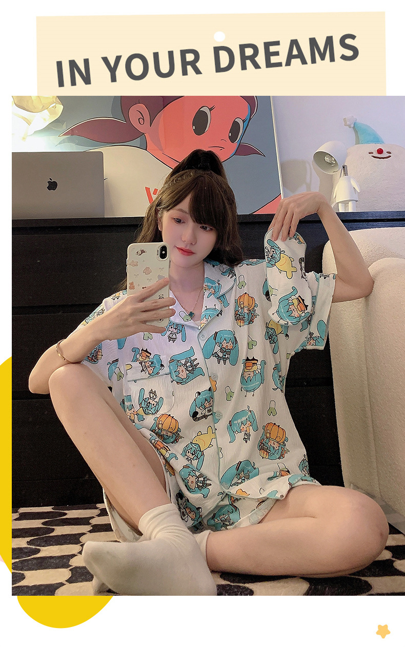 하츠네 미래 퓨어 코튼 파자마 여성 여름 만화 반팔 자동차 의류 투피스 세트 아이 마스크스토어 가기