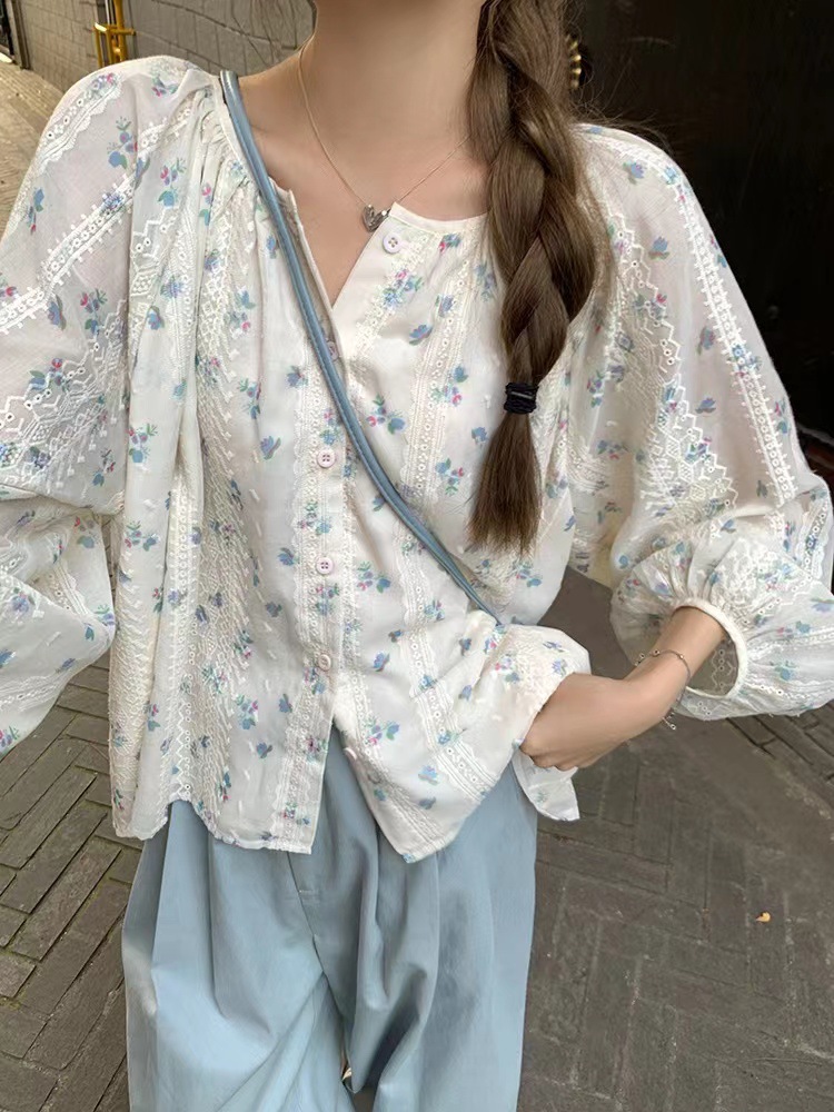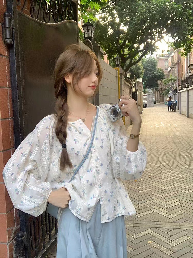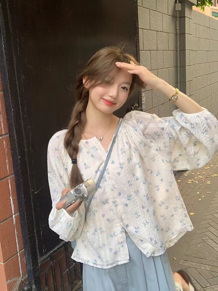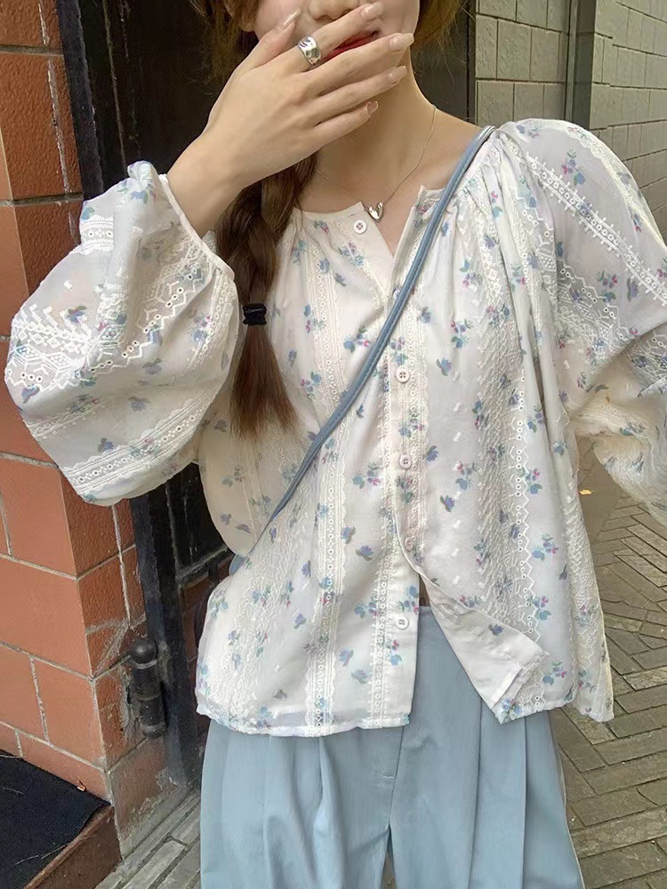 신선한 스타일 꽃 긴팔 셔츠 봄과 여름 새로운 도착 느슨한 슬리밍 라운드 넥 달콤한 가리 쉬폰 셔츠스토어 가기