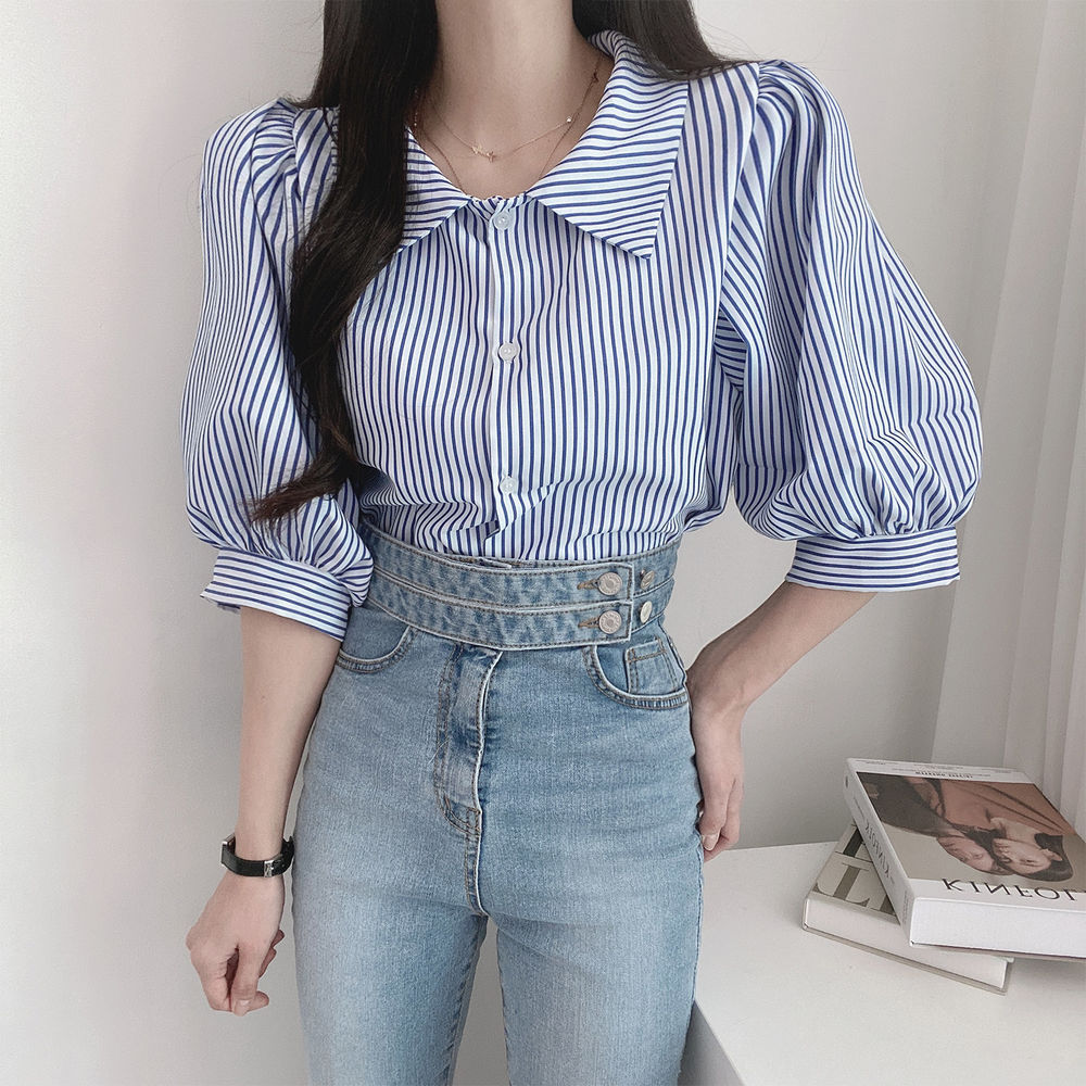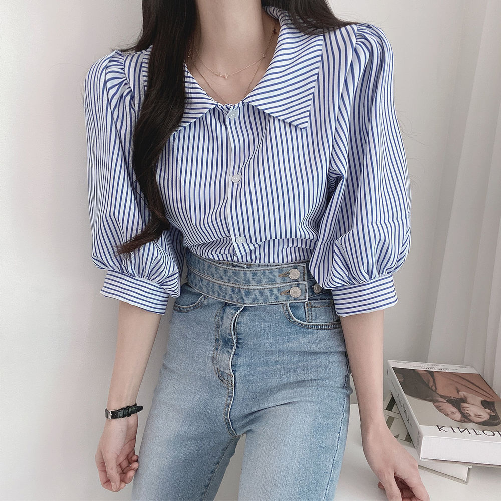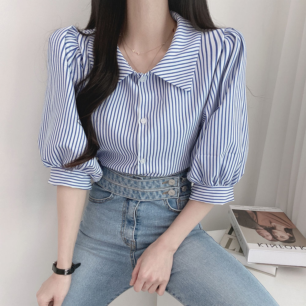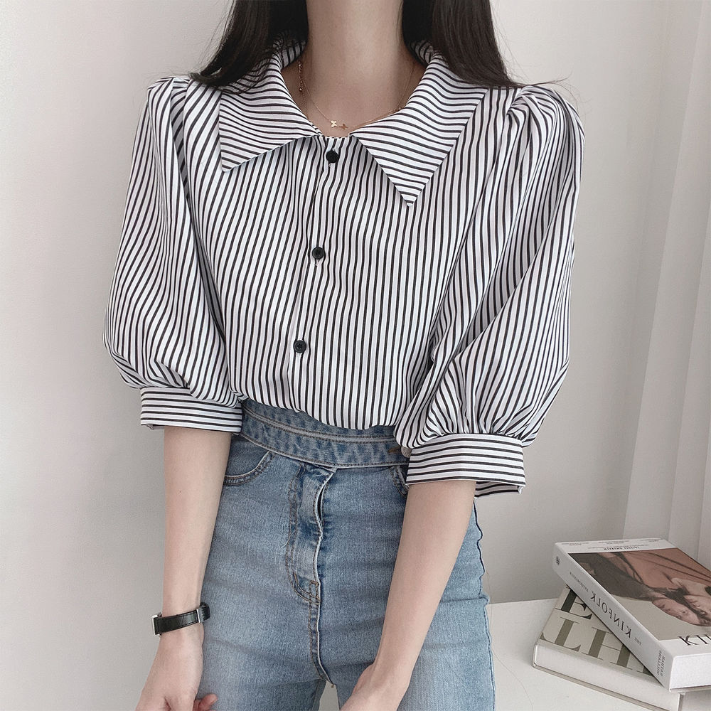 한국 스타일 레트로 반소매 줄무늬 셔츠 여자 여름 2024 새로운 도착 여자 느슨한 올 매치 퍼프 소매 셔츠