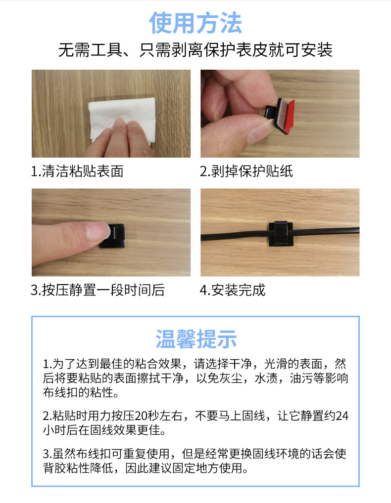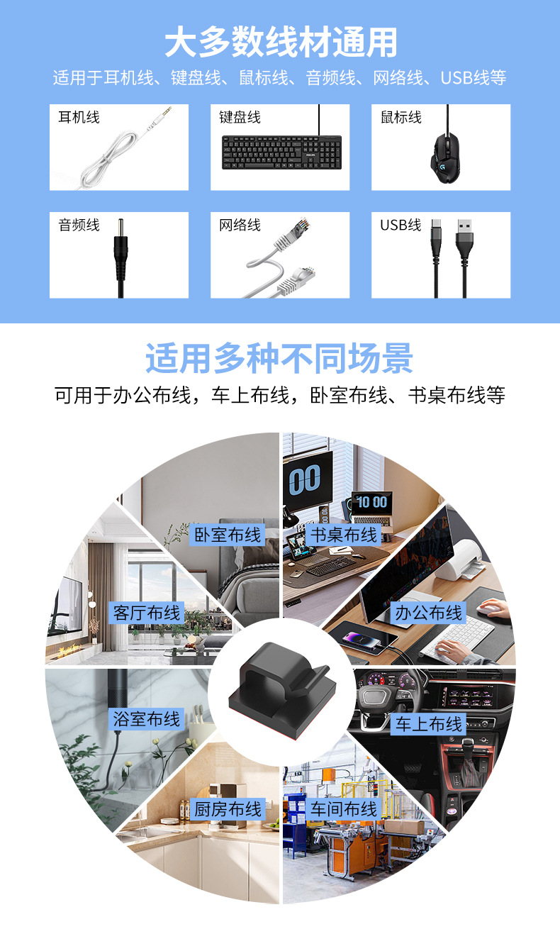 【产品用途】适用于USB线、鼠标线、数据线、网络线、音频线、电源线、汽车走线、灯带走线等布线固线夹线理线