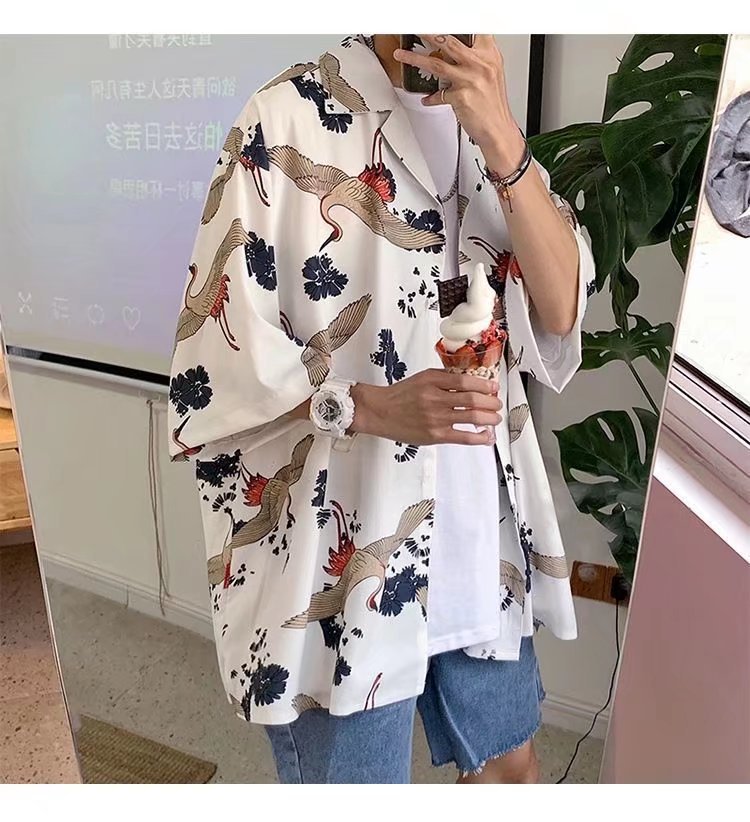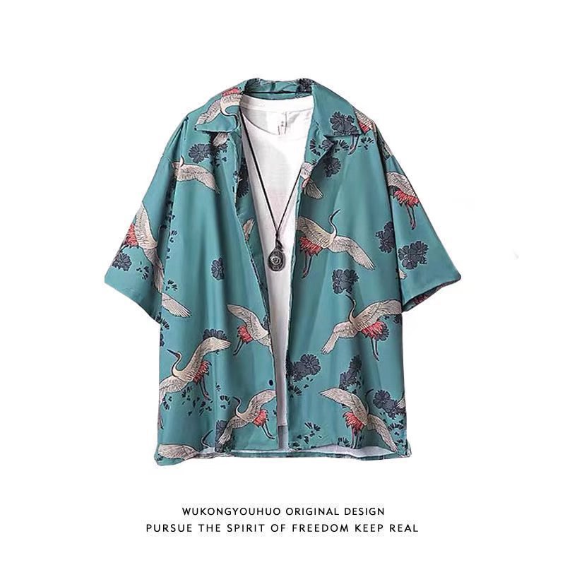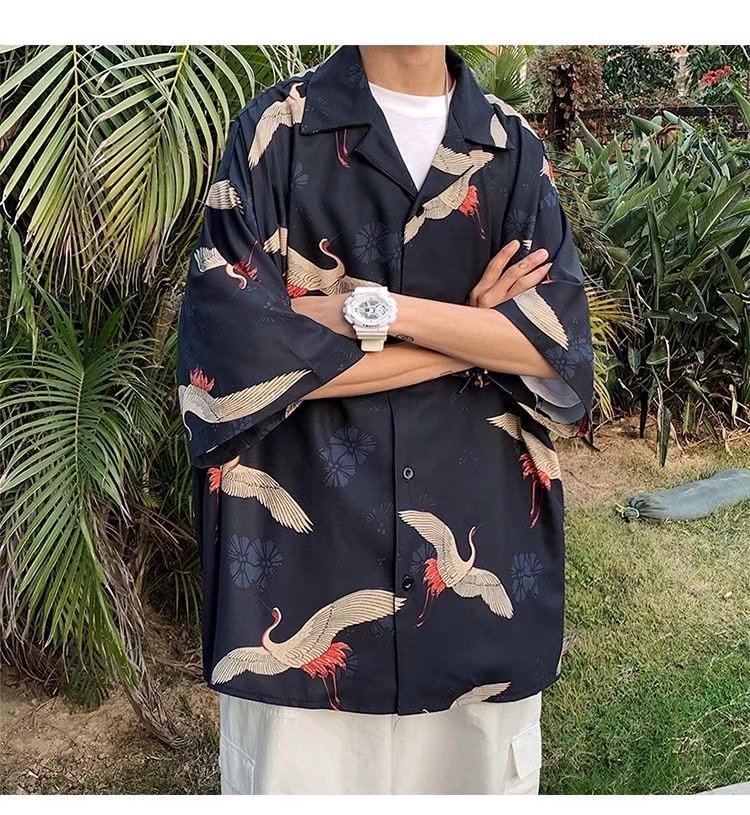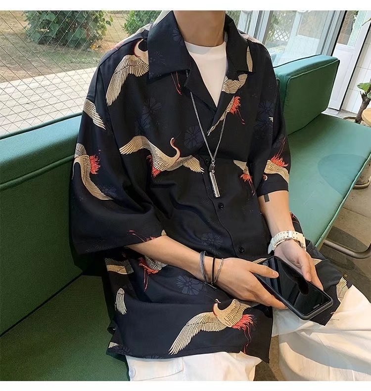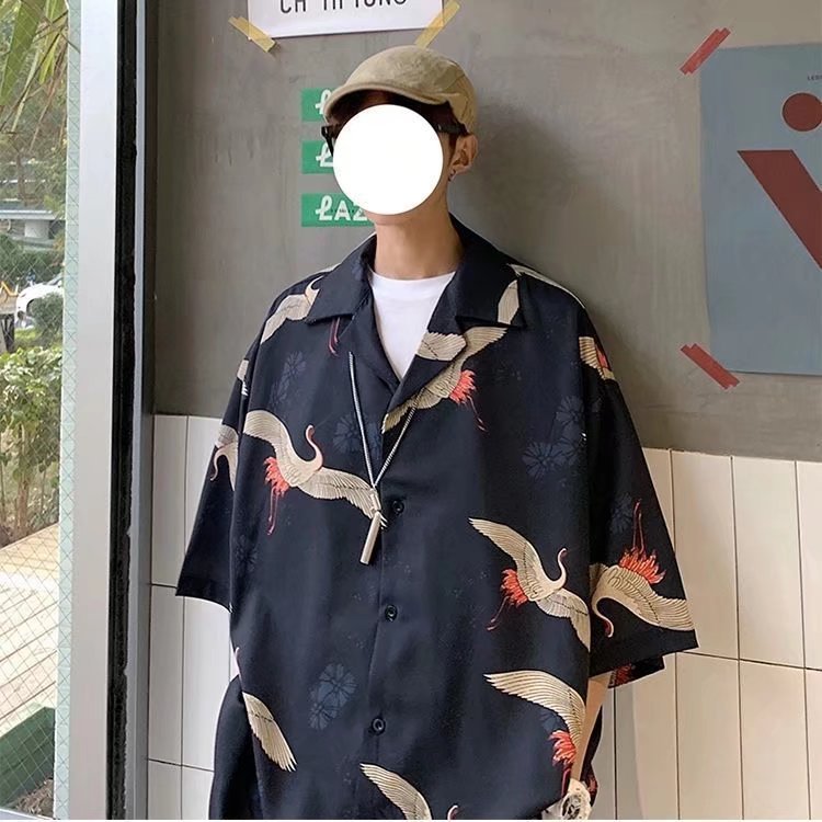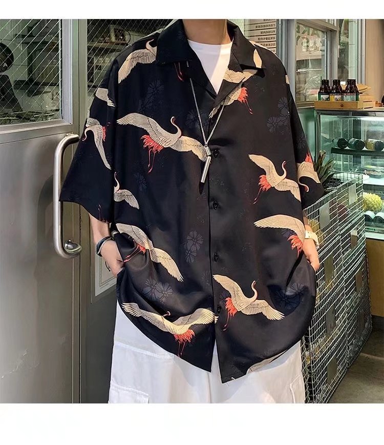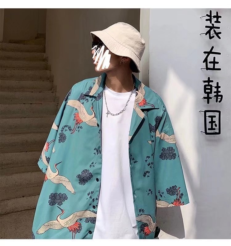 크레인 반 소매 셔츠 남자의 한국 스타일 유행 여름 인쇄 된 루즈 인 짧은 소매 셔츠 캐주얼 얇은 재킷스토어 가기