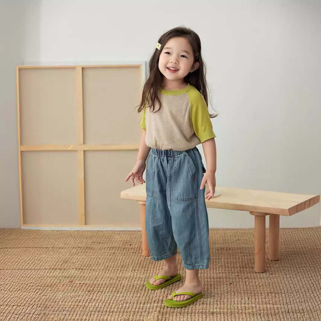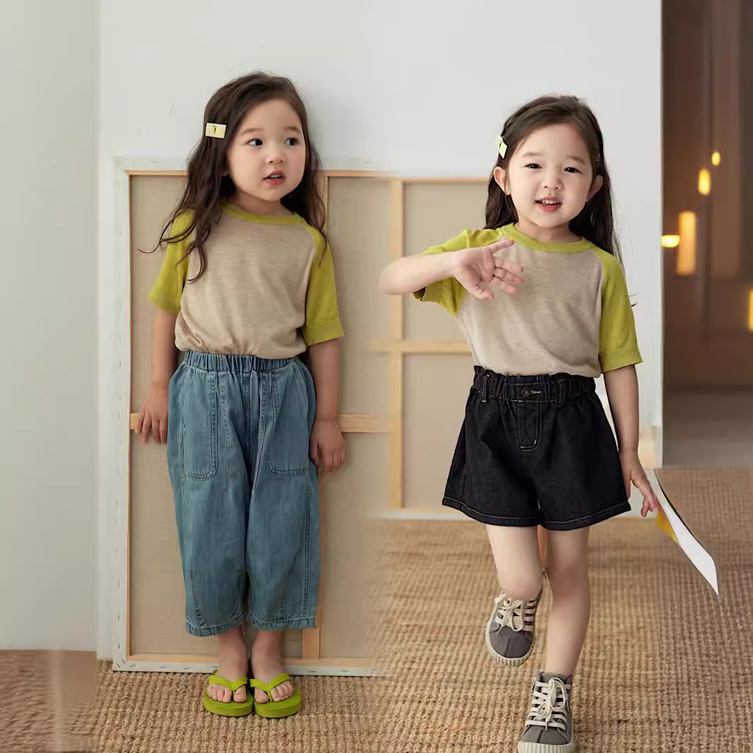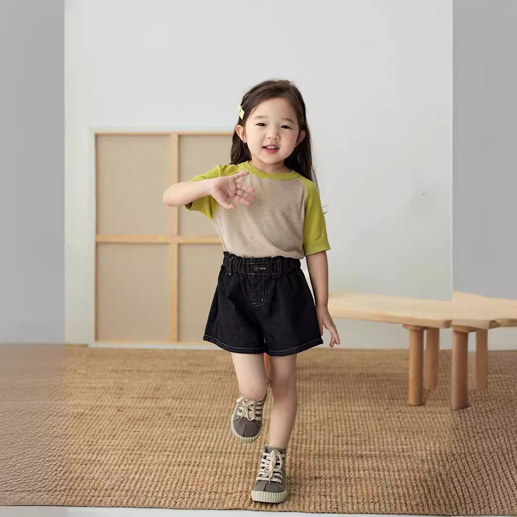 재고 24 소녀 여름 새로운 니트 세트 대조 컬러 바느질 짧은 소매 상단 캐주얼 간단한 데님 세트