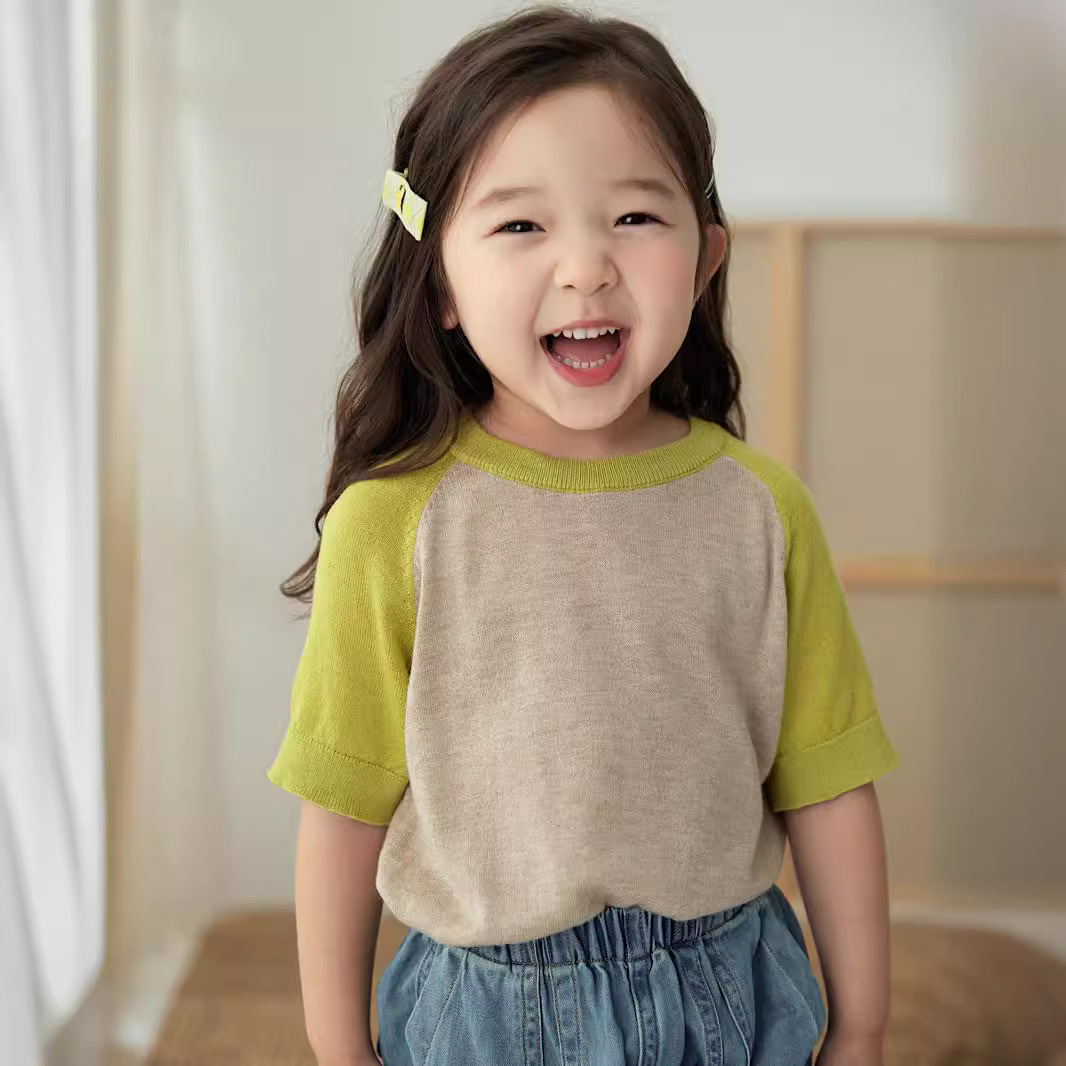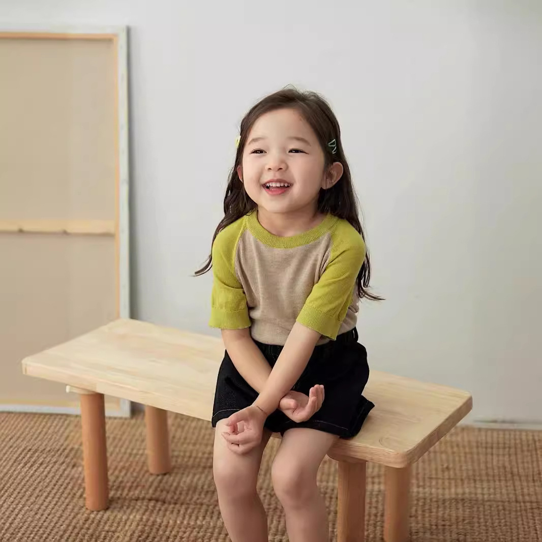 재고 24 소녀 여름 새로운 니트 세트 대조 컬러 바느질 짧은 소매 상단 캐주얼 간단한 데님 세트스토어 가기