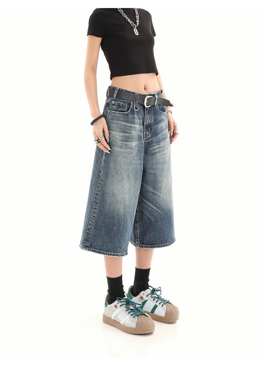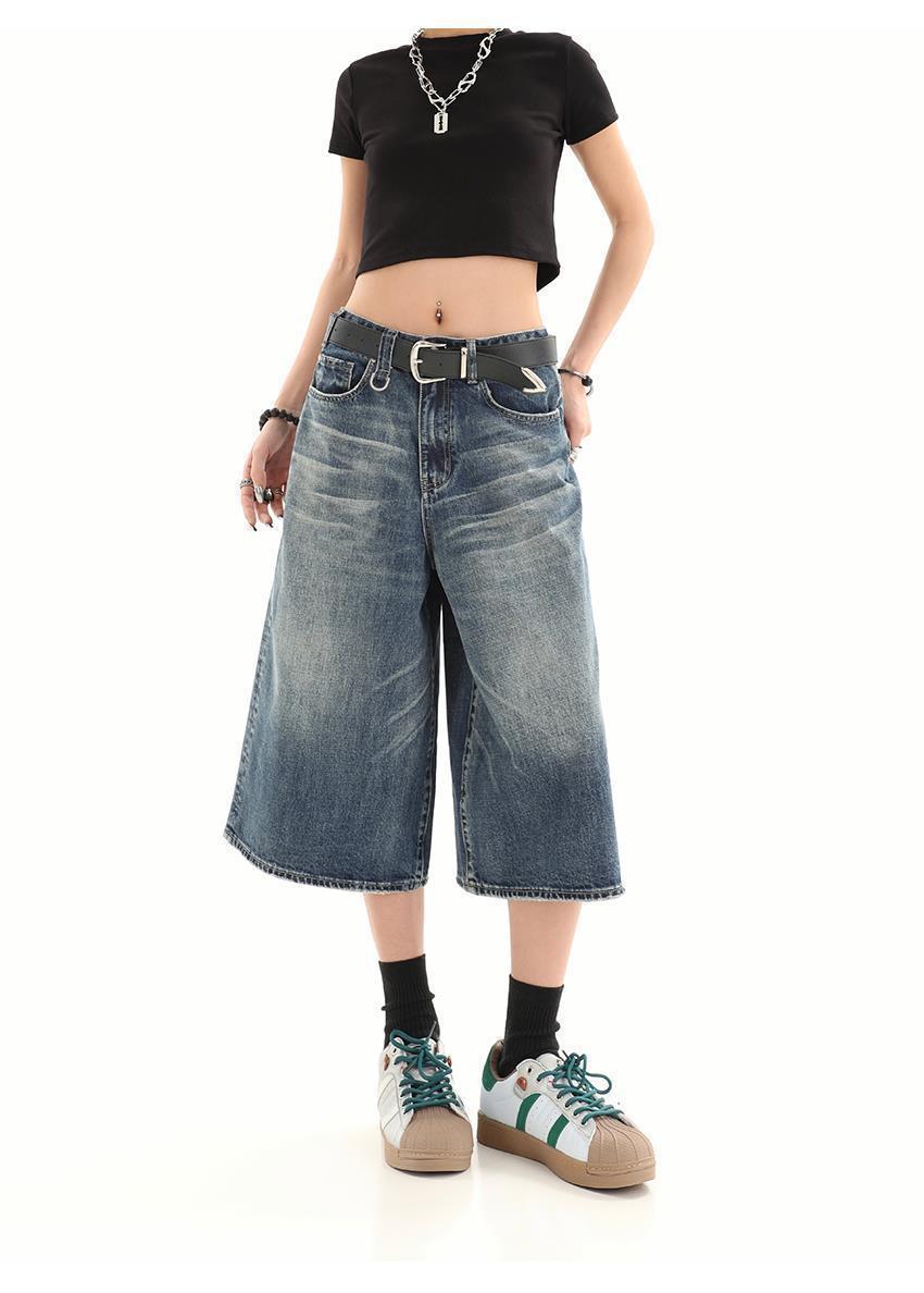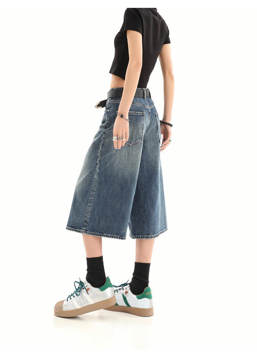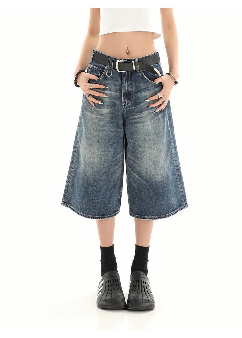 아메리칸 스타일 레트로 느슨한 프로필 씻은 오래된 자른 데님 반바지 남성 여름 하이 스트리트 디자인 와이드 다리 바지스토어 가기
