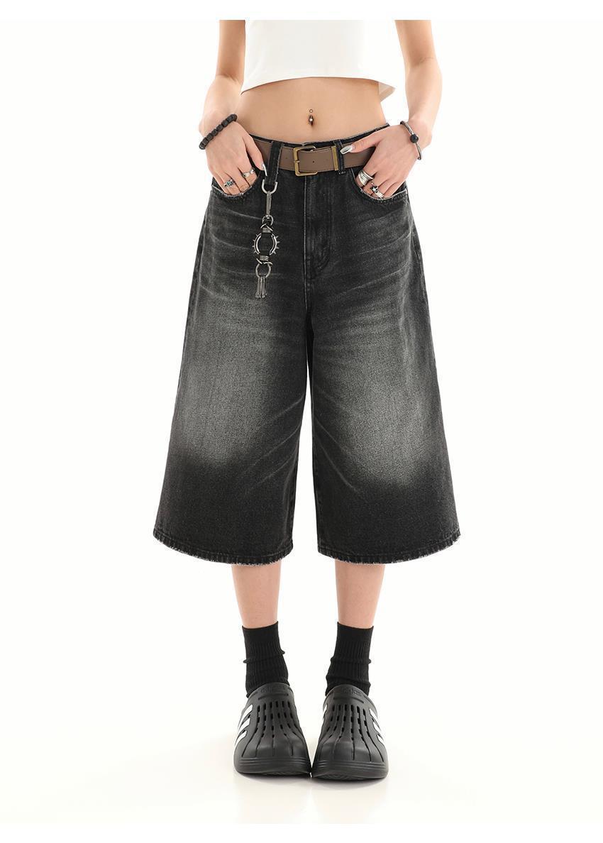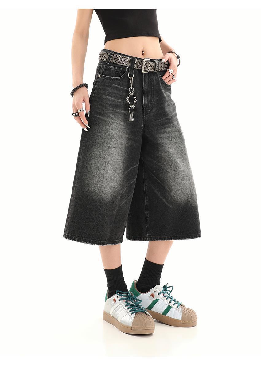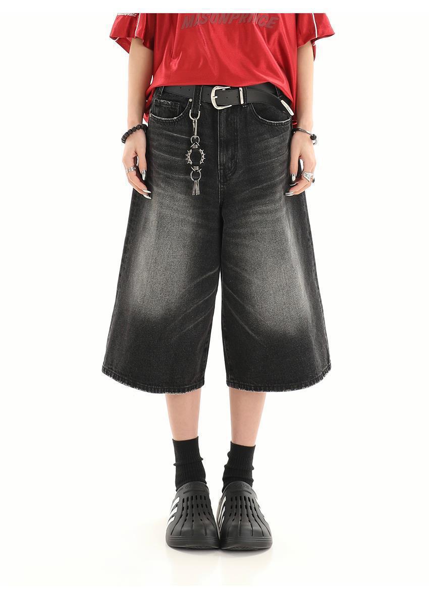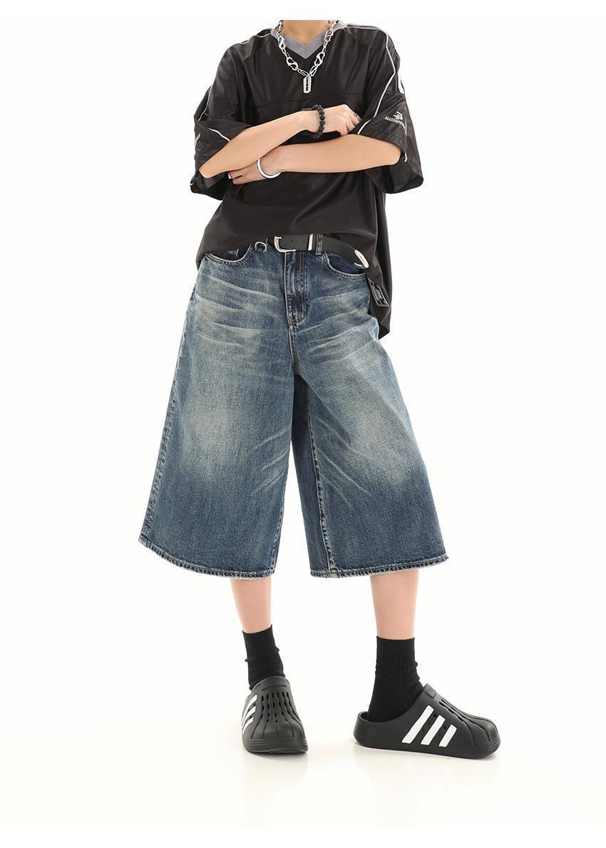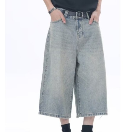아메리칸 스타일 레트로 느슨한 프로필 씻은 오래된 자른 데님 반바지 남성 여름 하이 스트리트 디자인 와이드 다리 바지