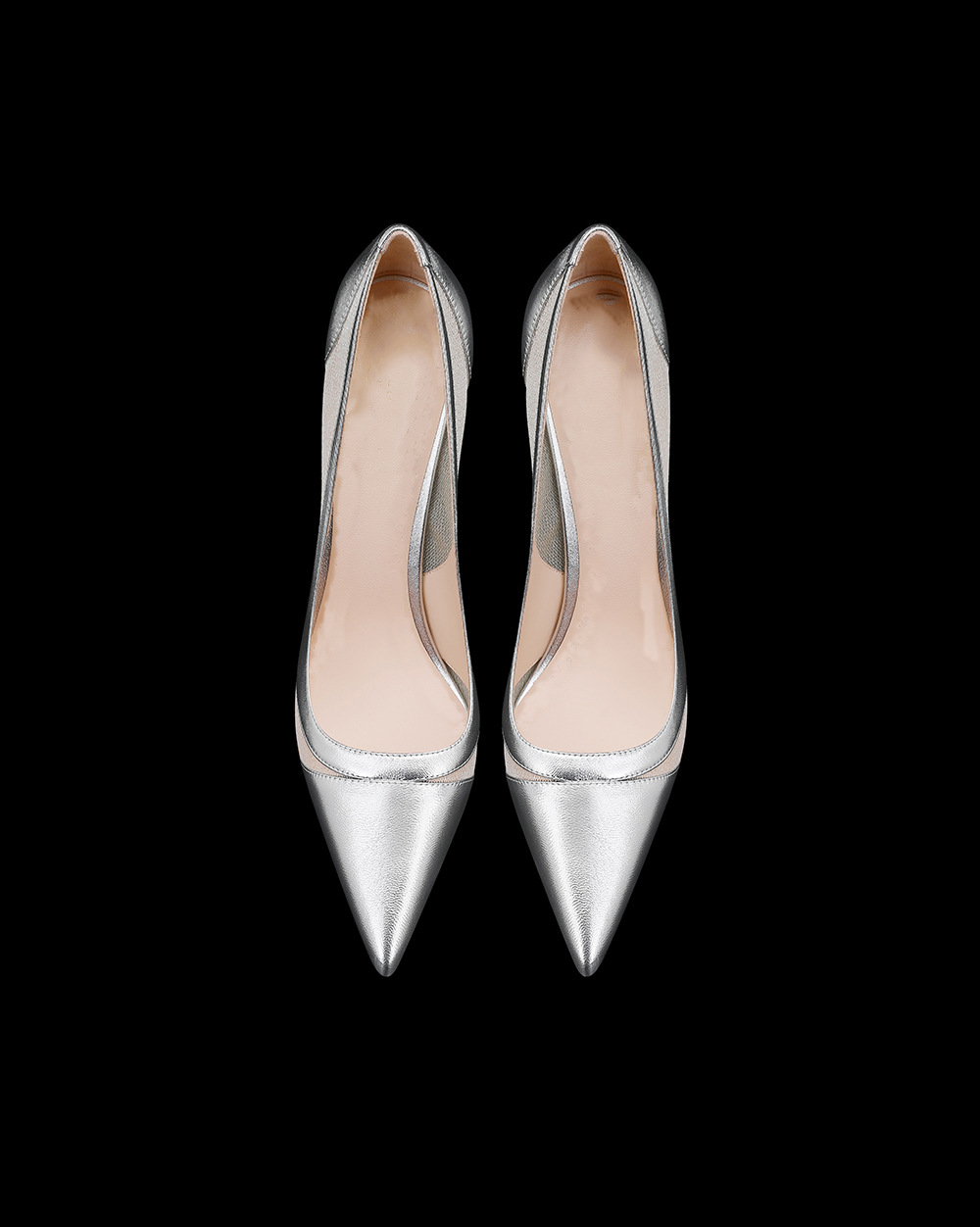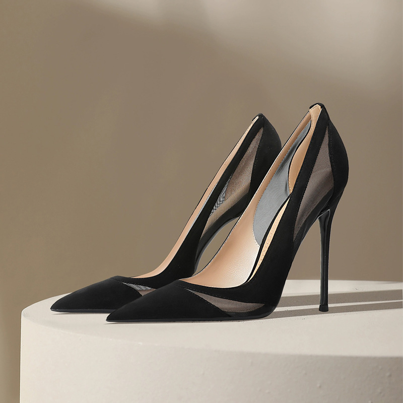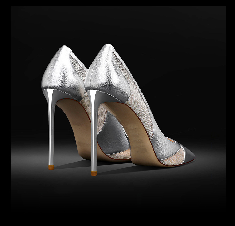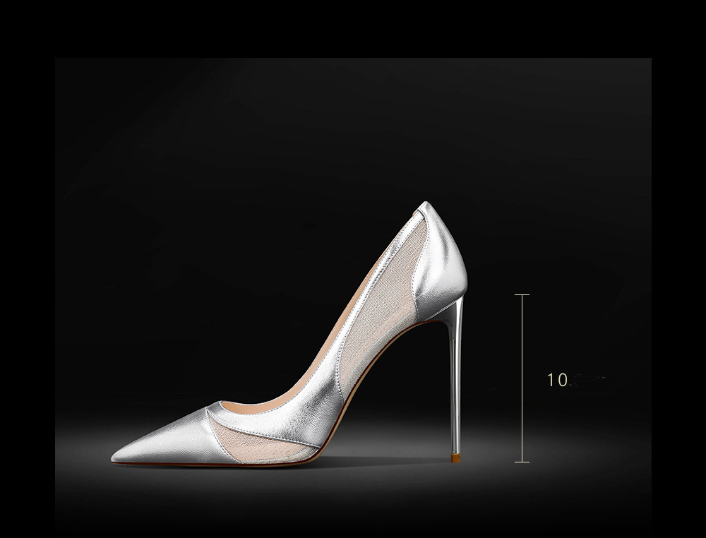 32-45 사이즈 2024 봄 새로운 스티칭 메쉬 실버 하이힐 여성 뾰족한 발가락 낮은 베일 기질 스틸레토 힐 신발스토어 가기