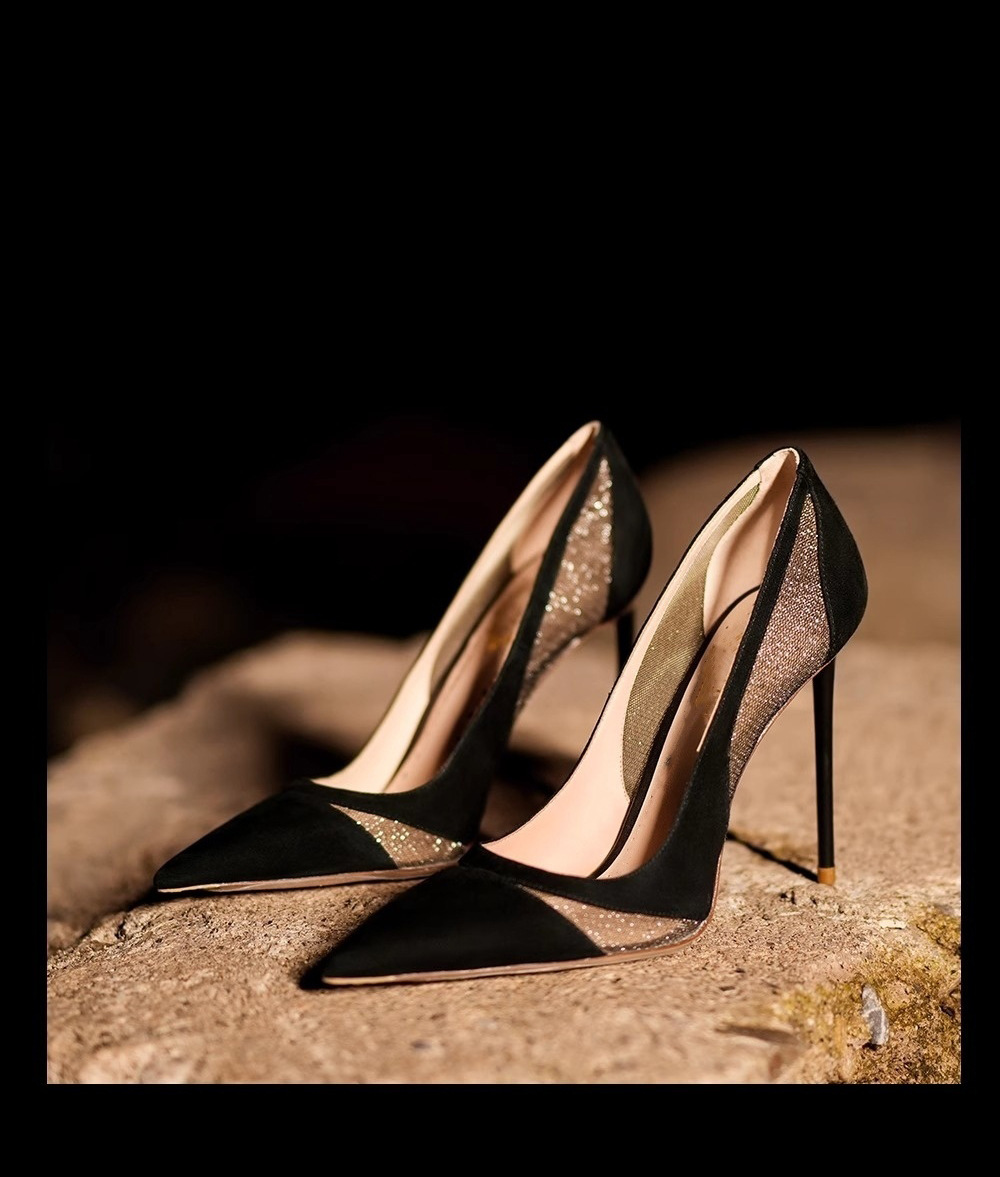 32-45 사이즈 2024 봄 새로운 스티칭 메쉬 실버 하이힐 여성 뾰족한 발가락 낮은 베일 기질 스틸레토 힐 신발