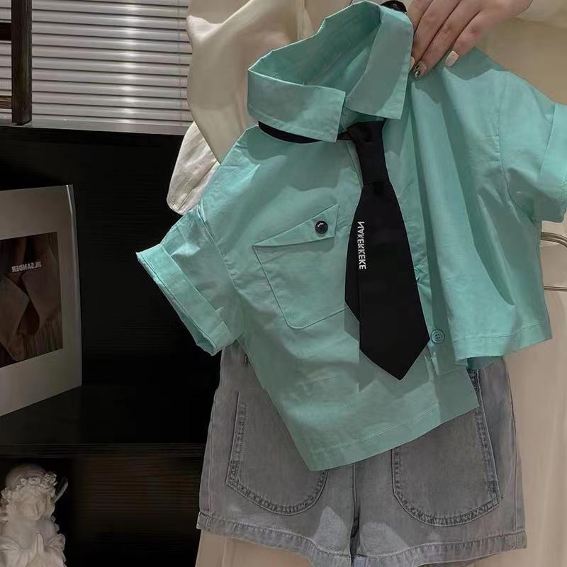 한국식 아동복 소년 반팔 셔츠 여름 새 도착 더피 잘 생긴 소년 서양식 올매치 그린 아동면 탑스토어 가기