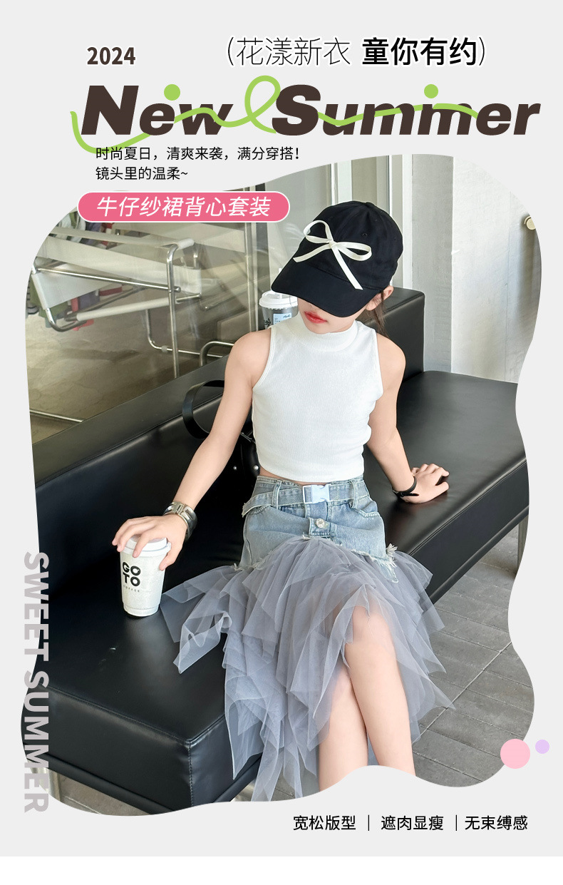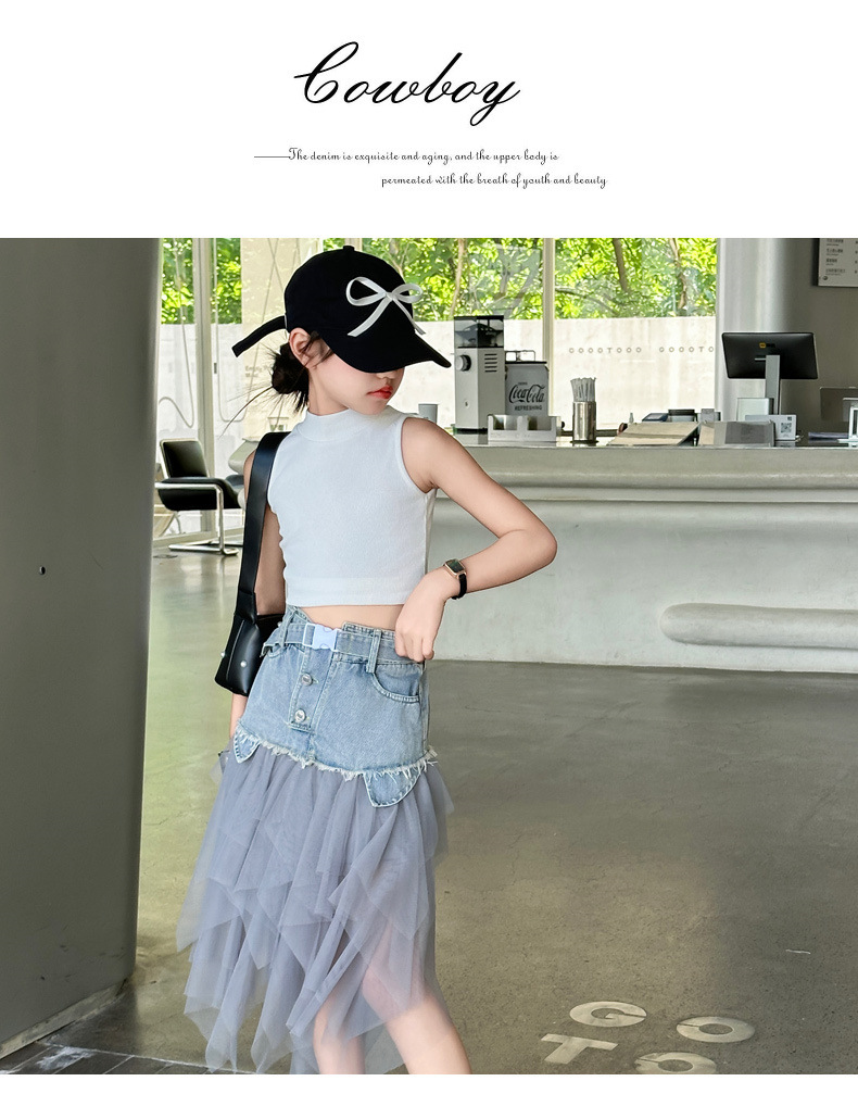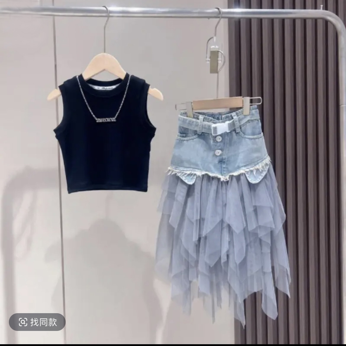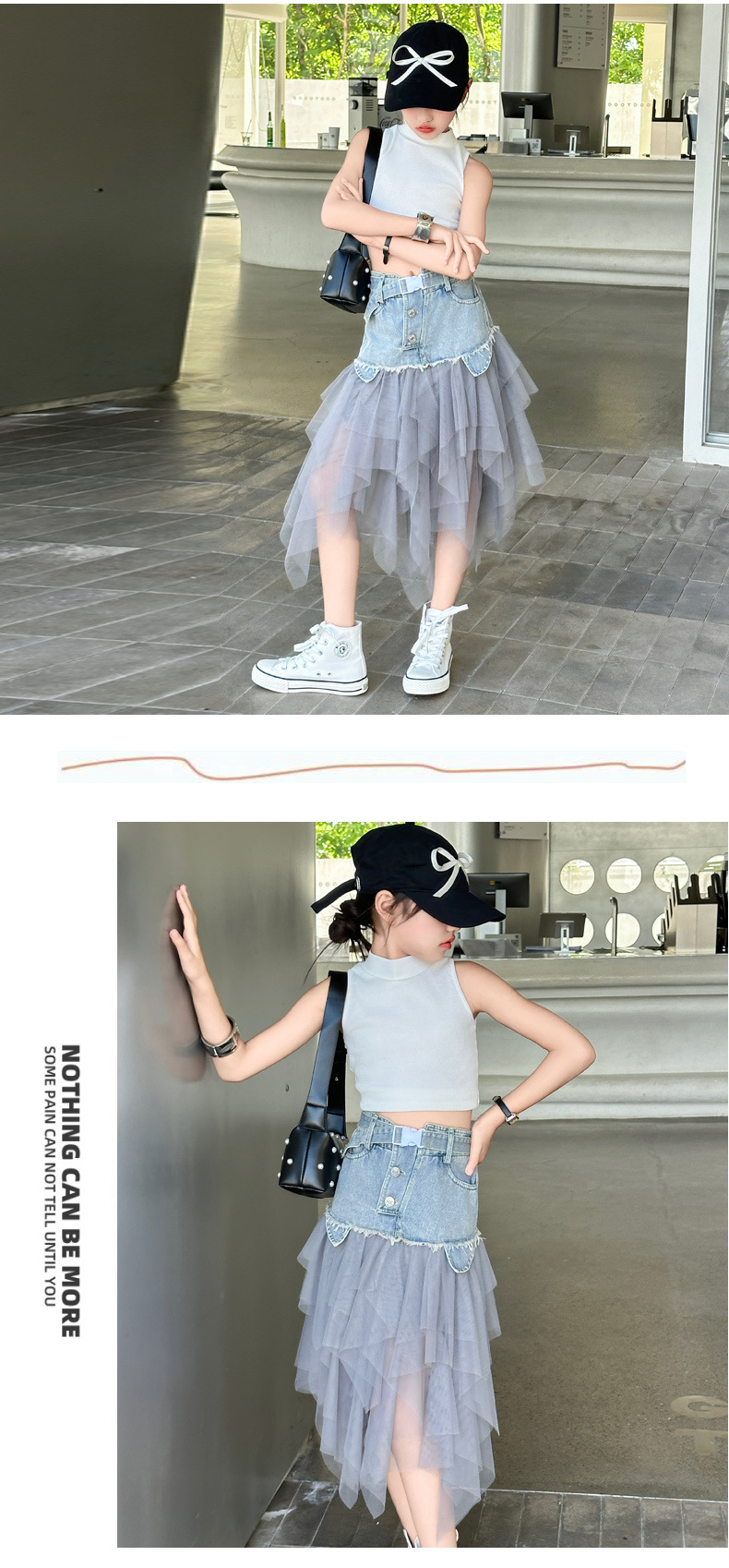 여아 여름 메쉬 스커트 세트 2025 신상 인기 아동 민소매 조끼 데님 스티치 메쉬 스커트 투피스 세트