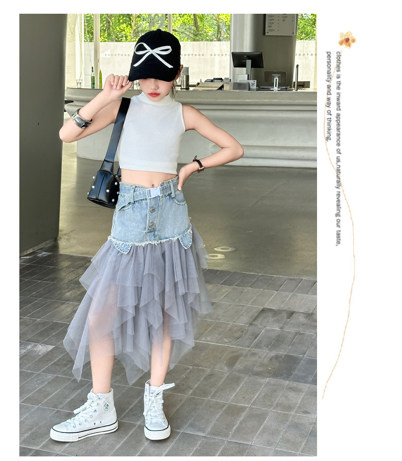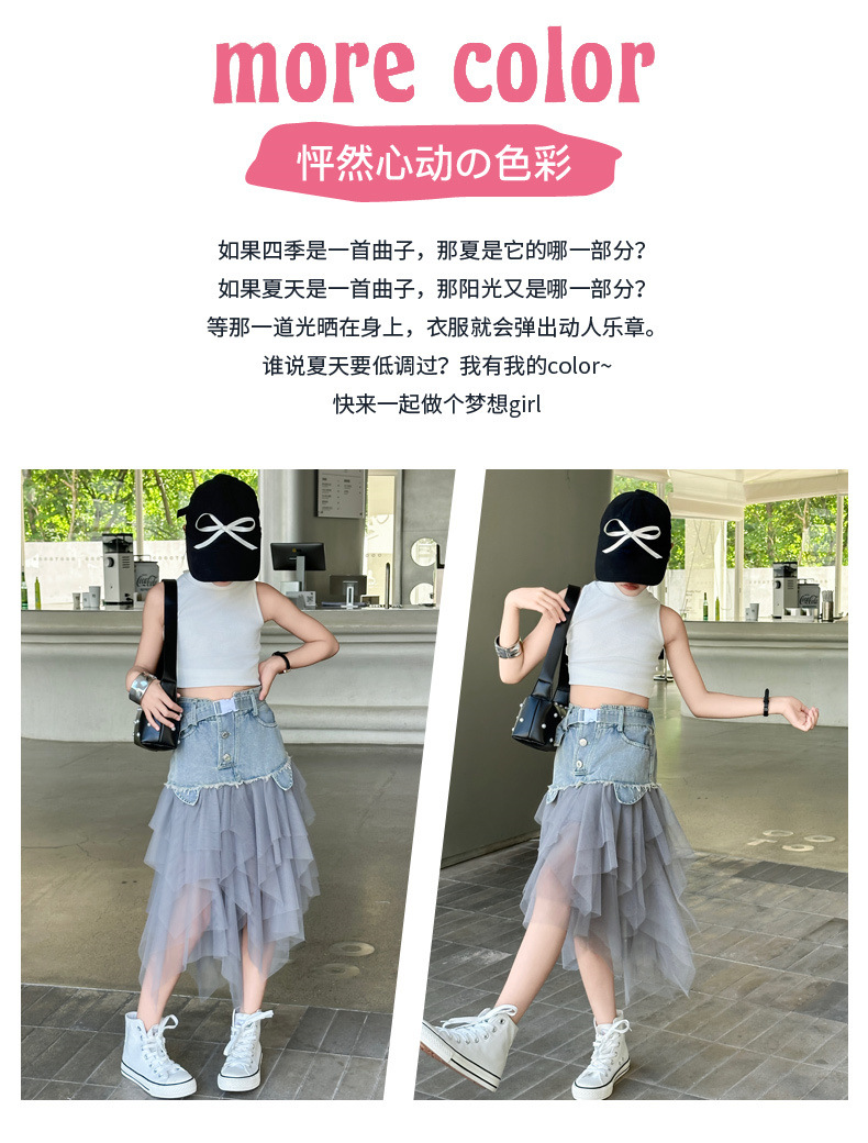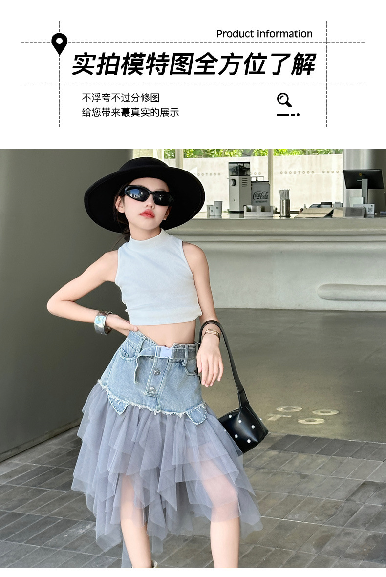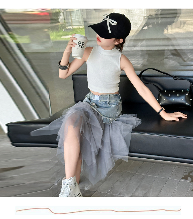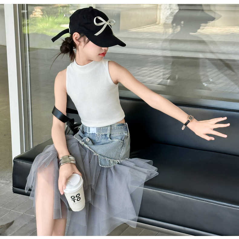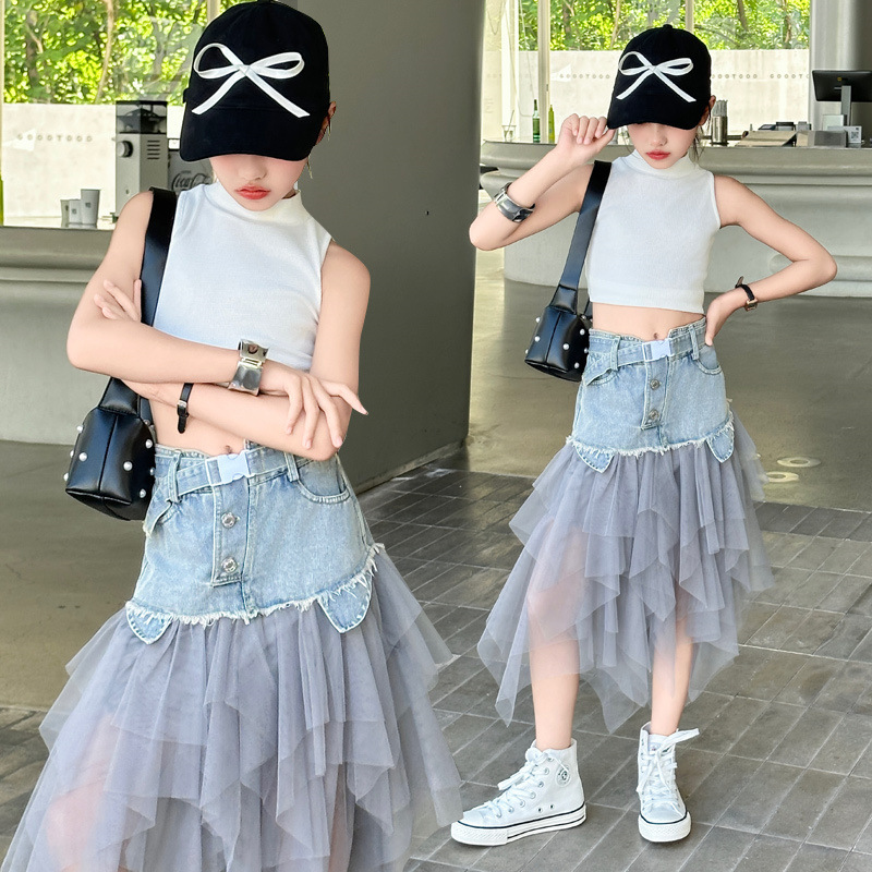 여아 여름 메쉬 스커트 세트 2025 신상 인기 아동 민소매 조끼 데님 스티치 메쉬 스커트 투피스 세트