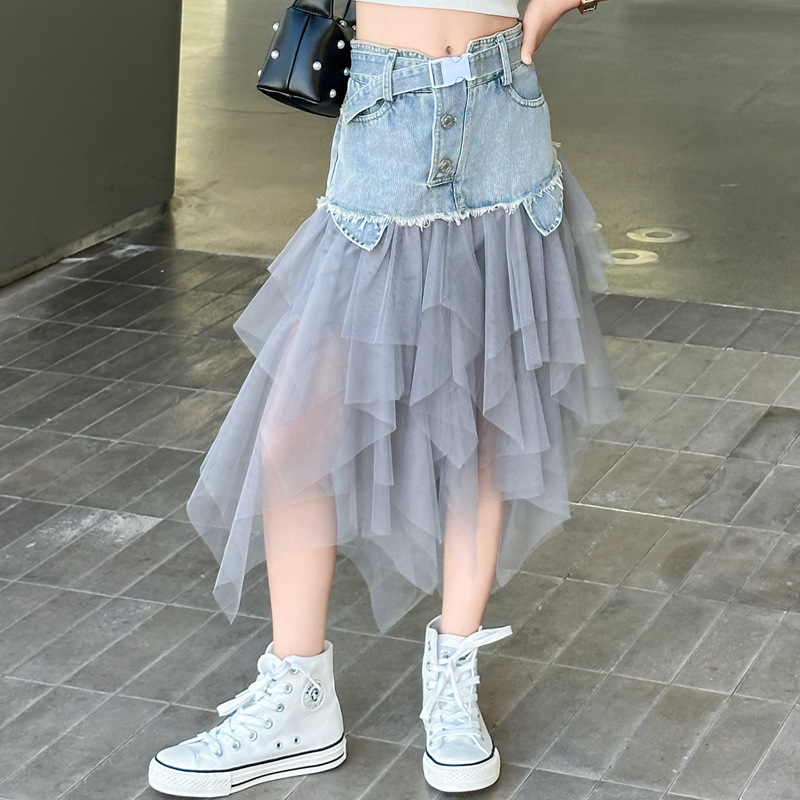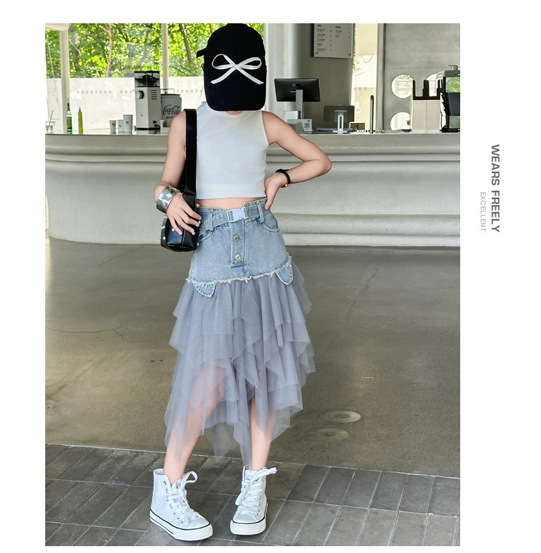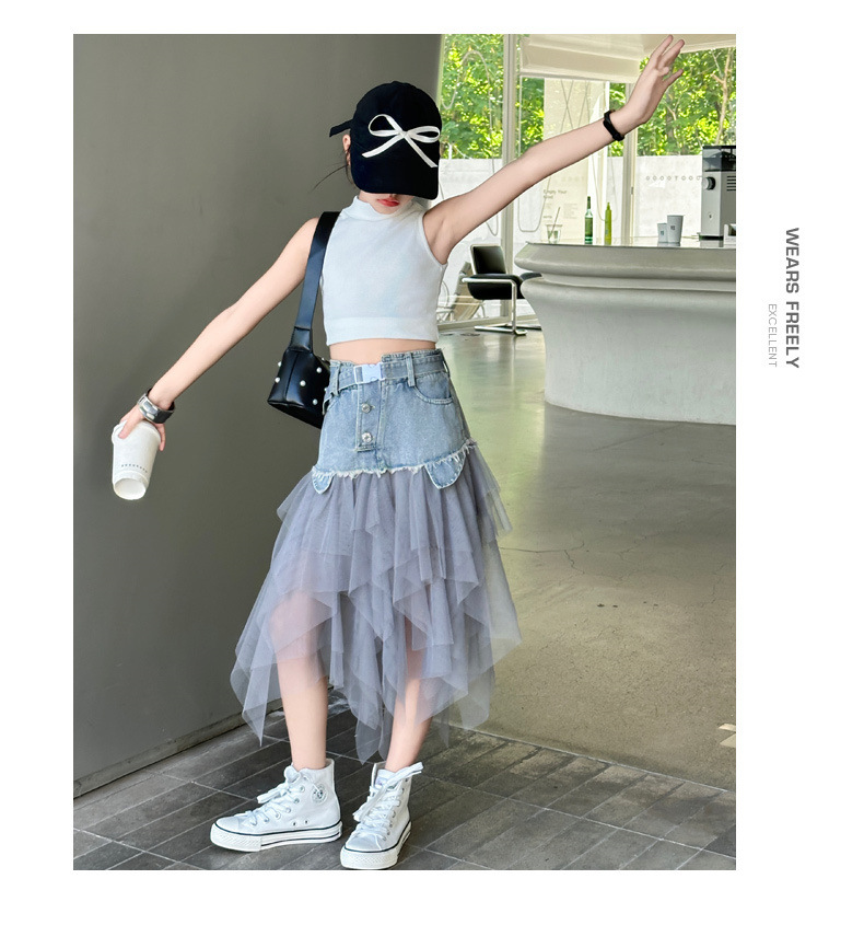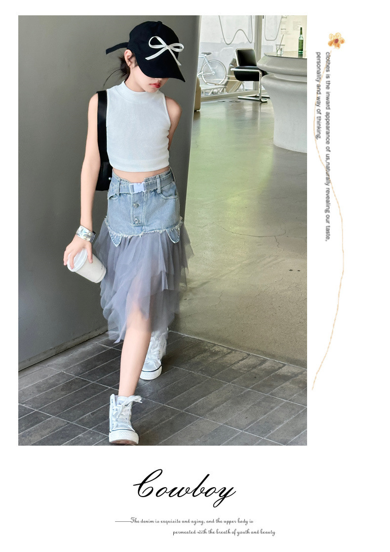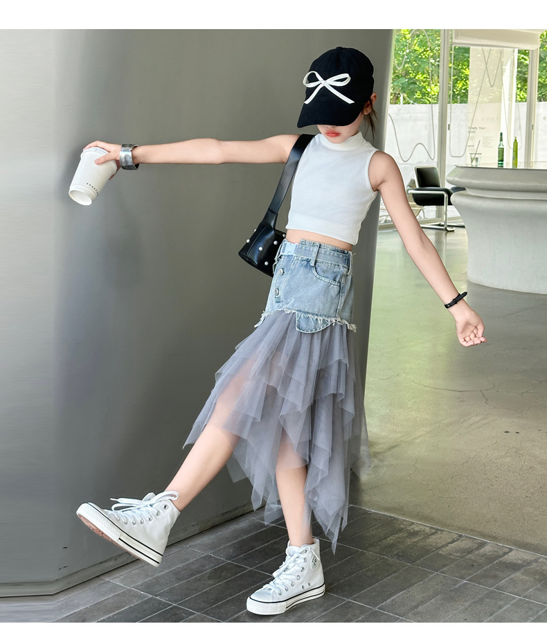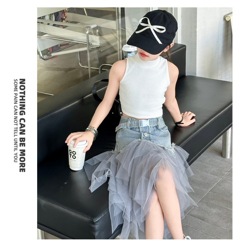 여아 여름 메쉬 스커트 세트 2025 신상 인기 아동 민소매 조끼 데님 스티치 메쉬 스커트 투피스 세트