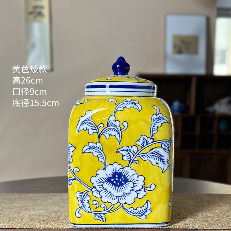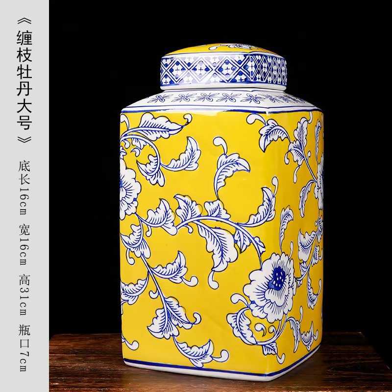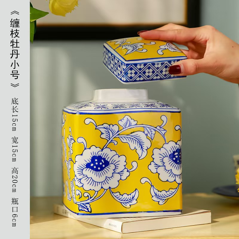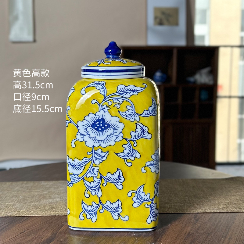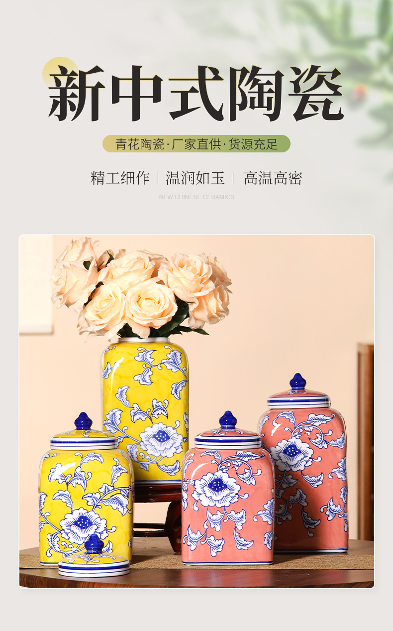 새로운 중국 제국 노란 광장 저장 항아리 빨간 세라믹 꽃병 입장 럭셔리 인공 꽃 꽃병 부드러운 장식