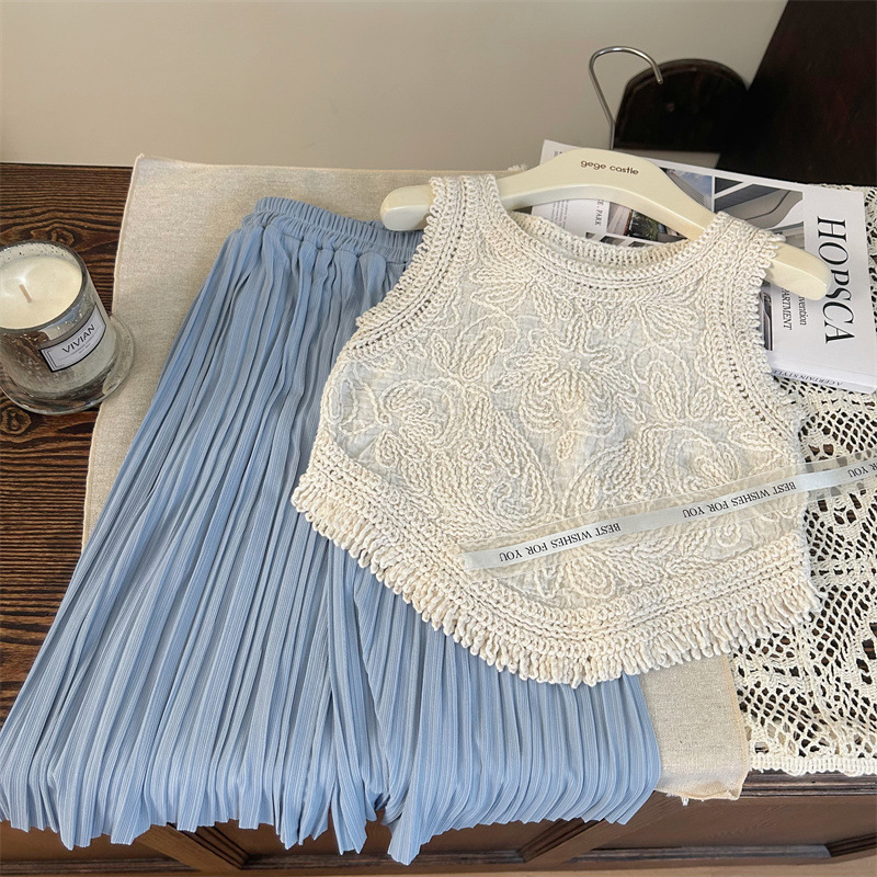 한국 스타일 아동복 2024 새로운 여름 소녀 레이스 꽃 민소매 조끼 얇은 얼음 실크 넓은 다리 바지 투피스 세트