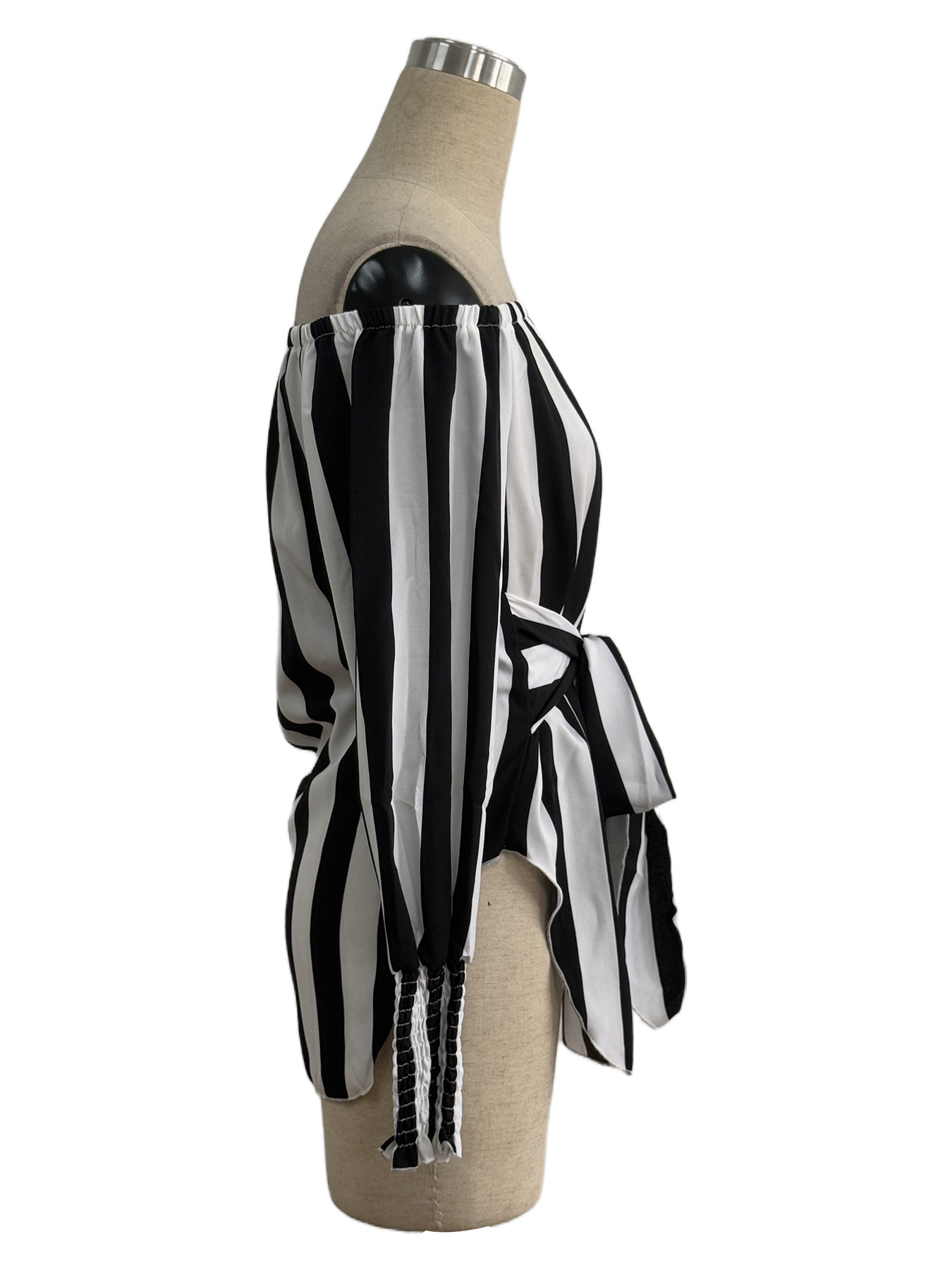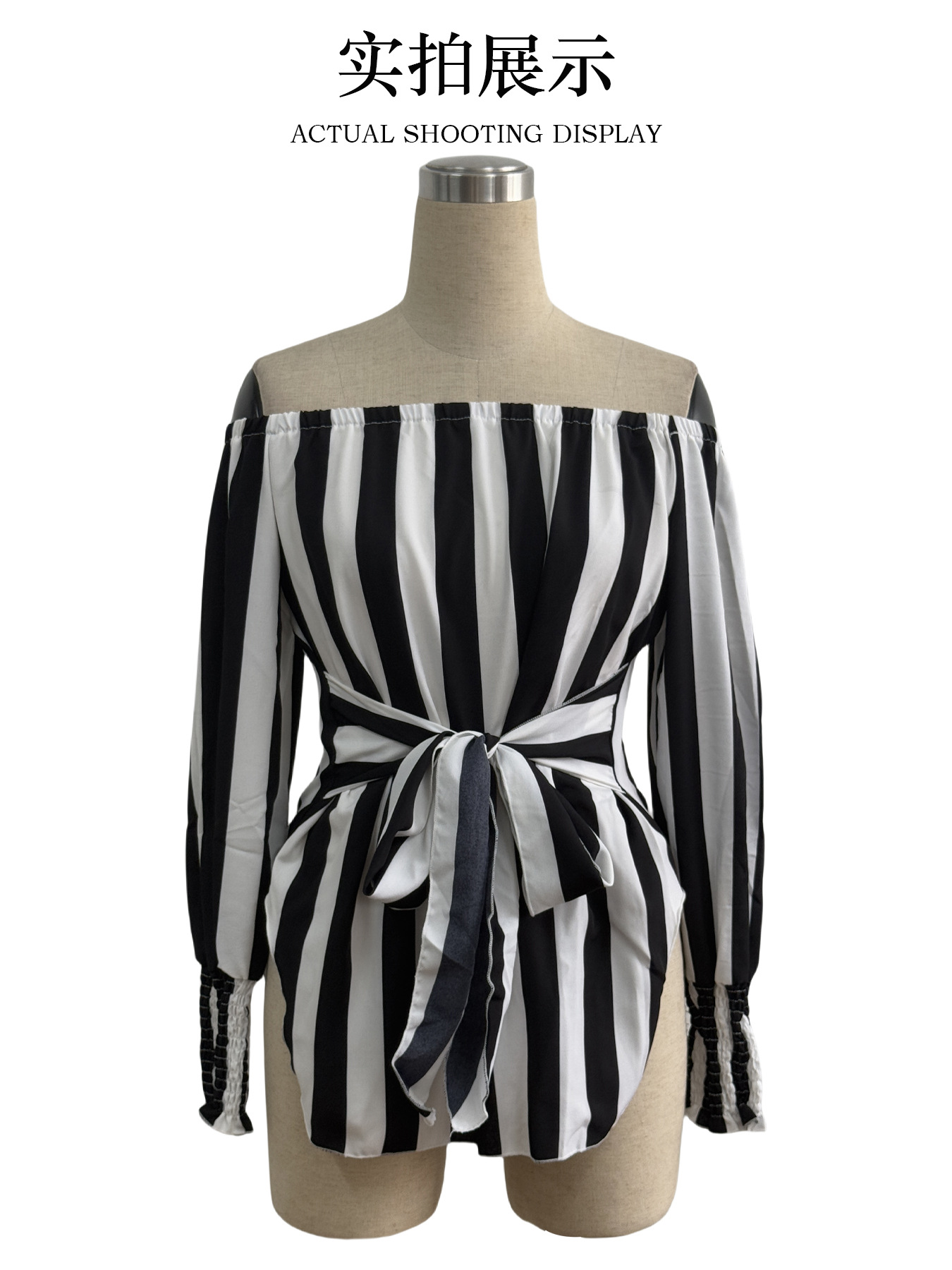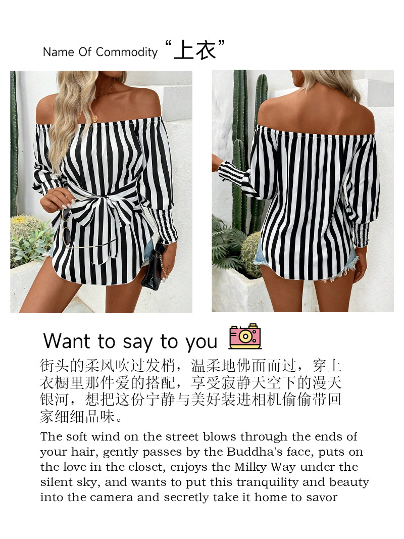 유럽 및 미국 해외직구 2025 신상 여성 패션 루즈핏 오프숄더 랜턴 슬리브 비대칭 밑단 스트라이프 셔츠스토어 가기