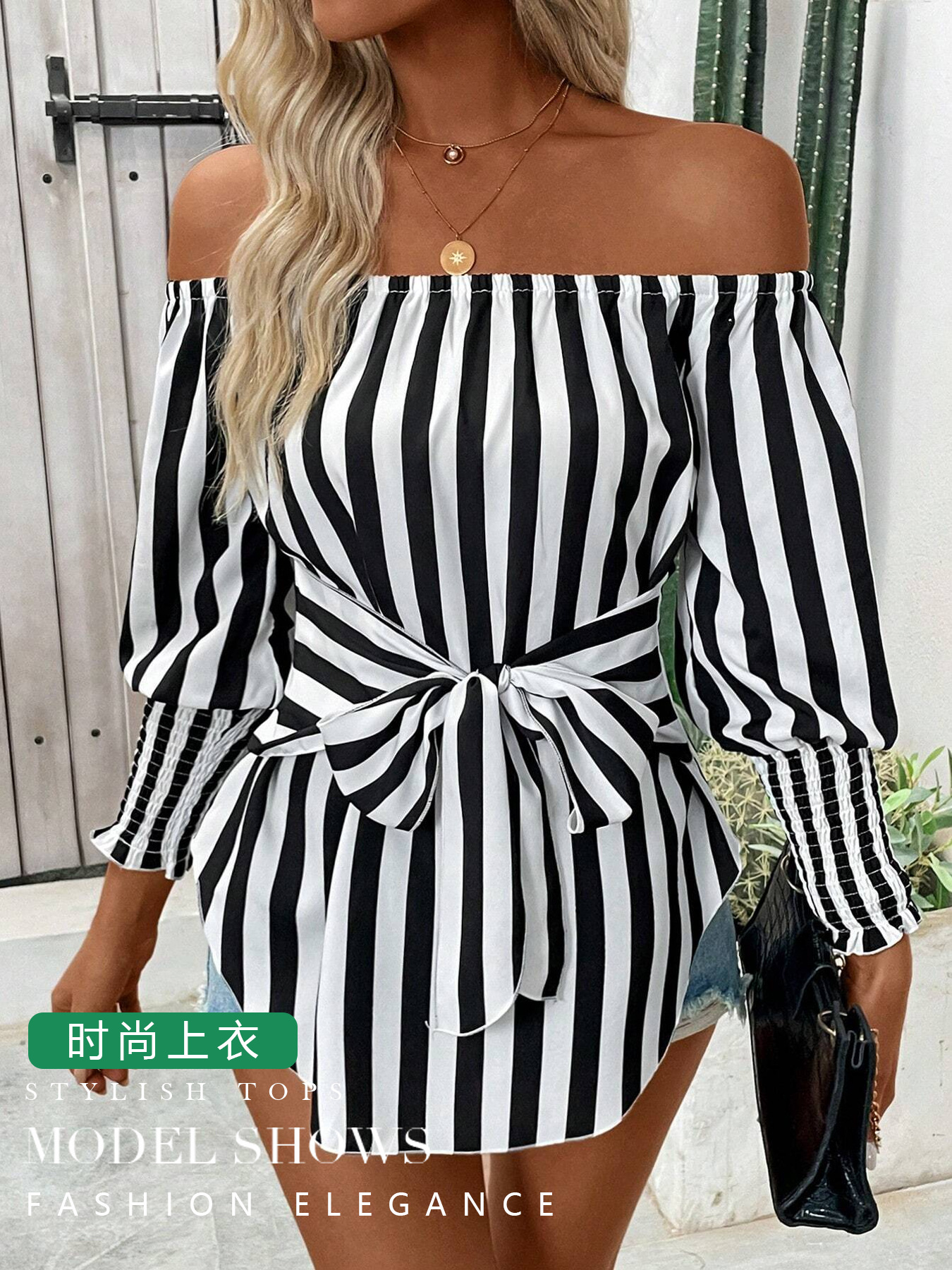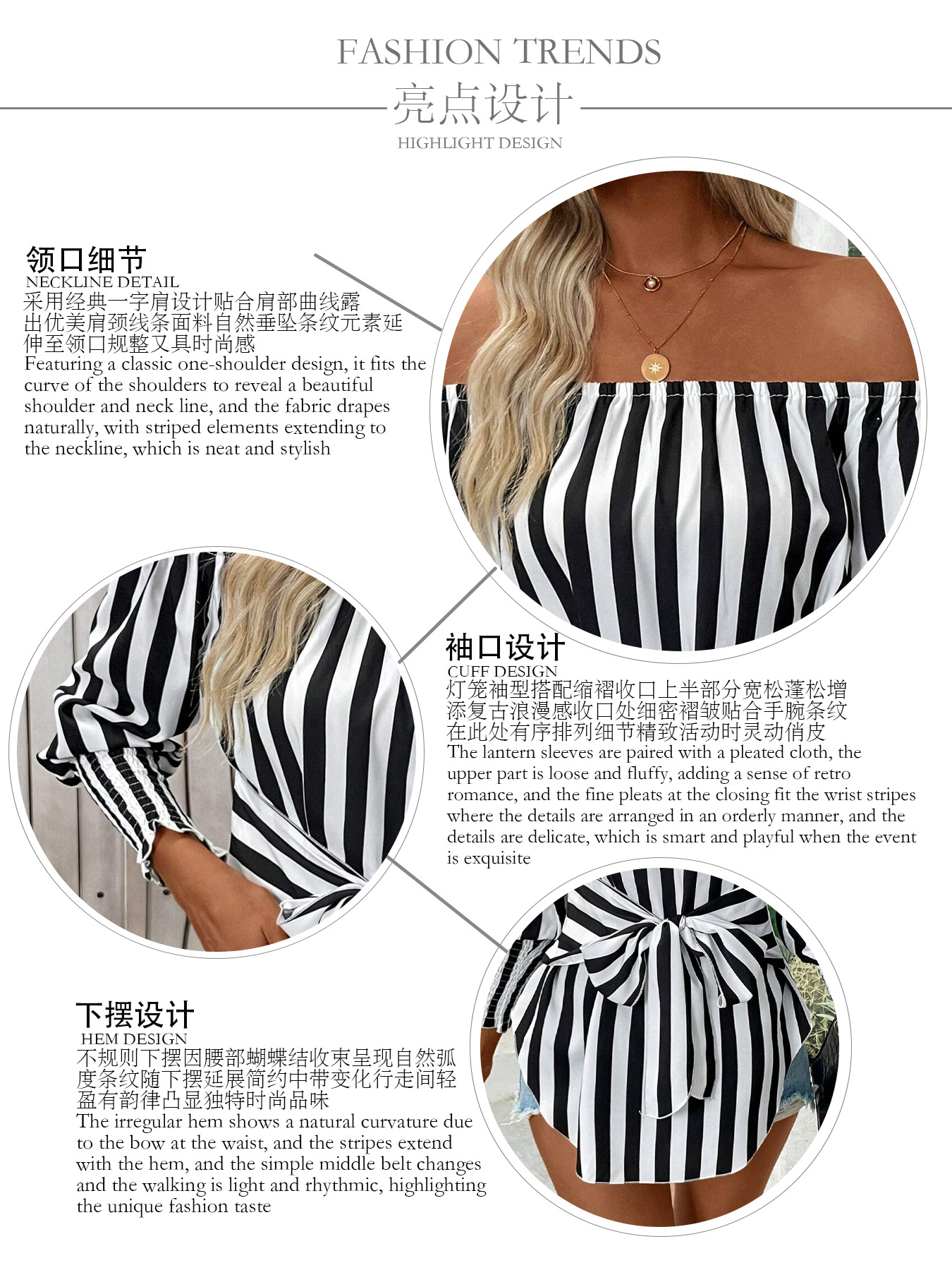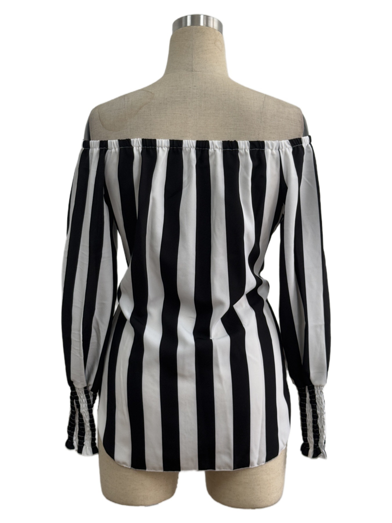 유럽 및 미국 해외직구 2025 신상 여성 패션 루즈핏 오프숄더 랜턴 슬리브 비대칭 밑단 스트라이프 셔츠스토어 가기