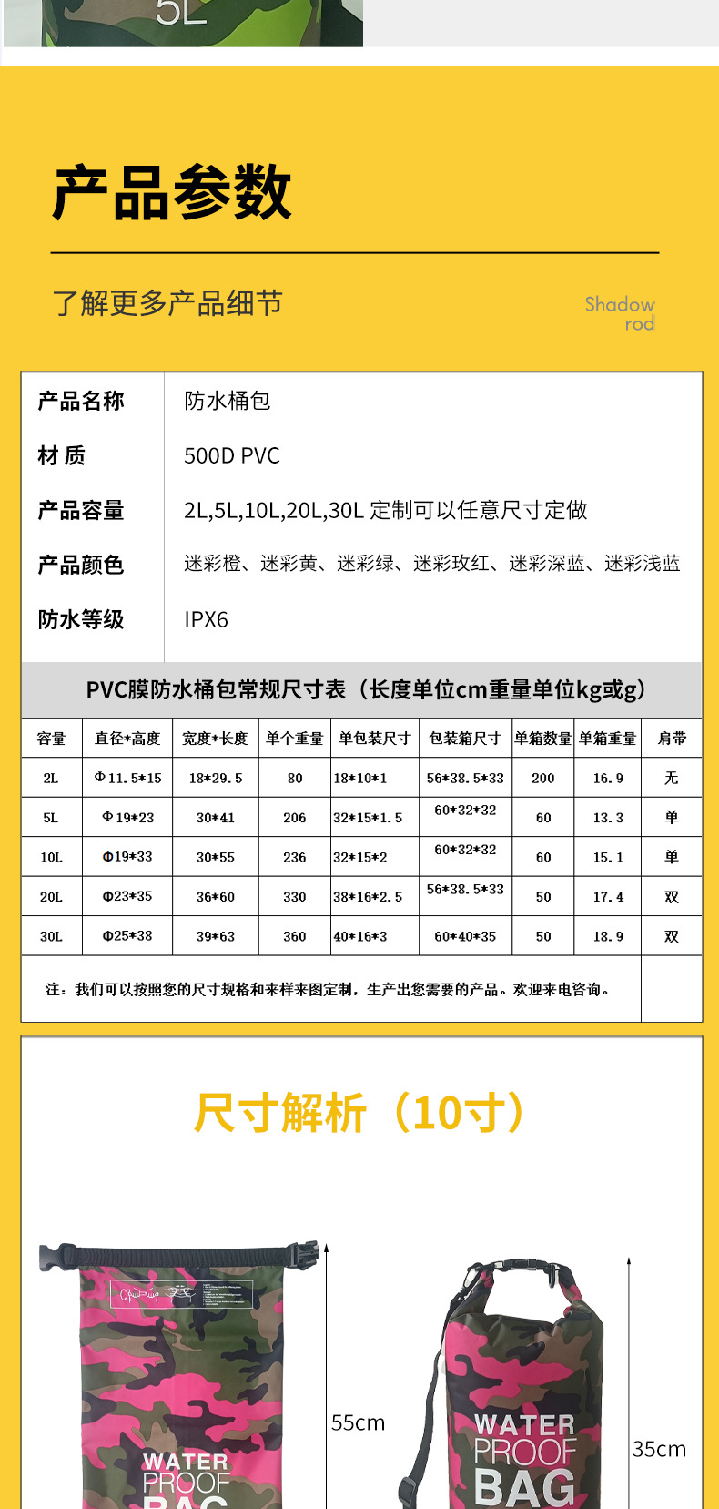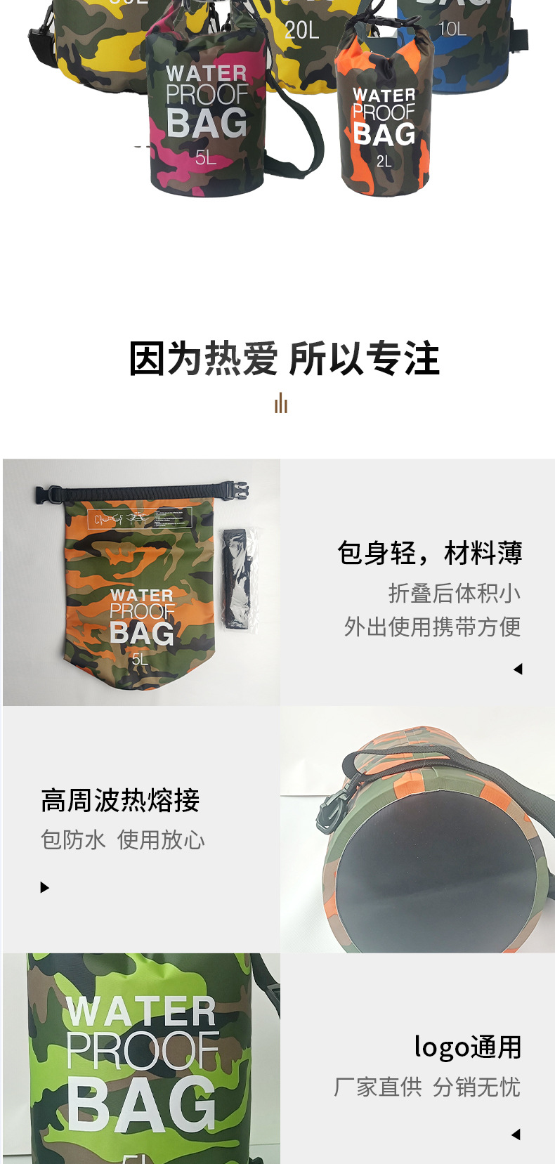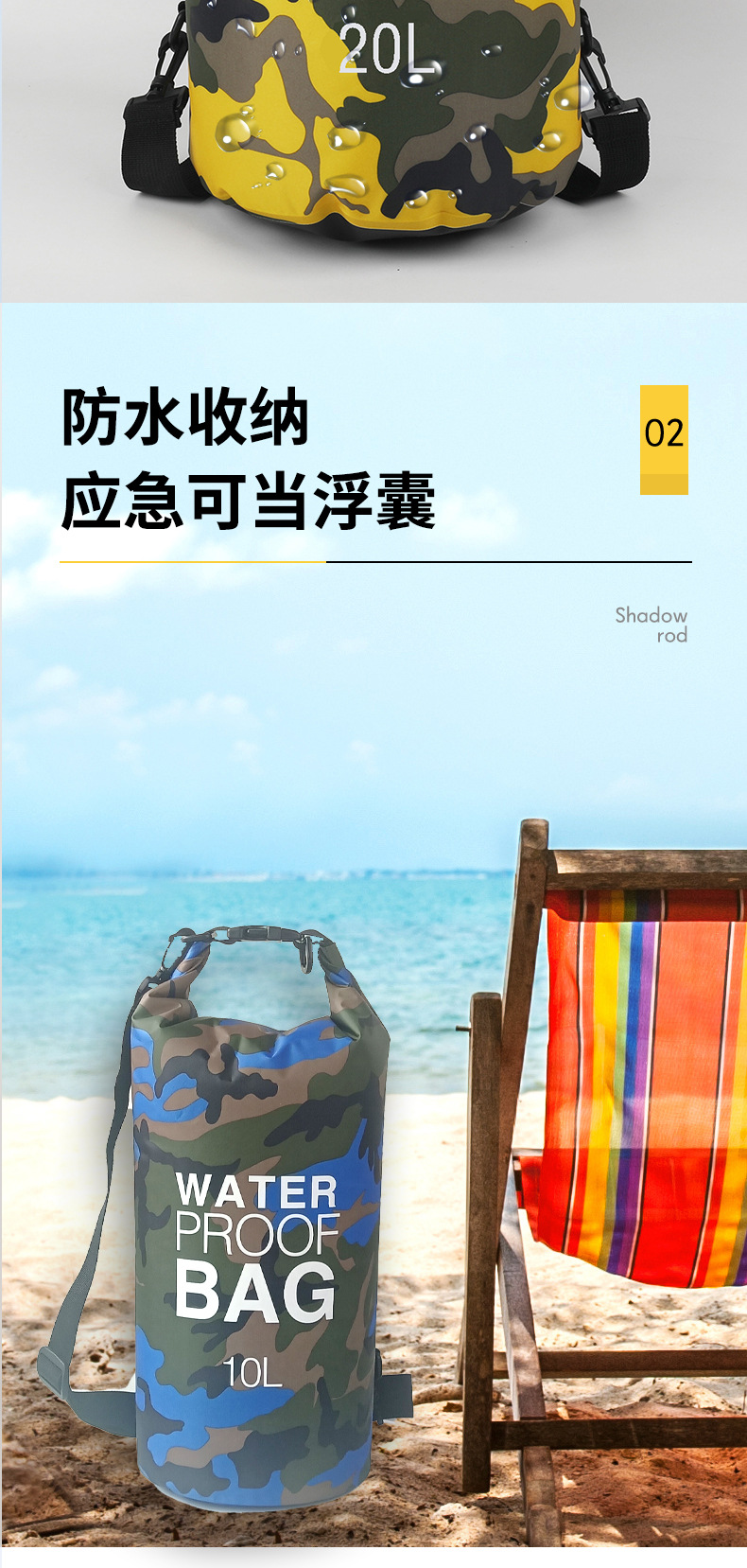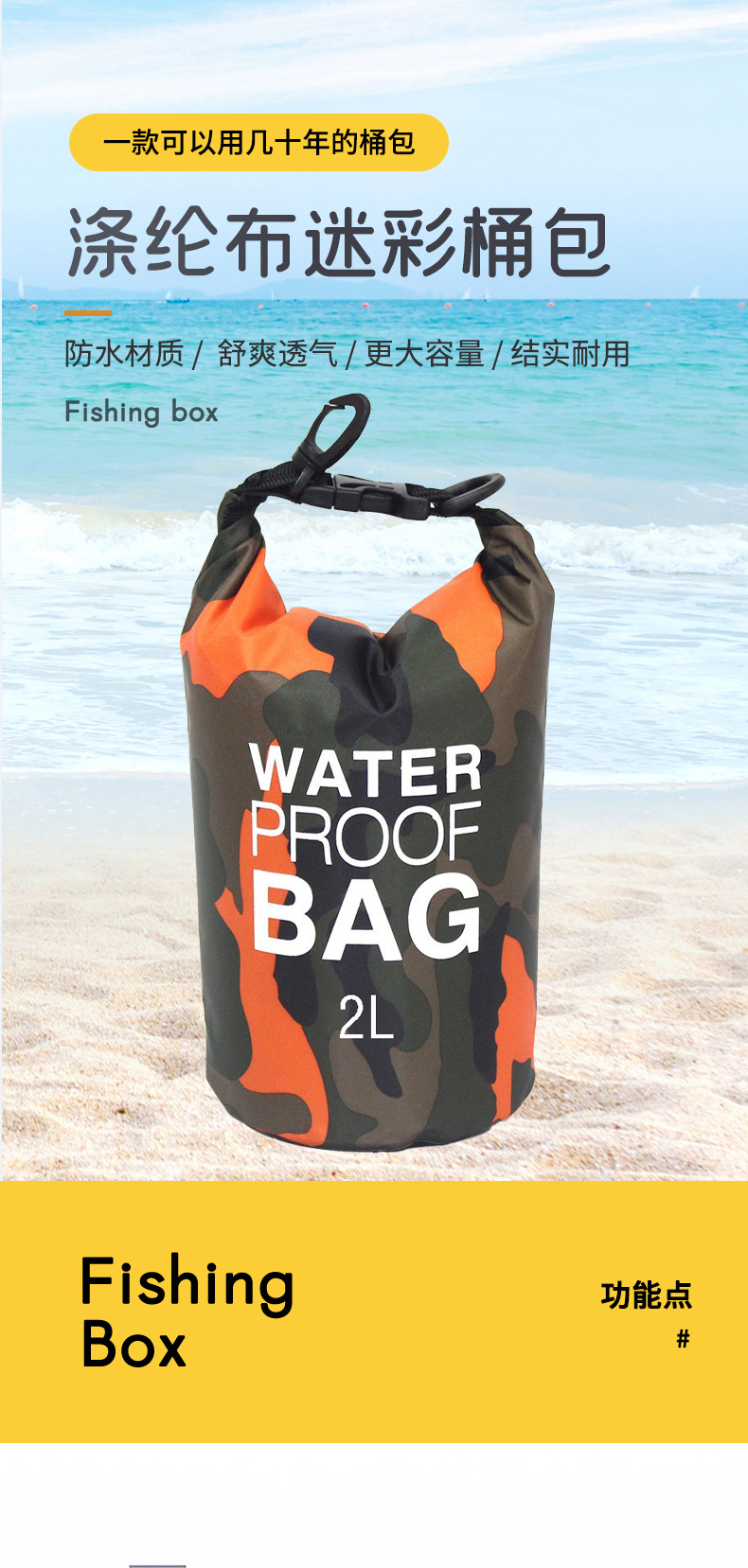 맞춤형 폴리에스터 천 위장 버킷 백, 야외 스포츠 비치 백, 인쇄 가능한 로고, 대용량 캐주얼 다이빙 방수 백
