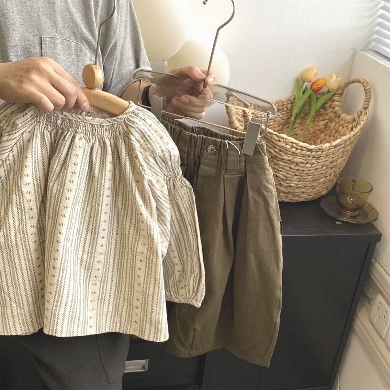 가을 2024 새로운 소녀 인형 셔츠 캐주얼 바지 세트 소녀 아기 줄무늬 셔츠 넓은 다리 바지 투피스 세트 트렌디스토어 가기