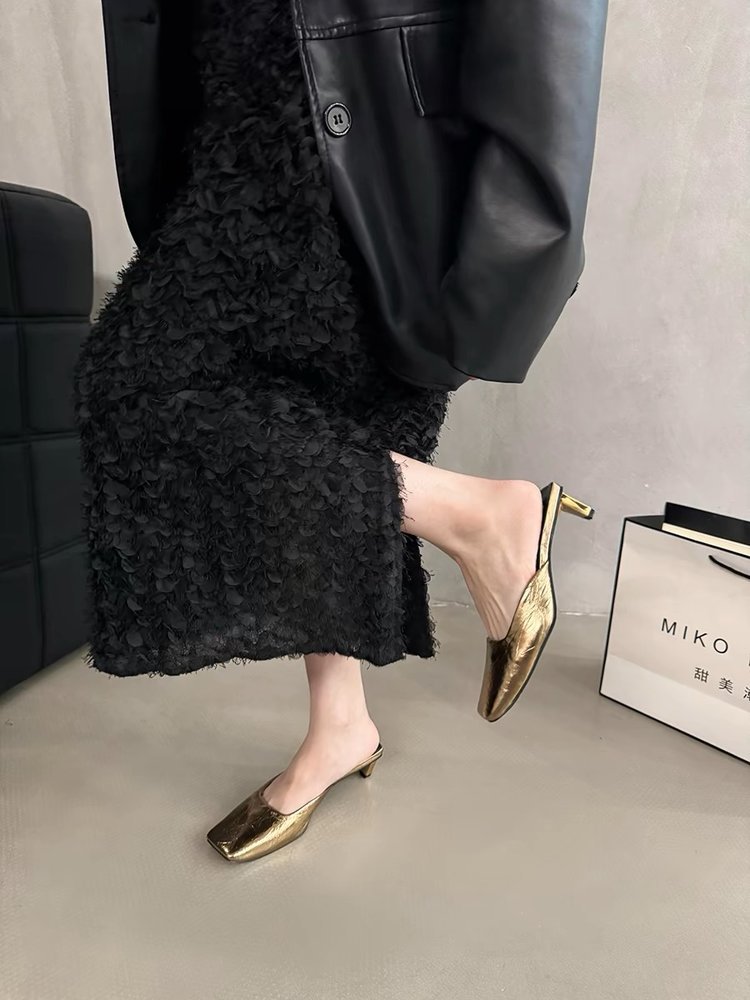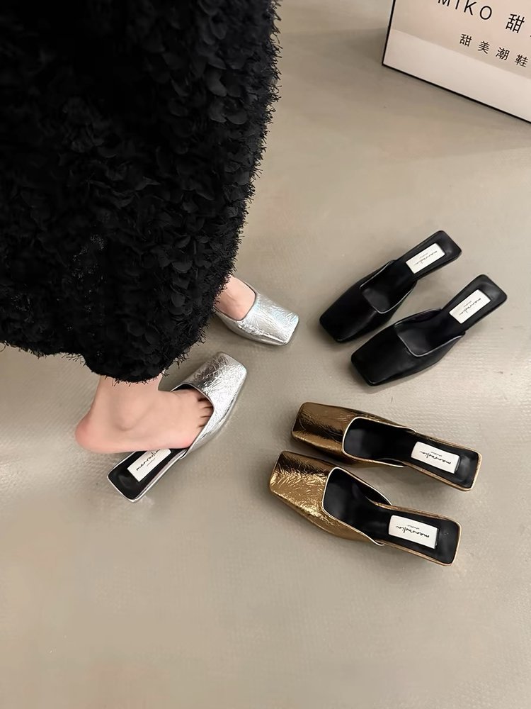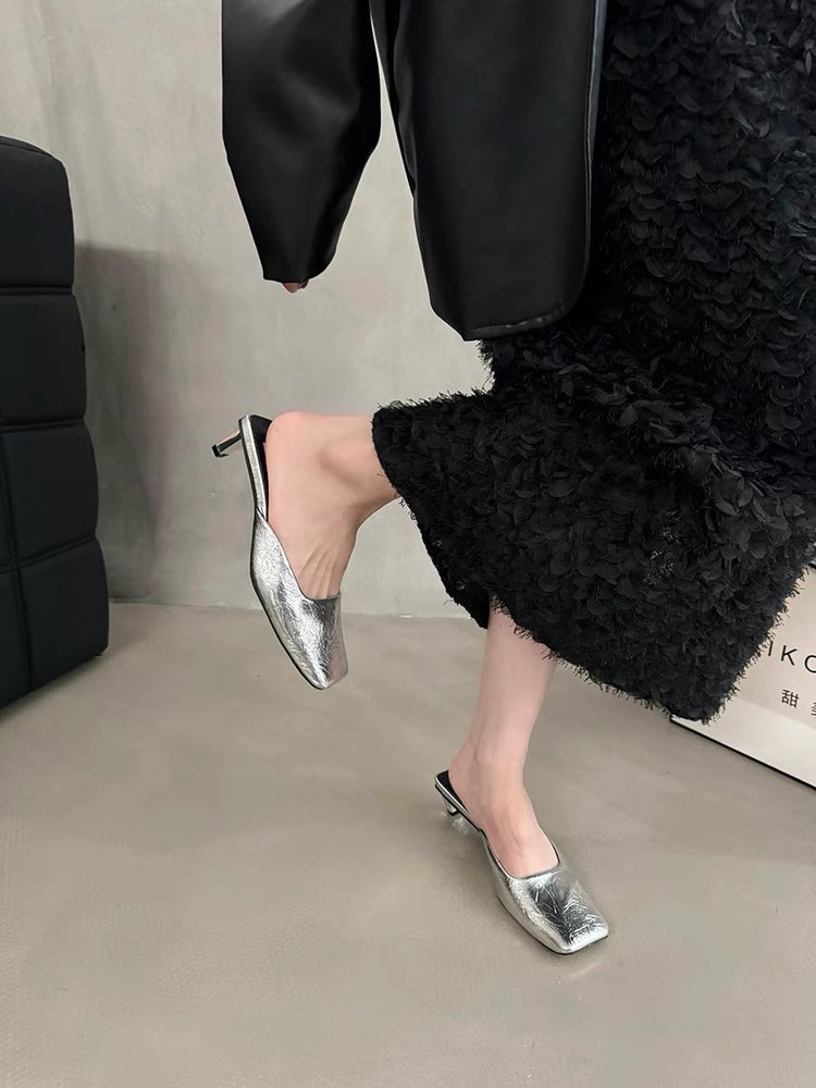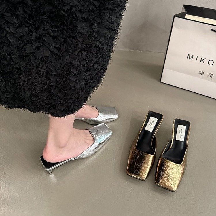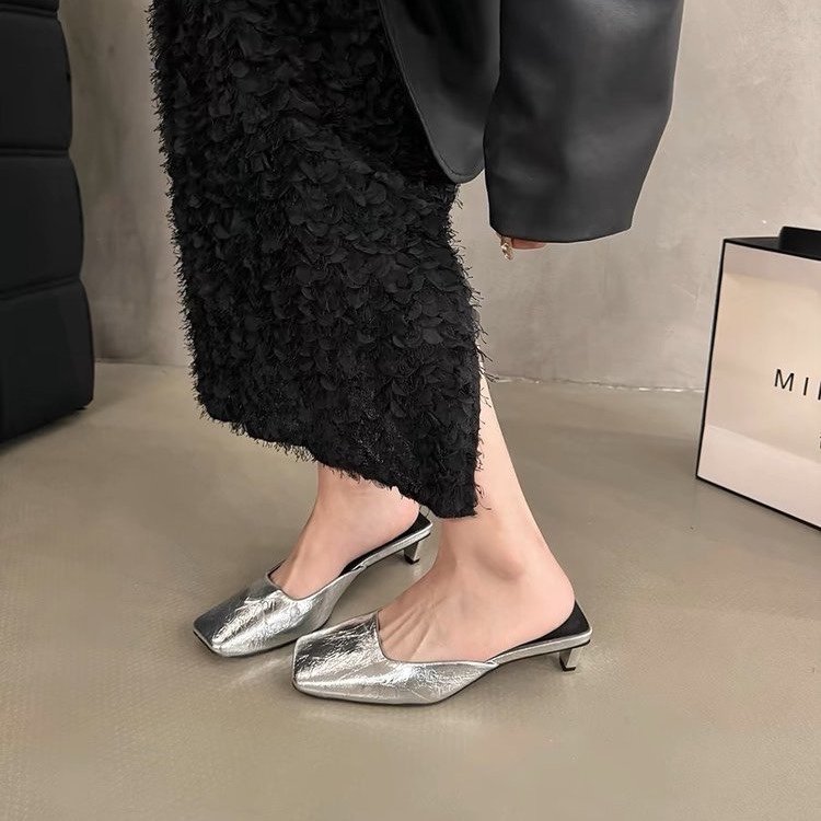 프랑스 스타일 스퀘어 발가락 우아한 실버 바오투 하프 드래그 외부 신발 2024 새로운 봄과 여름 늦은 저녁 낮은 발 뒤꿈치 싱글 신발