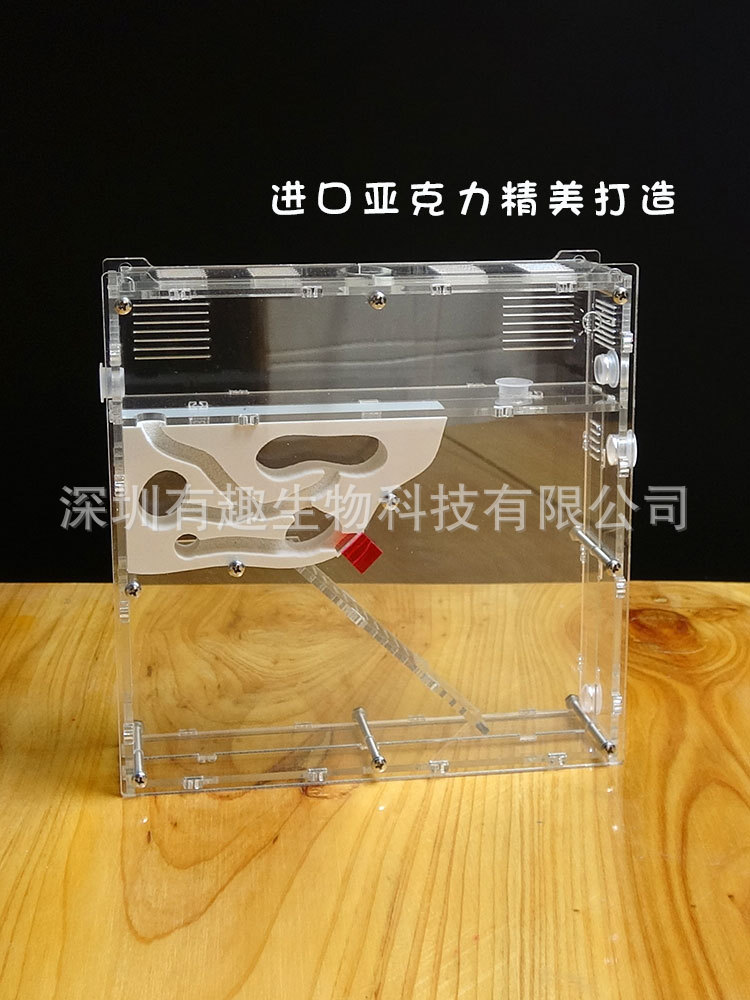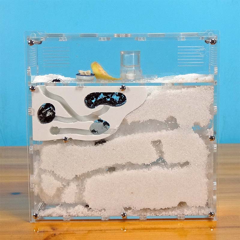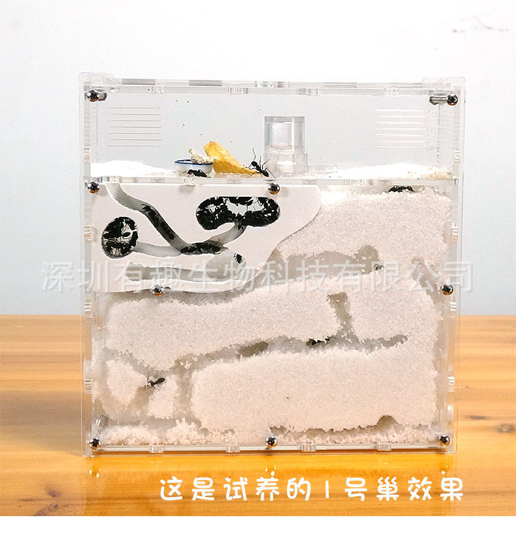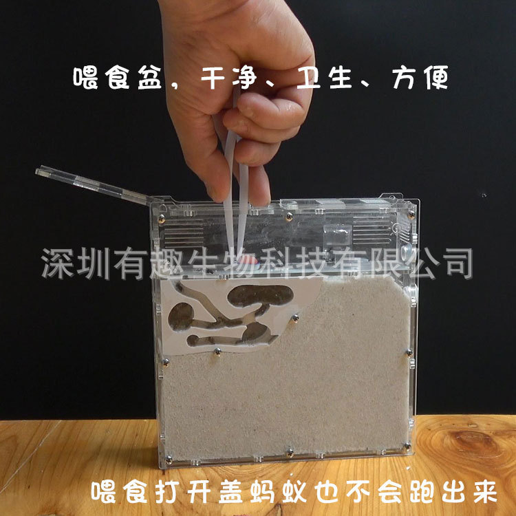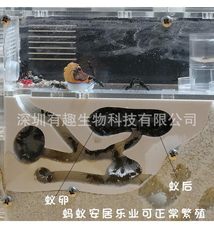 型蚂蚁饲养场——“蚂蚁城堡”。放几只蚂蚁进去,盖上盖子,宠物主人即可清楚地观看这些蚂蚁在干净的沙土里“打隧道”的有趣情景。利用放大镜,你甚至可以看清楚
