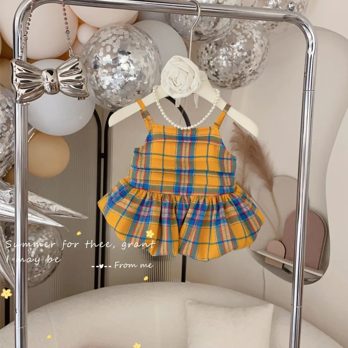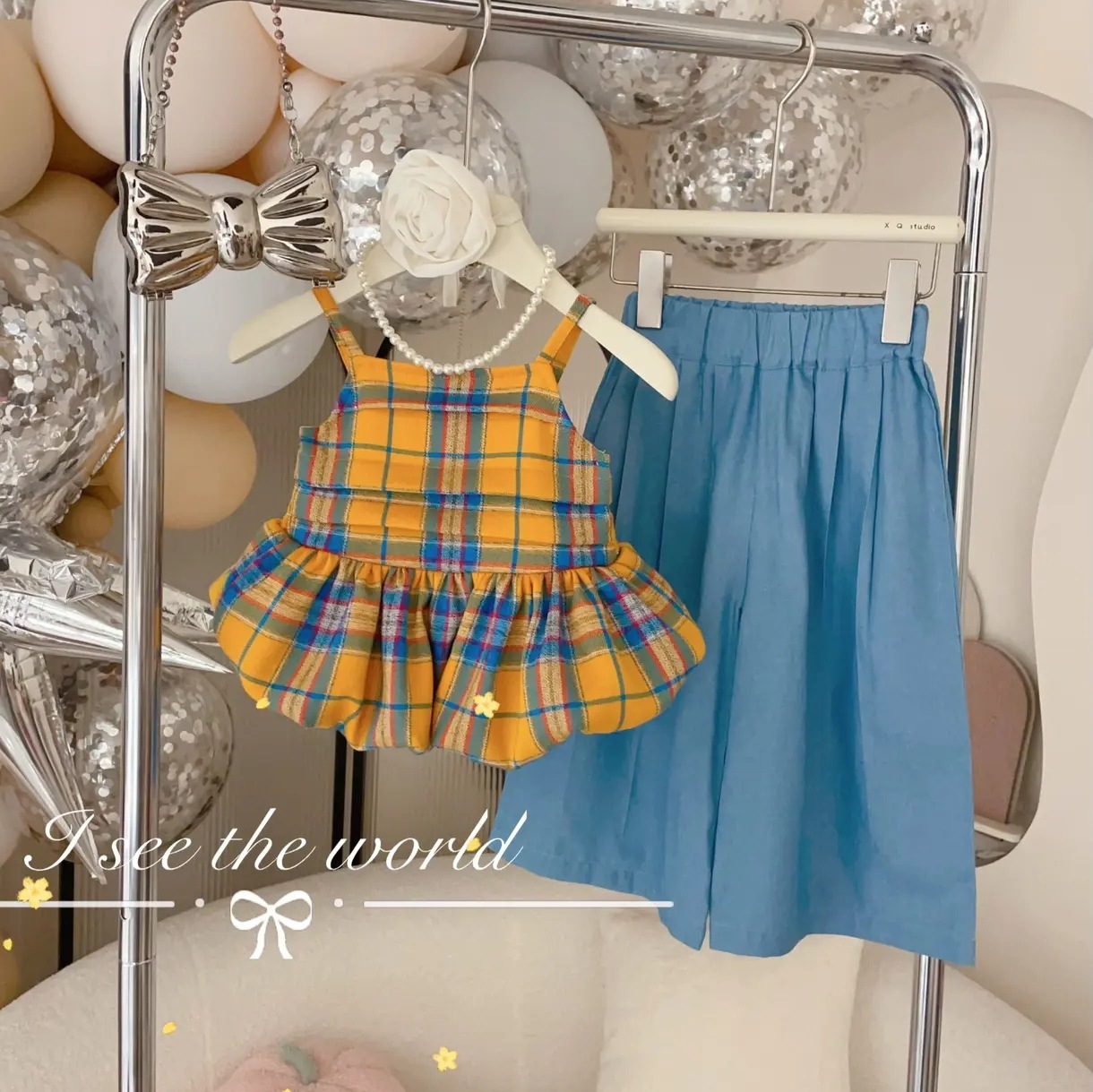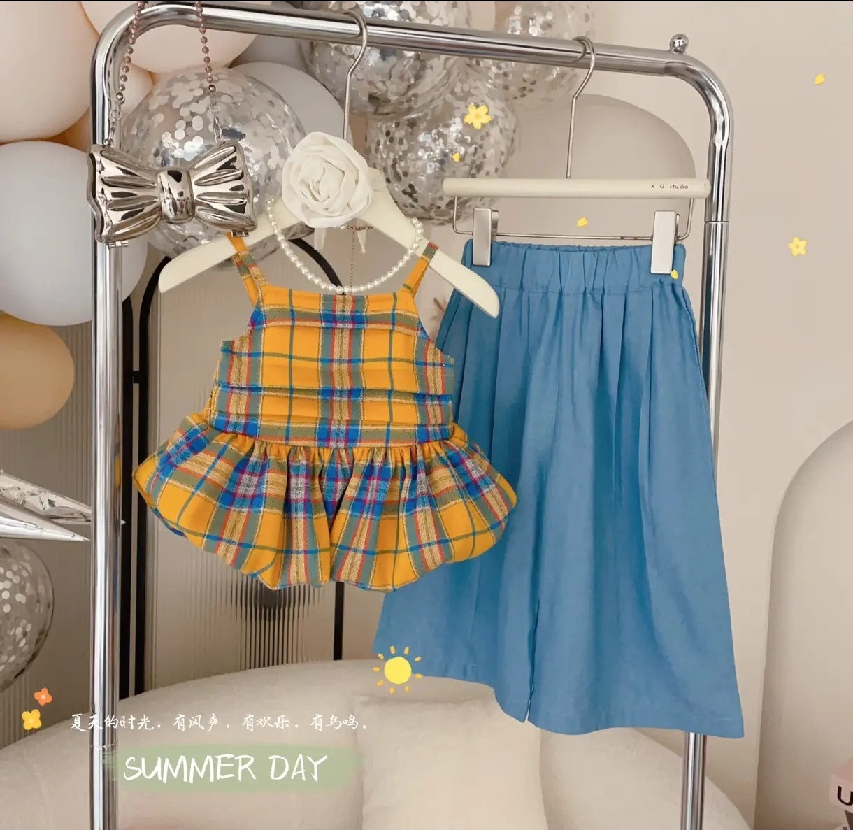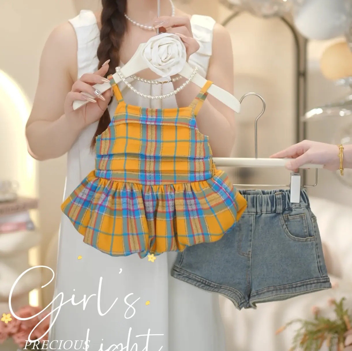 [핑크 집] 소녀 여름 격자 무늬 꽃 봉오리 세트 어린이 세련 된 세련된 반바지 투피스 얇은 세트스토어 가기