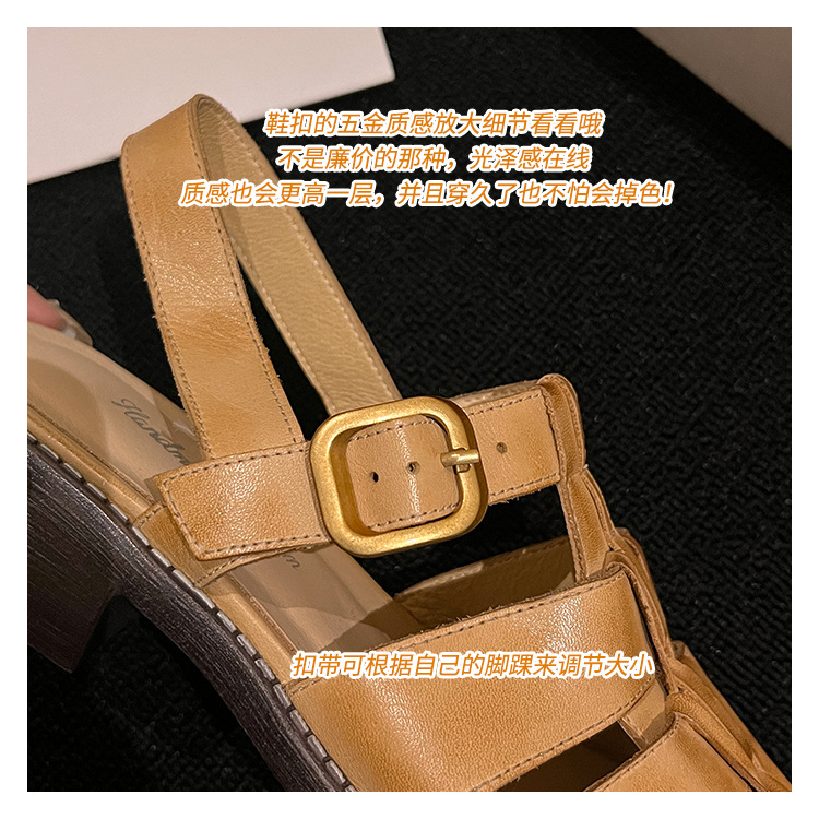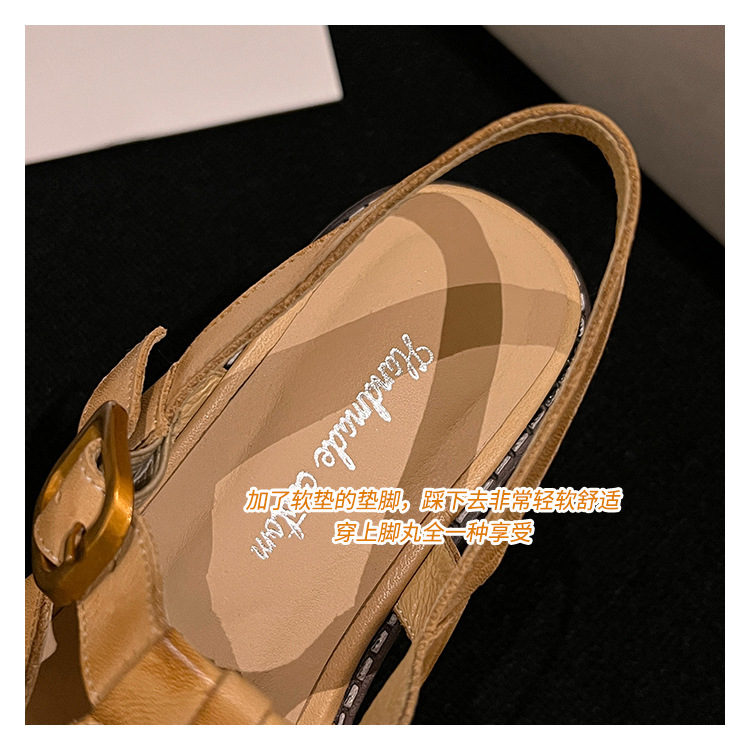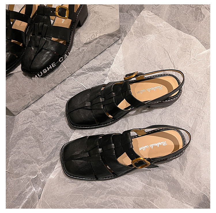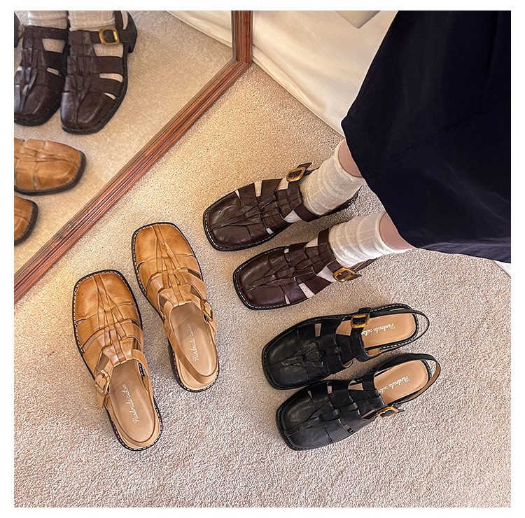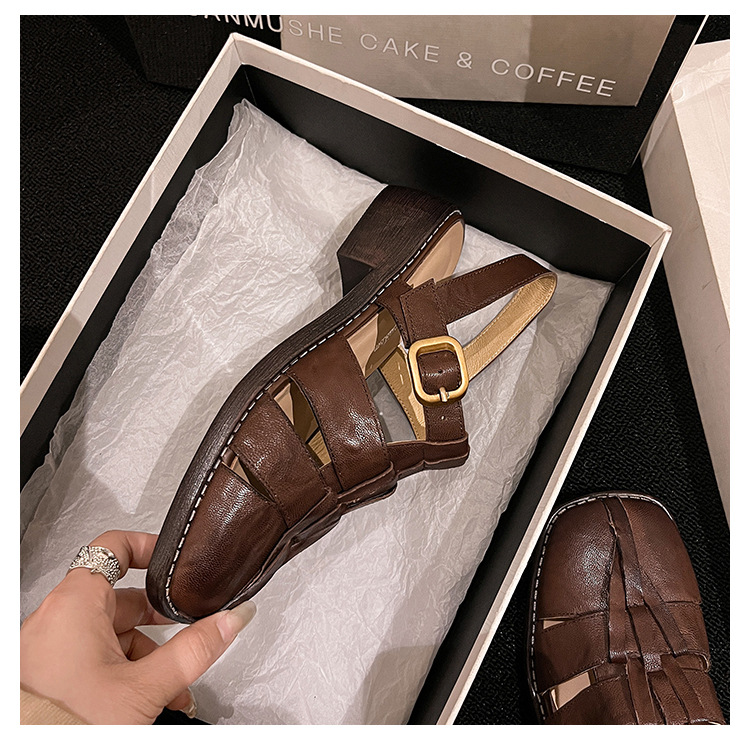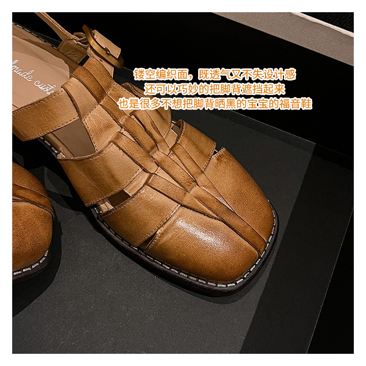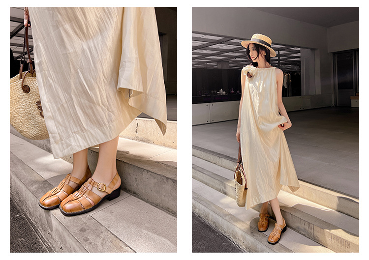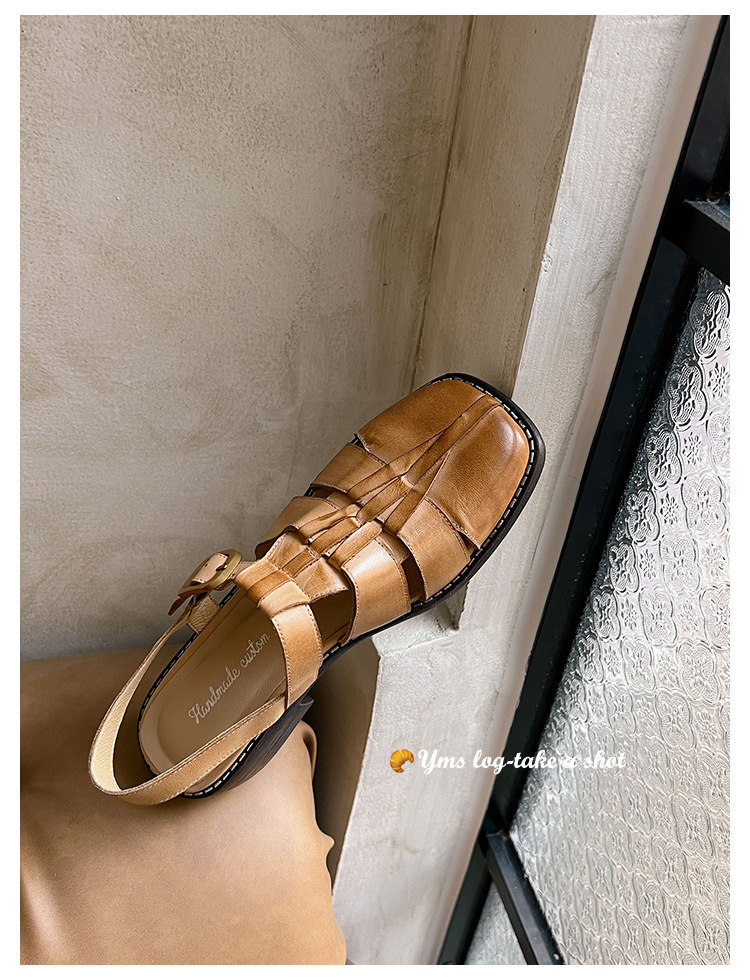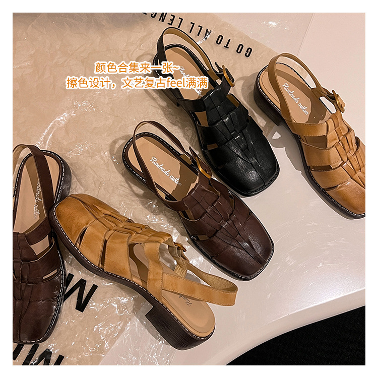 빈티지 할로우 발가락 샌들 여성용 여름 겉옷 양가죽 짠 돼지 케이지 슈즈 두꺼운 힐 미드 힐 두꺼운 소프트 솔 로마 신발스토어 가기
