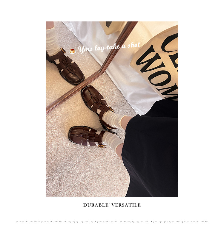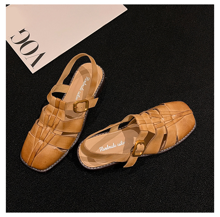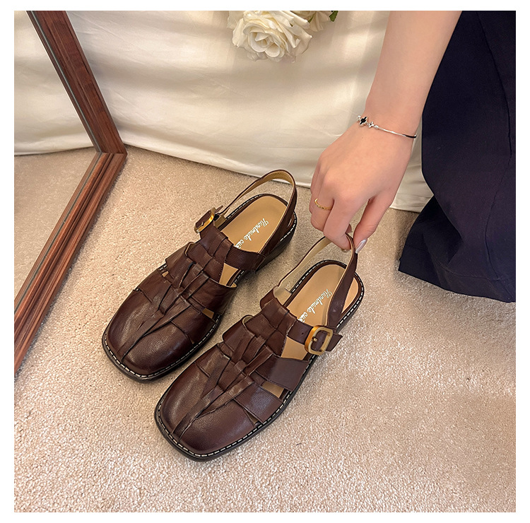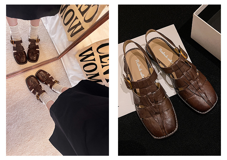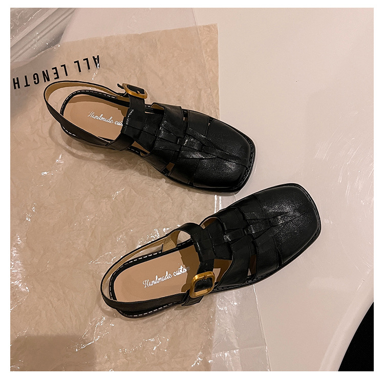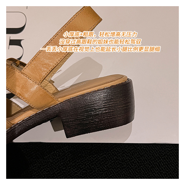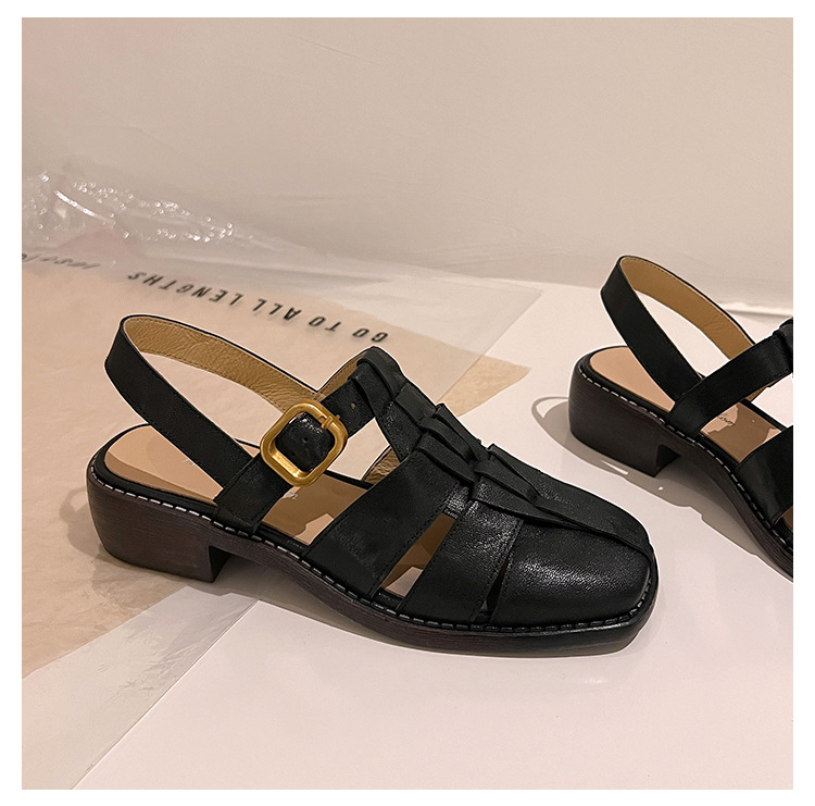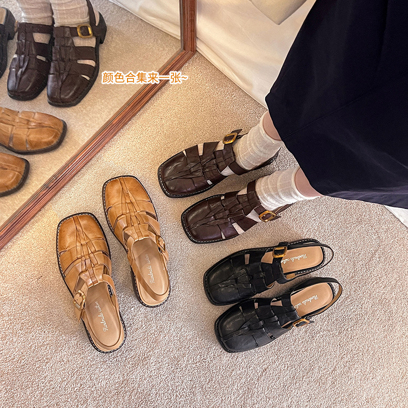 빈티지 할로우 발가락 샌들 여성용 여름 겉옷 양가죽 짠 돼지 케이지 슈즈 두꺼운 힐 미드 힐 두꺼운 소프트 솔 로마 신발스토어 가기