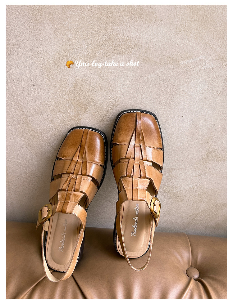 빈티지 할로우 발가락 샌들 여성용 여름 겉옷 양가죽 짠 돼지 케이지 슈즈 두꺼운 힐 미드 힐 두꺼운 소프트 솔 로마 신발