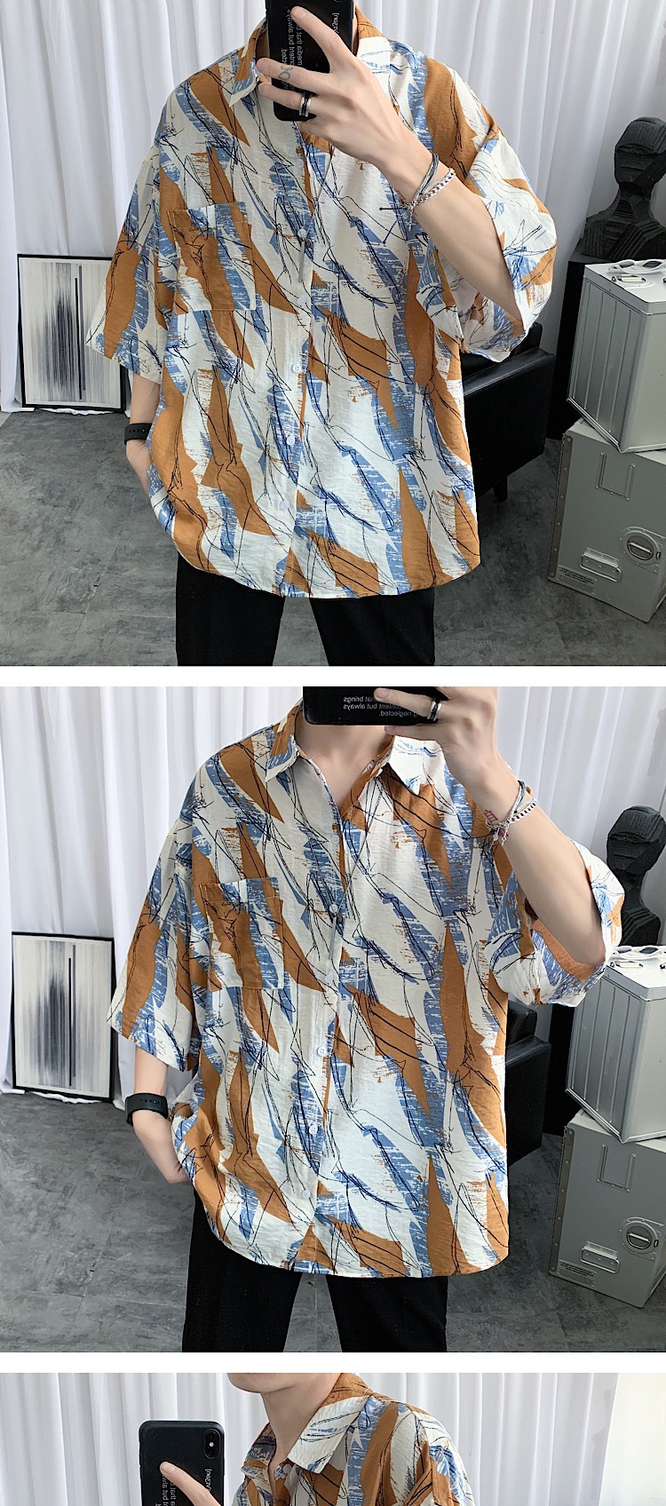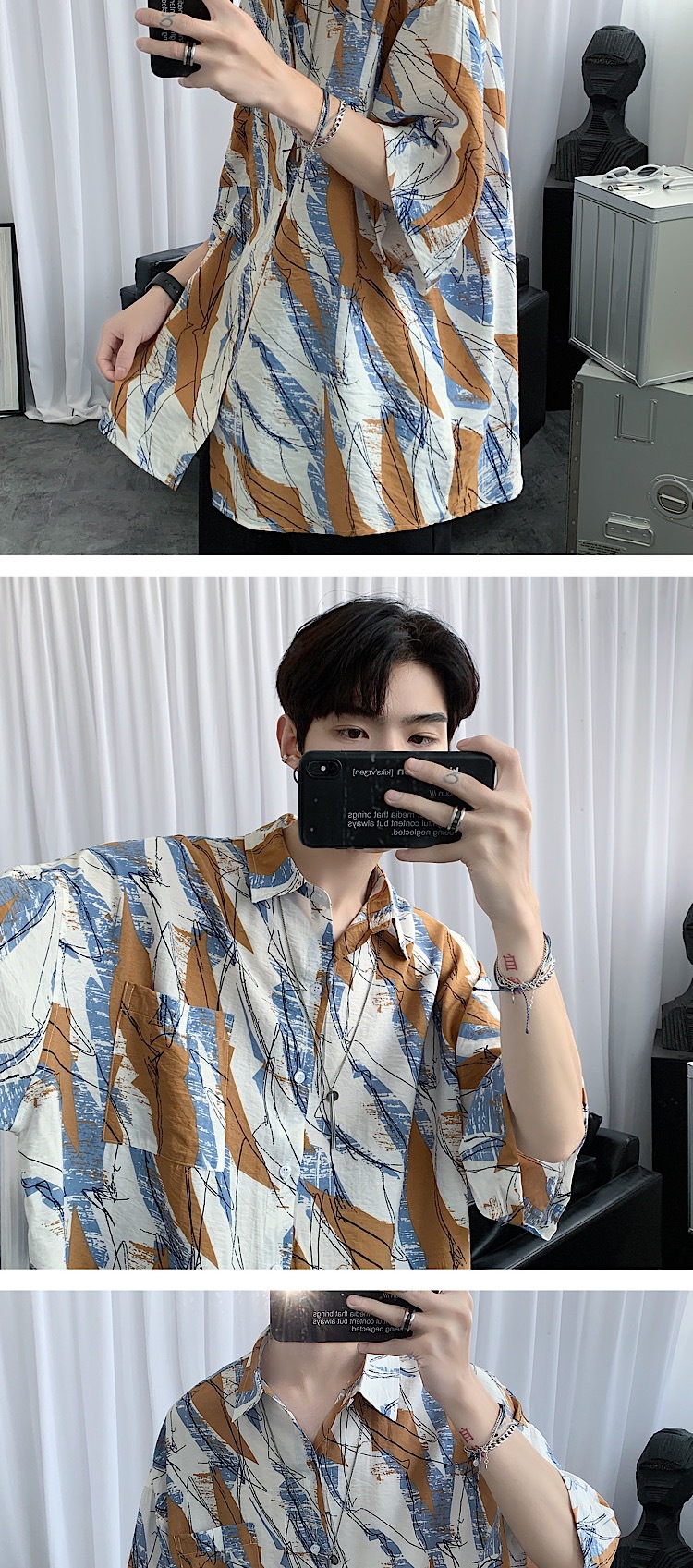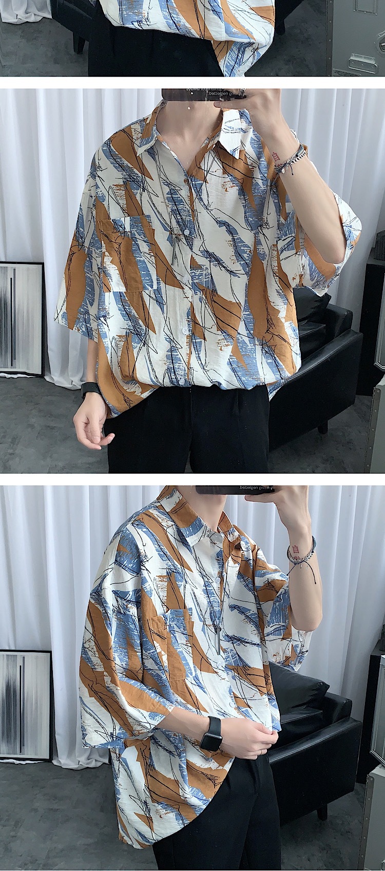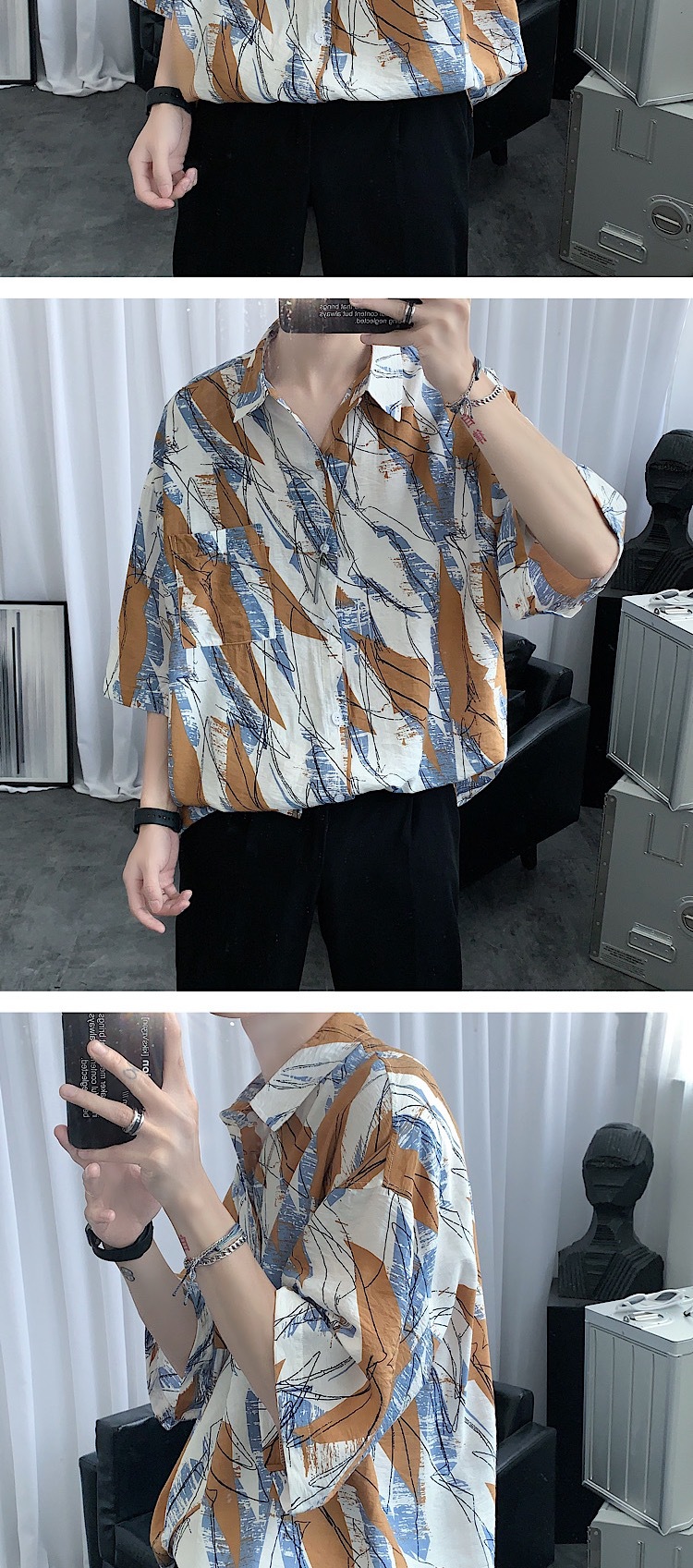 2024 년 여름 트렌디 셔츠 남자 루즈 탑 올매치 독특한 반팔 셔츠 남자 한국식 얇은 셔츠스토어 가기