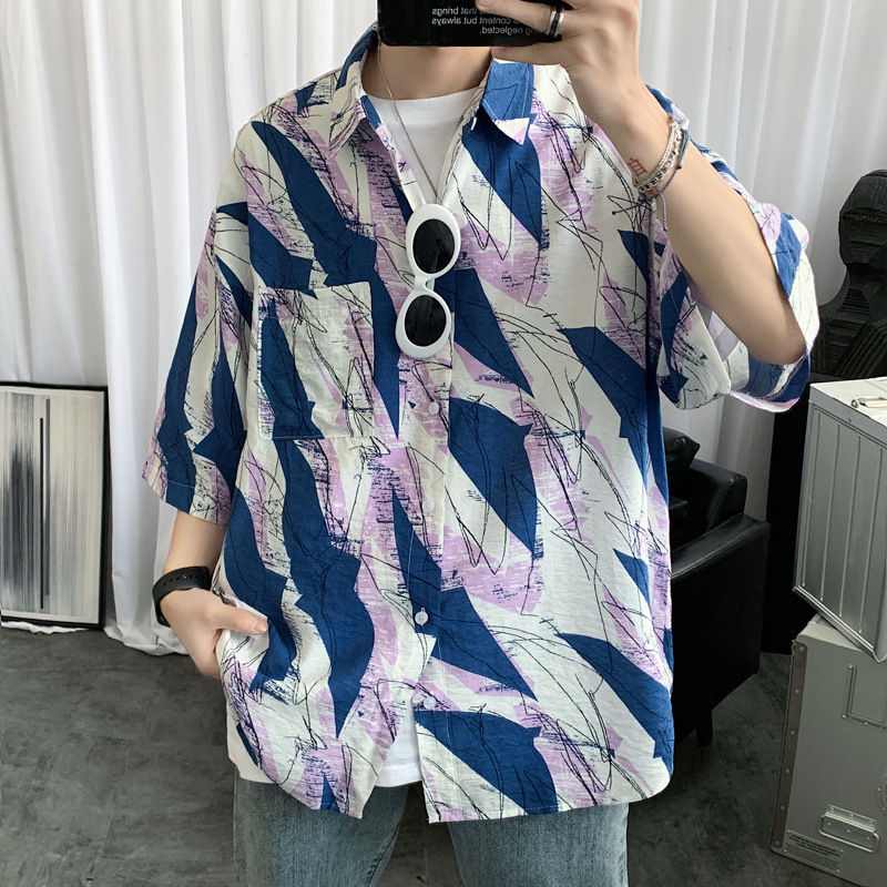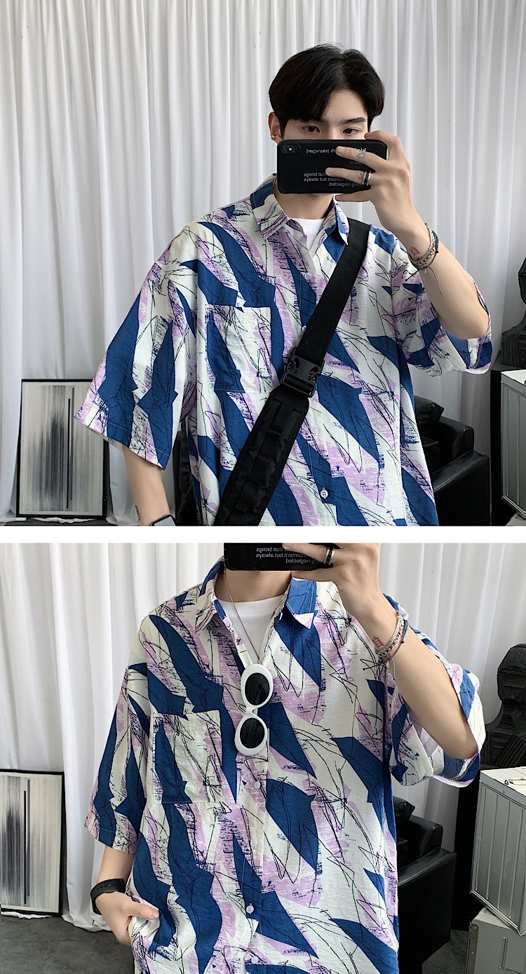 2024 년 여름 트렌디 셔츠 남자 루즈 탑 올매치 독특한 반팔 셔츠 남자 한국식 얇은 셔츠