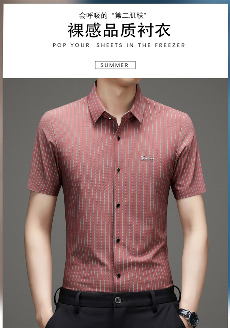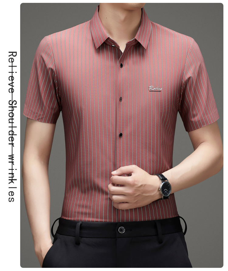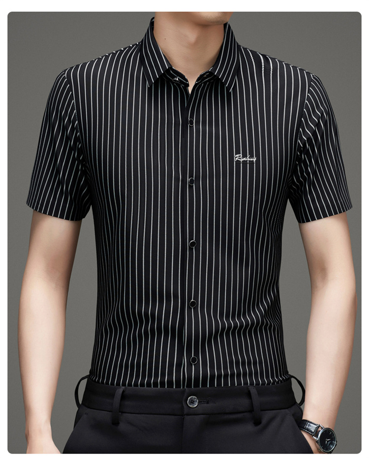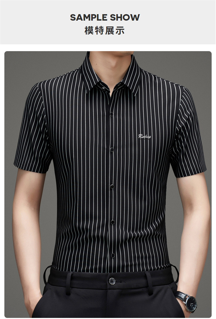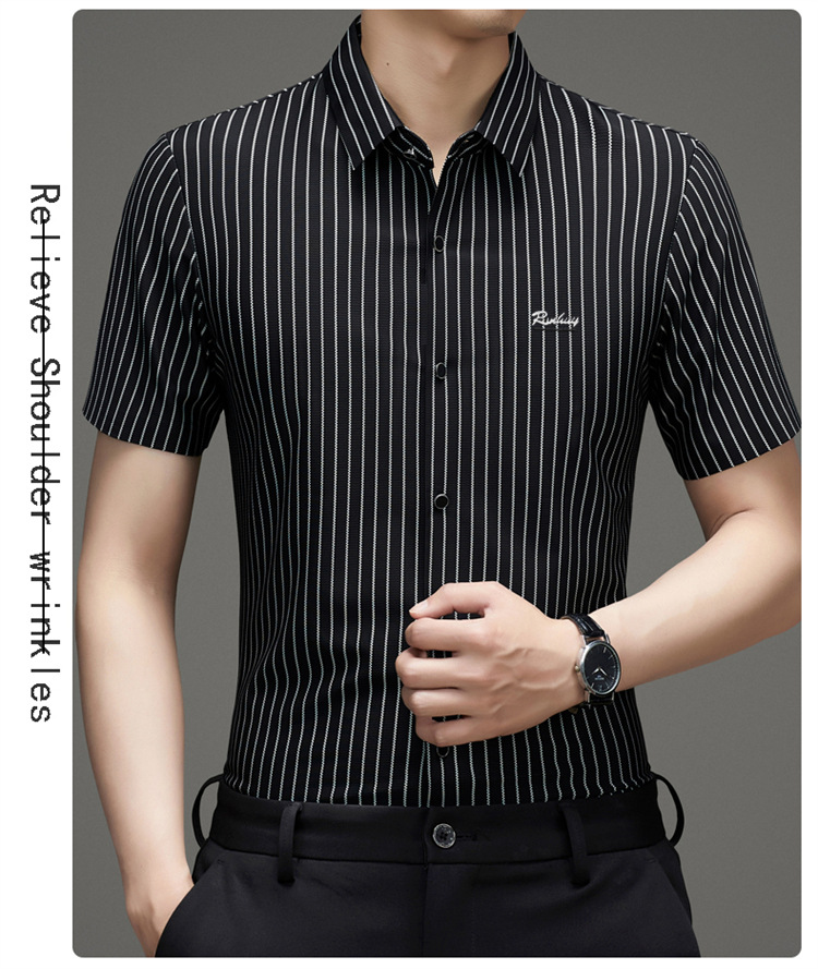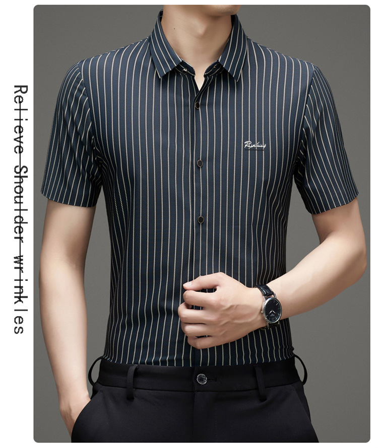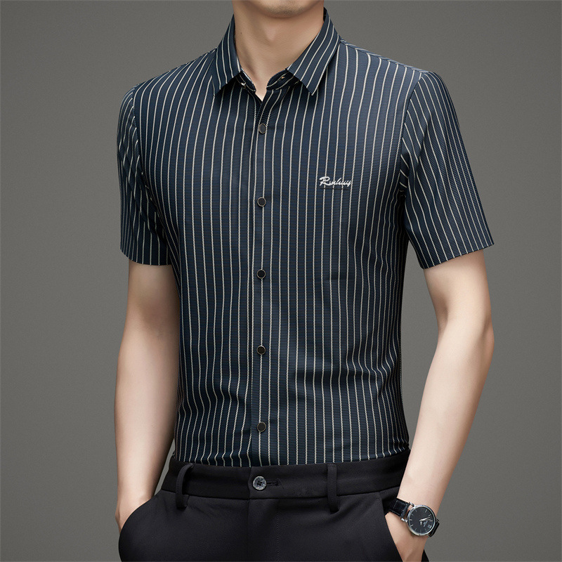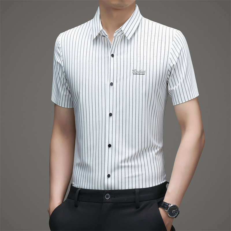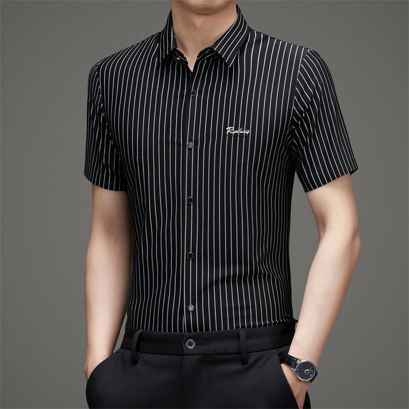 하이 엔드 남성 청소년 새로운 원활한 핫 스탬핑 스트라이프 셔츠 옷깃 짧은 소매 여름 비즈니스 캐주얼 패션 셔츠 조수