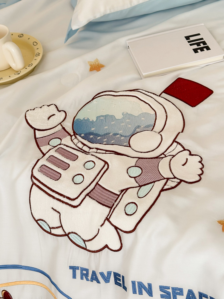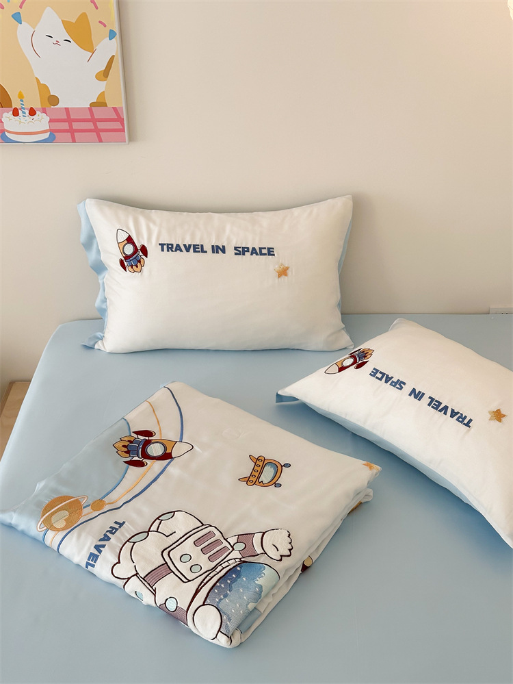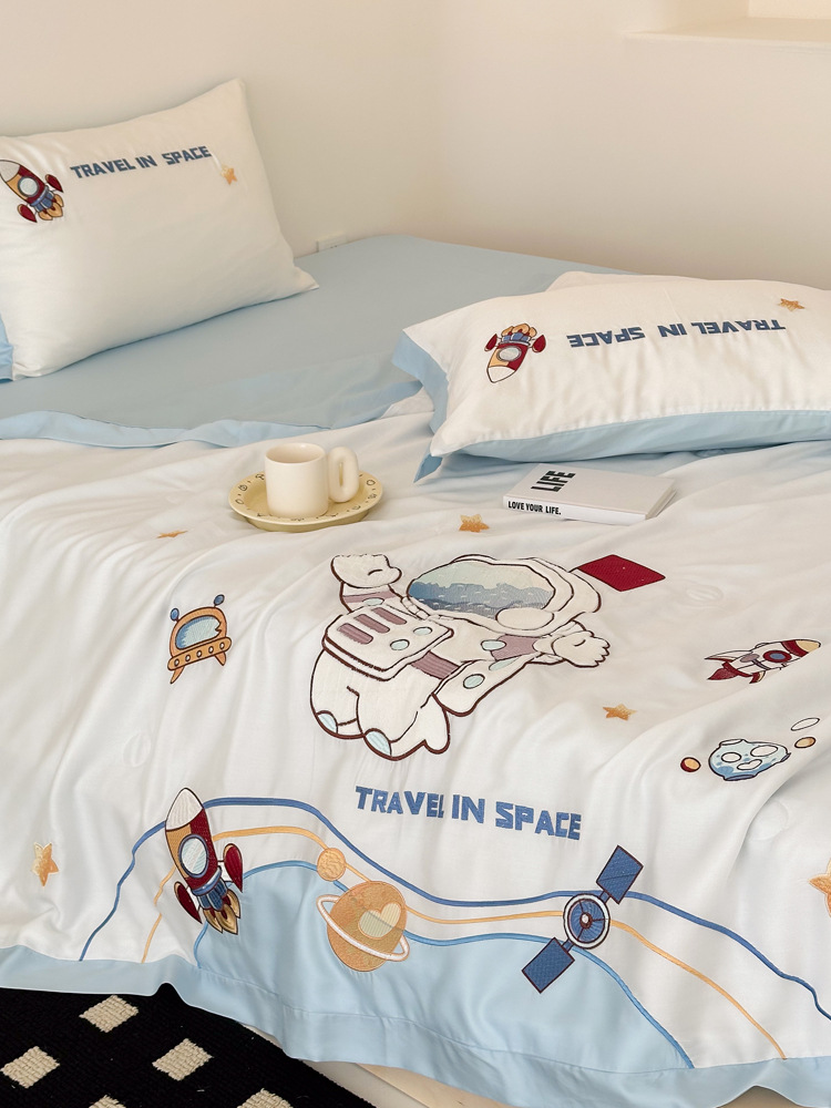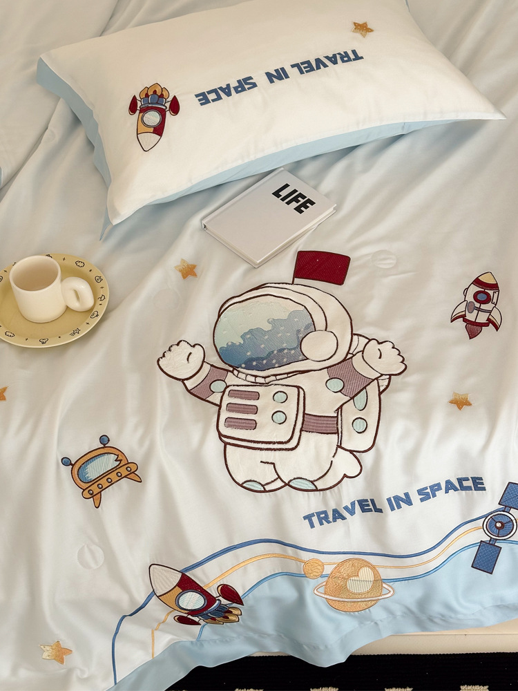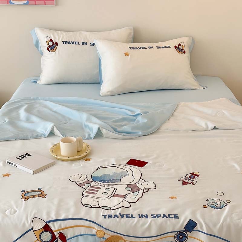 만화 우주 비행사 수 놓은 어린이 여름 퀼트 4 피스 세트 60 텐셀 여름 쿨 퀼트 세척 가능한 에어컨 퀼트 얇은 퀼트스토어 가기