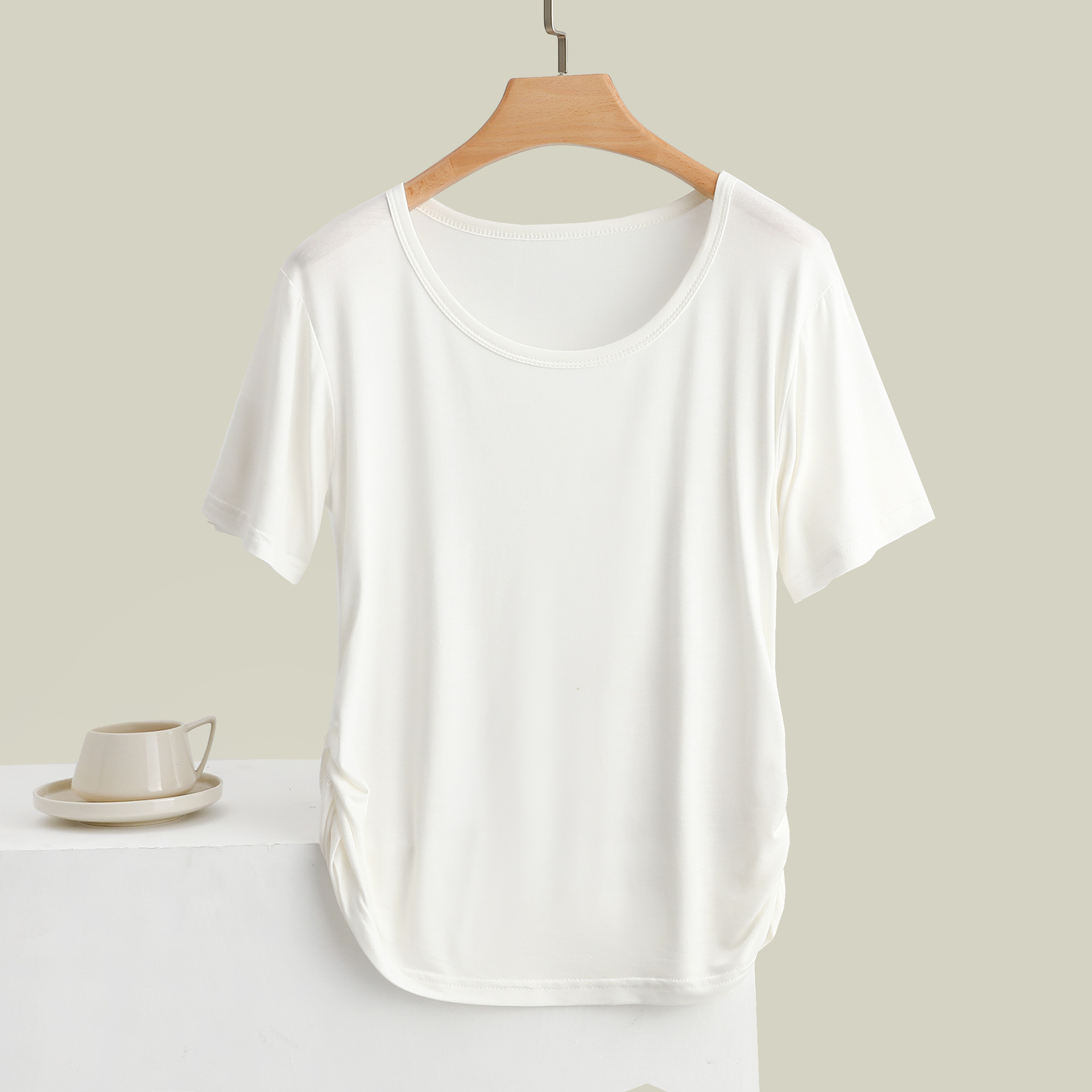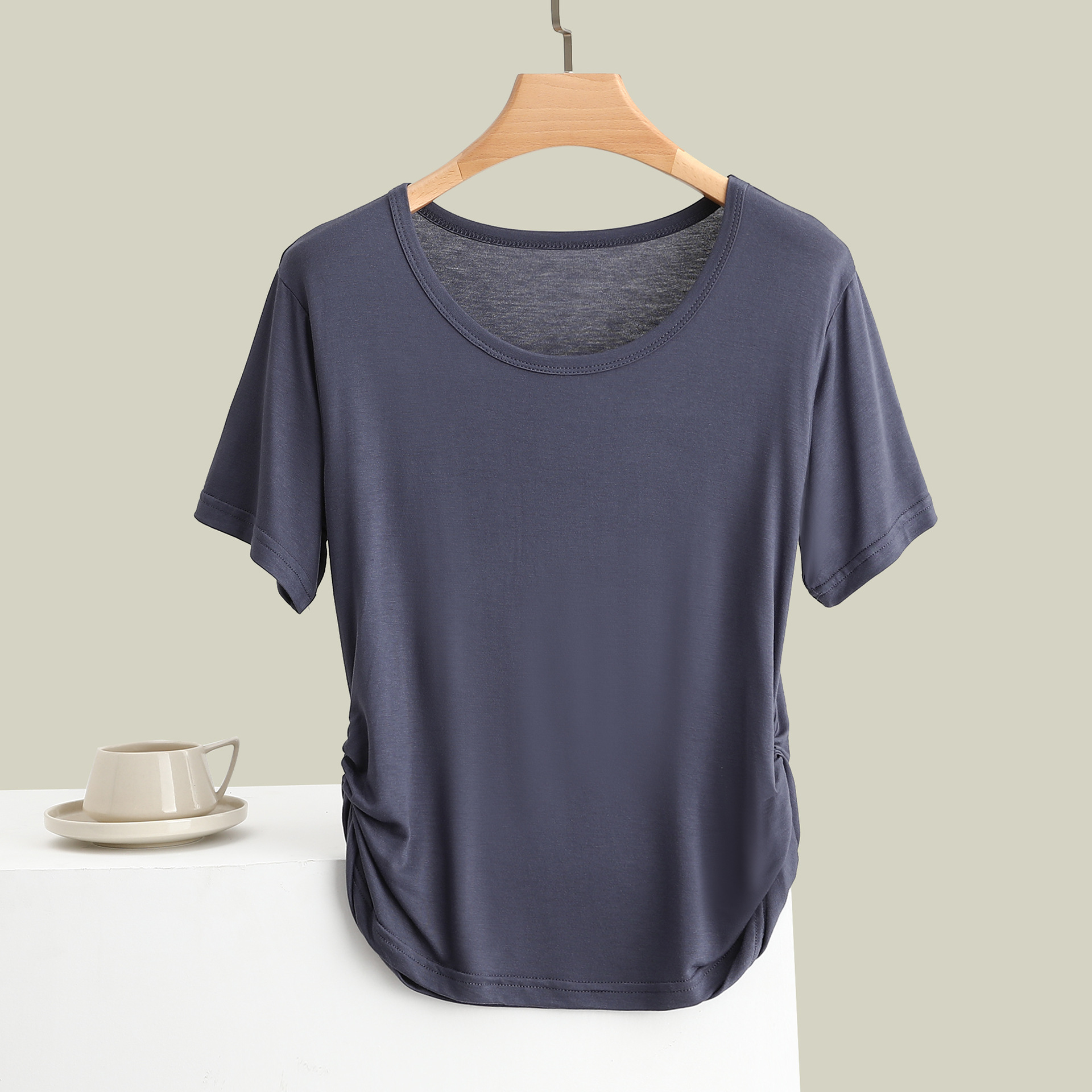 여름 모달 크루 넥 반팔베이스 셔츠 사이드 드로우 허리 슬리밍 스트레치 티셔츠 패셔블 올 매치 여자 탑스토어 가기