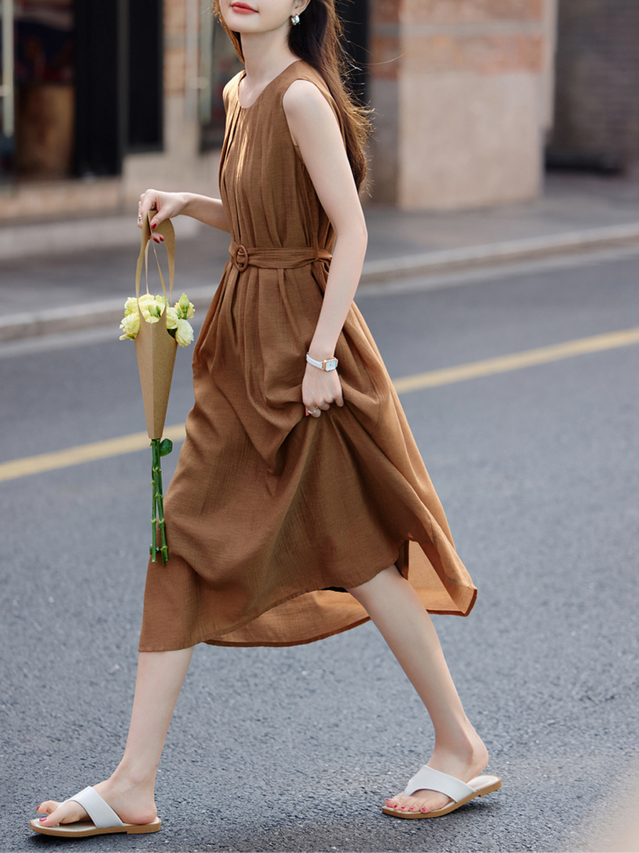 고급 감각 오라 레이스 허리 원피스 2024 여름 새로운 둥근 목 주름 A 자형 원피스스토어 가기