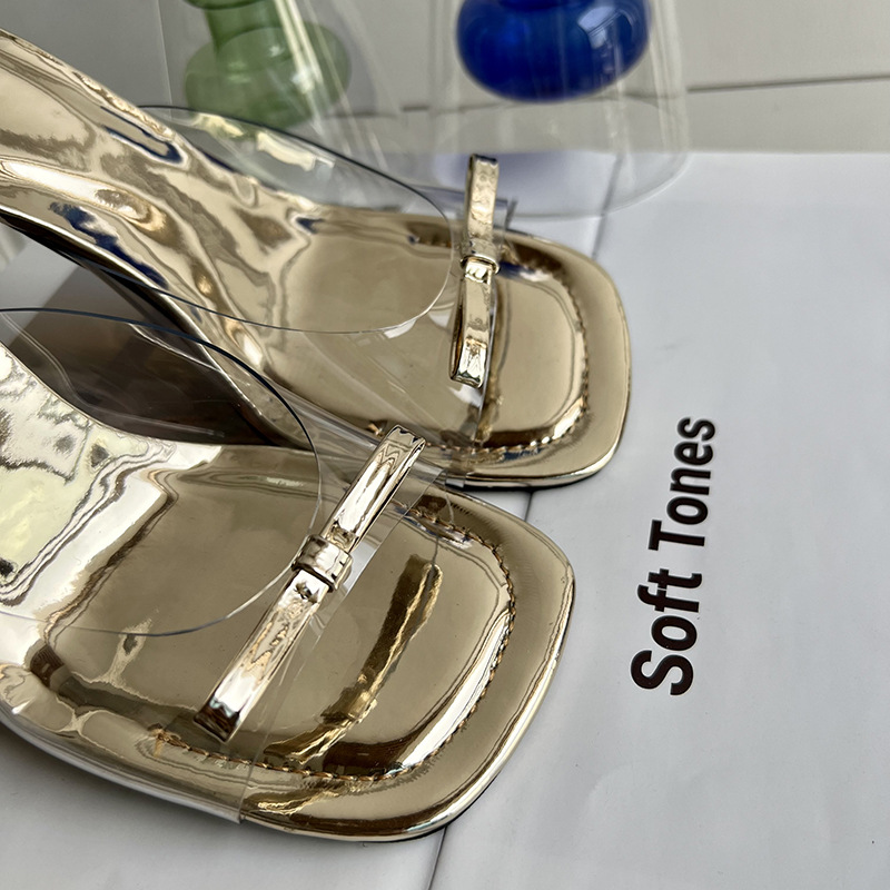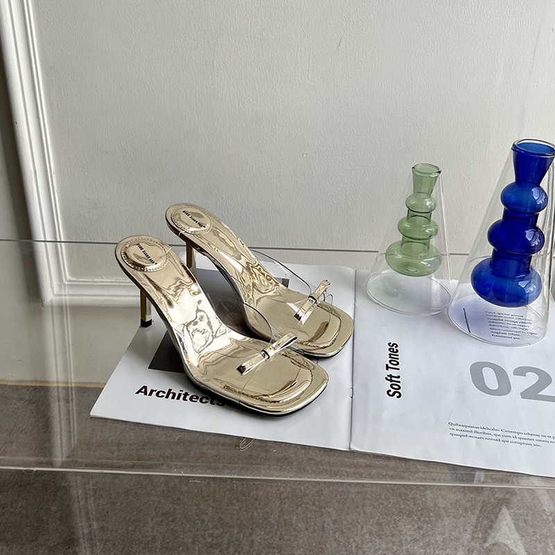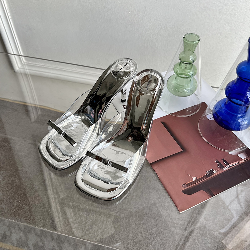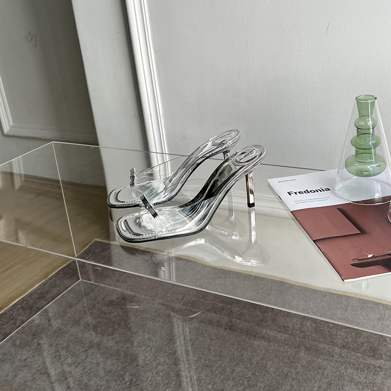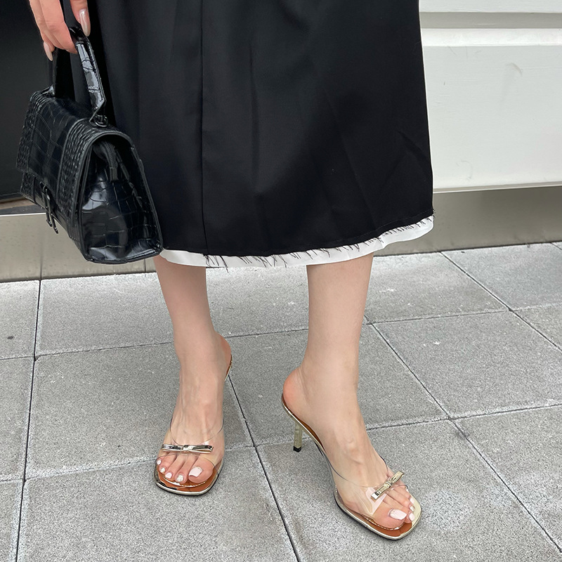 하이힐 샌들 하이 엔드 힐 슬리퍼 여름 얇은 발 뒤꿈치 유럽과 미국 체크 투명 슬리퍼