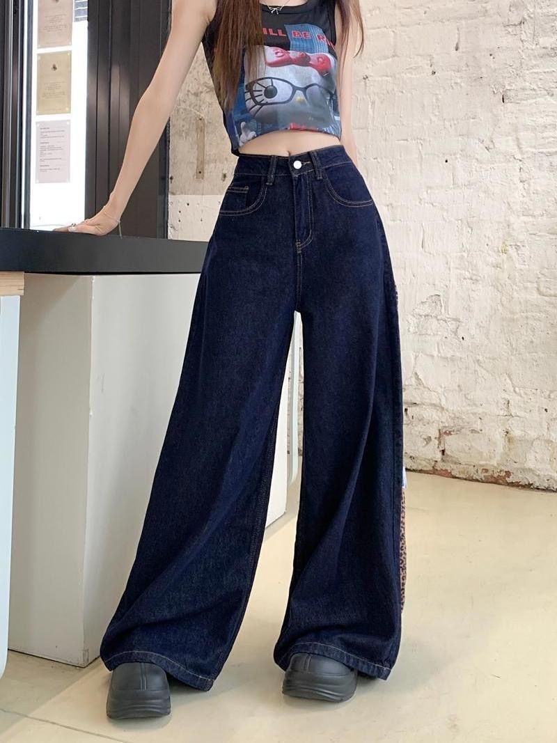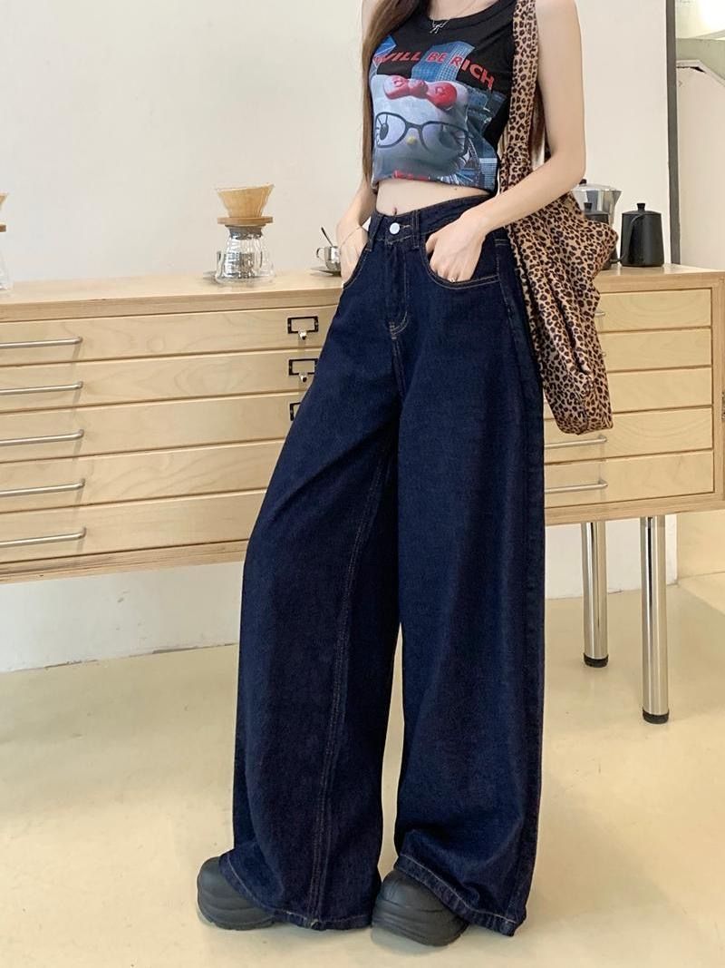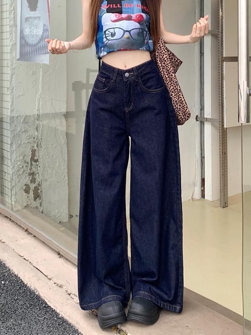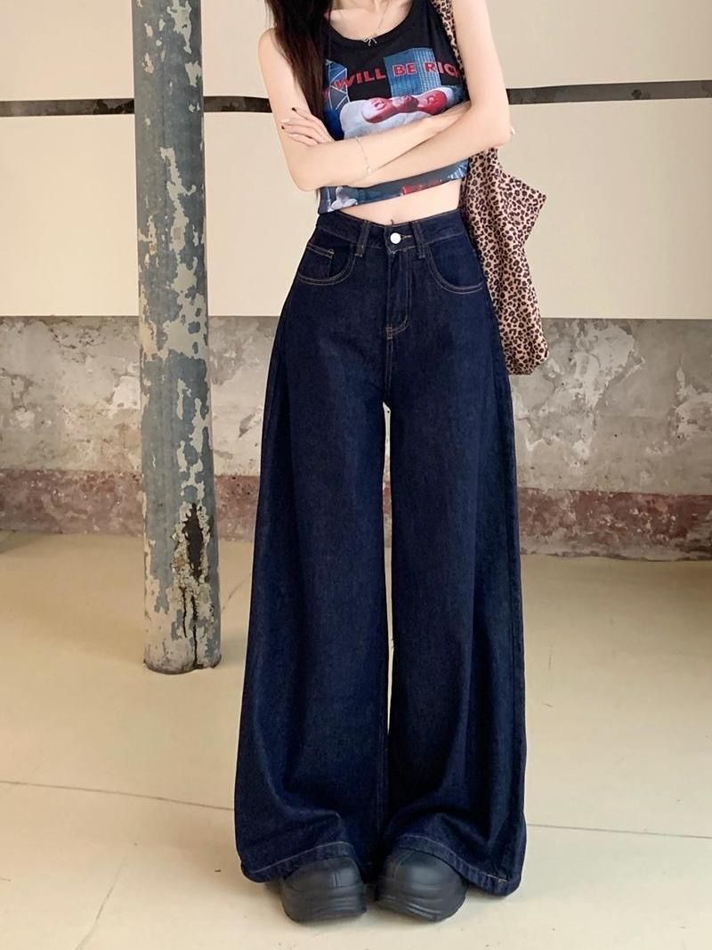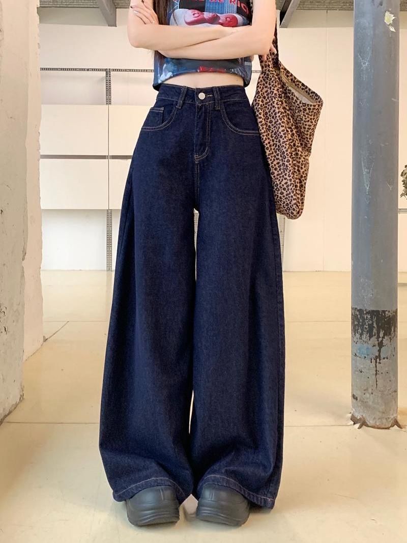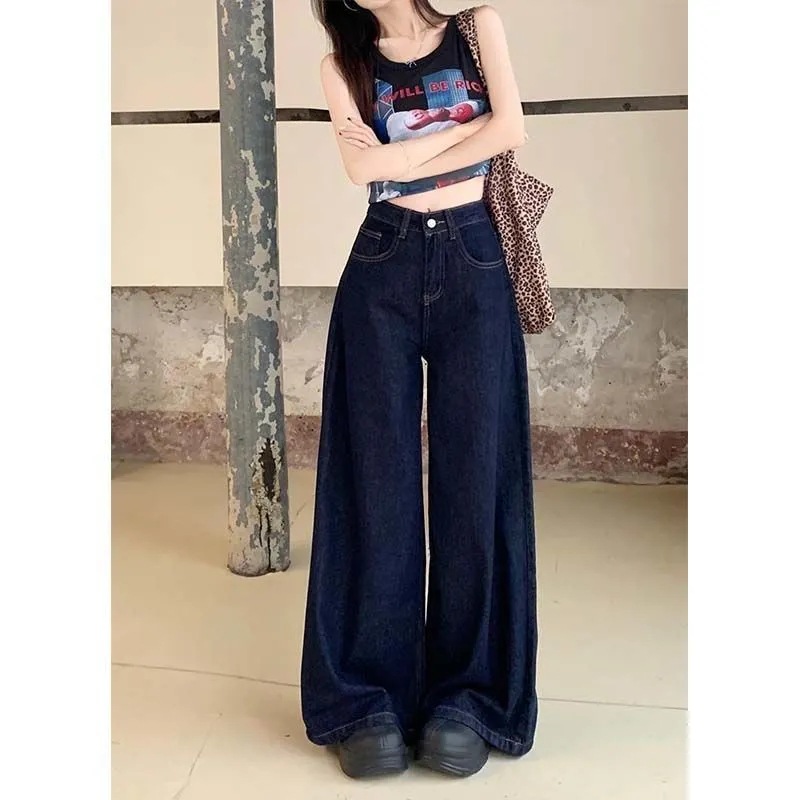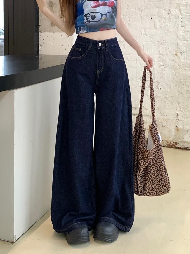간단한 다크 블루 높은 허리 슬리밍 팝 청바지 여성의 2024 여름 새로운 느슨한 넓은 다리 바지스토어 가기