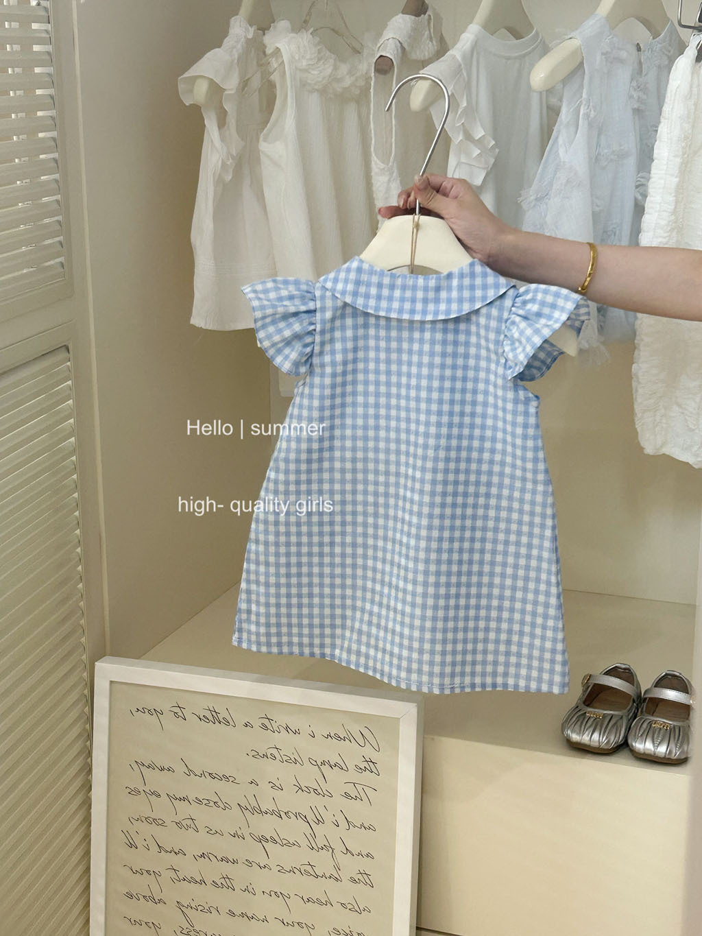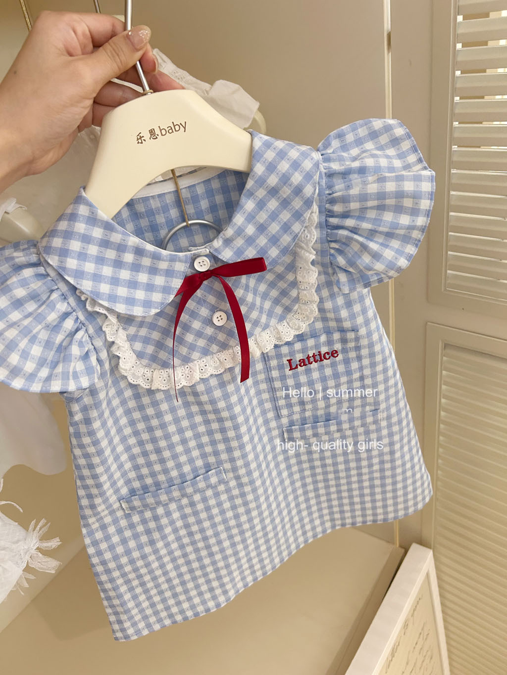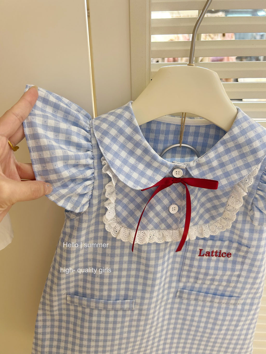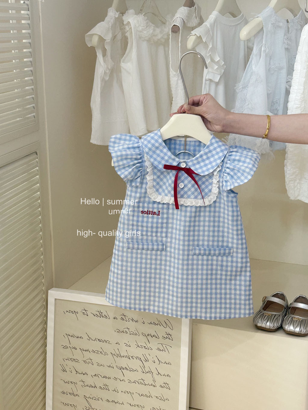 통 싱위안 2025 여자 대학 스타일 블루 체크 플라잉 슬리브 원피스 아기 여름 한국 레이스 인형 원피스스토어 가기