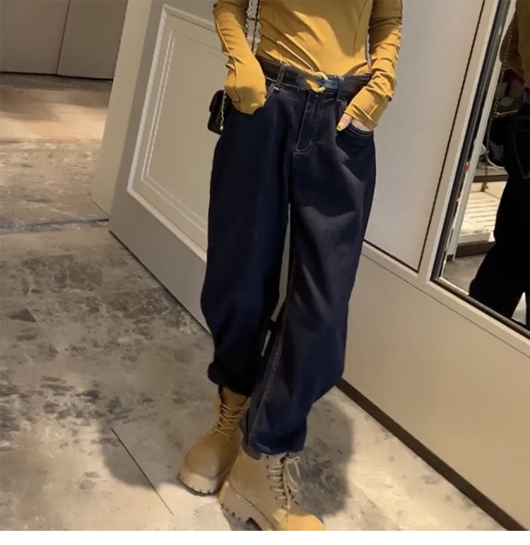 플러스 사이즈 2023 봄과 가을 새로운 느슨한 튜닉 바지 여성 통통녀 높은 허리 슬리밍 다크 블루 데님 할란 바지스토어 가기
