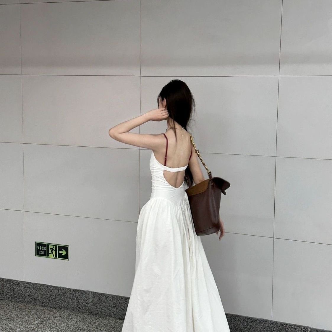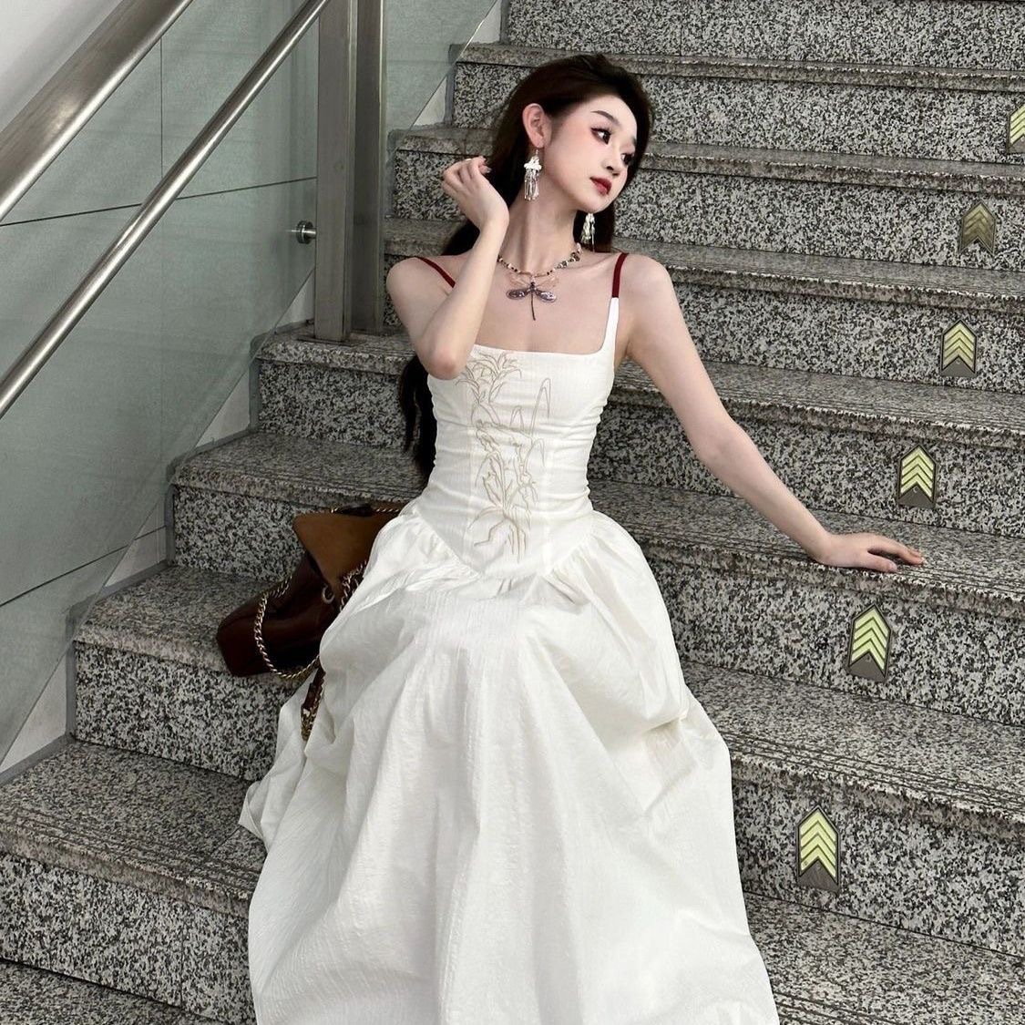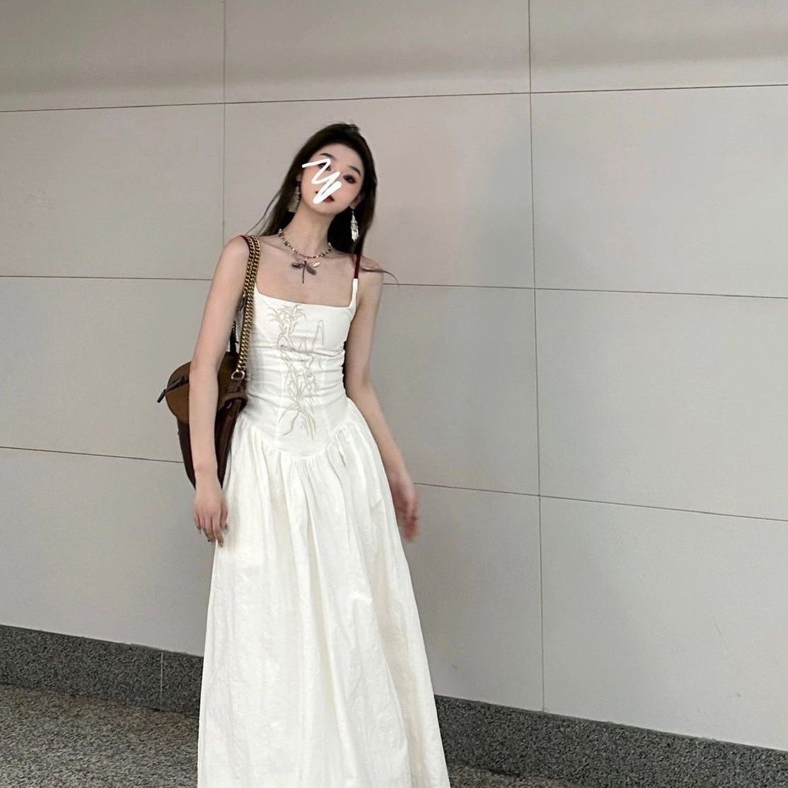 디자인 센스 새로운 중국 자수 슬림 핏 달콤하고 매운 올 매치 작은 순수한 욕망 긴 백리스 슬링 원피스 여성스토어 가기