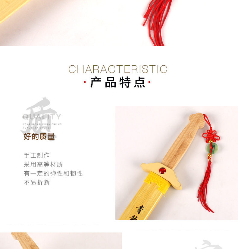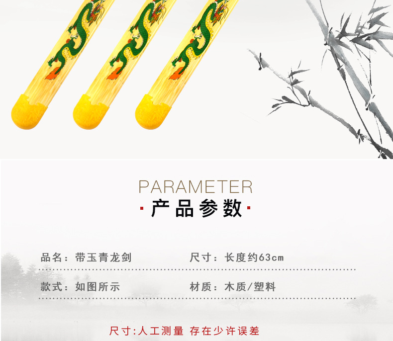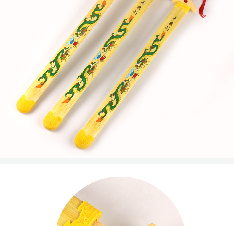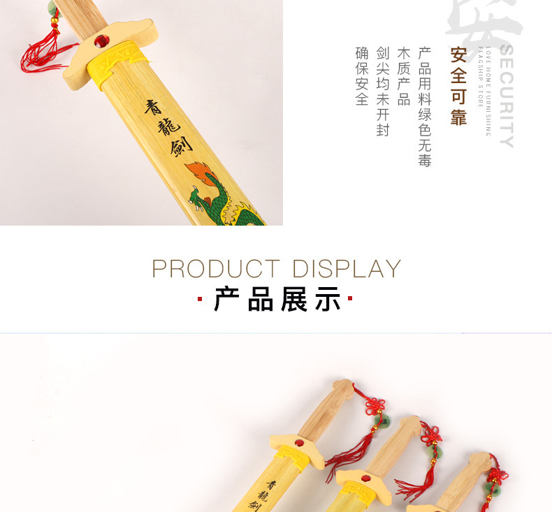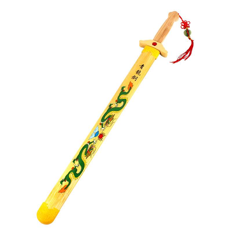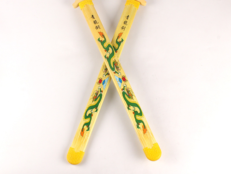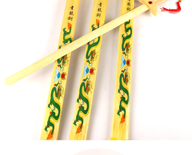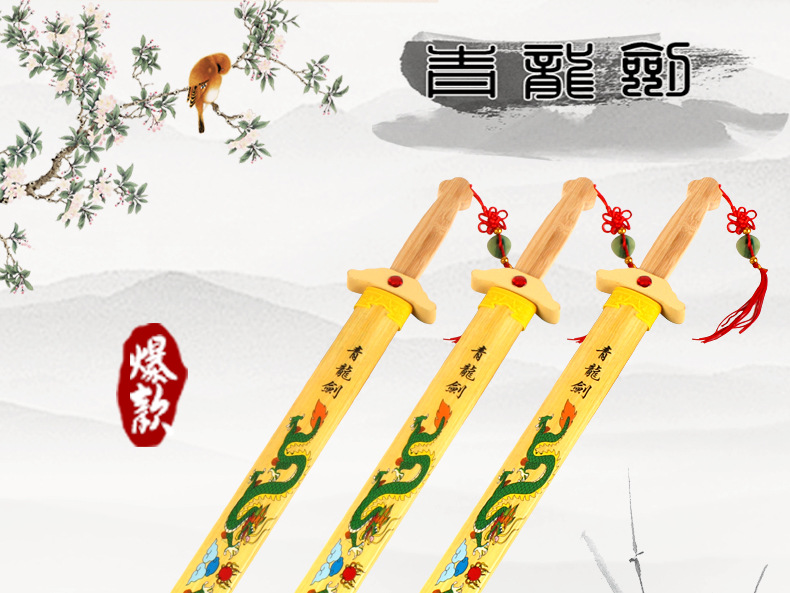 青龙剑属于竹木刀剑系列,无任何杀伤力。对于热爱功夫的人来说,这样的一件兵器是你娱乐的最好选择,木制的刀剑避免了钢铁所造成的伤害性,逼真效果绝对不比真剑差。它可以用来自己收藏当摆件,也可以给小朋友们玩耍,提高小朋友们的动手能力,达到锻炼的效果;它也可以用来做演戏或者Cosplay的道具;也可以用来做晨练的兵器,这些它都能够胜任。现在在各大景区及庙会都非常的畅销!!!!