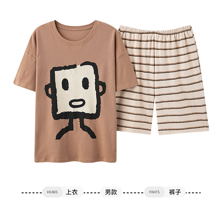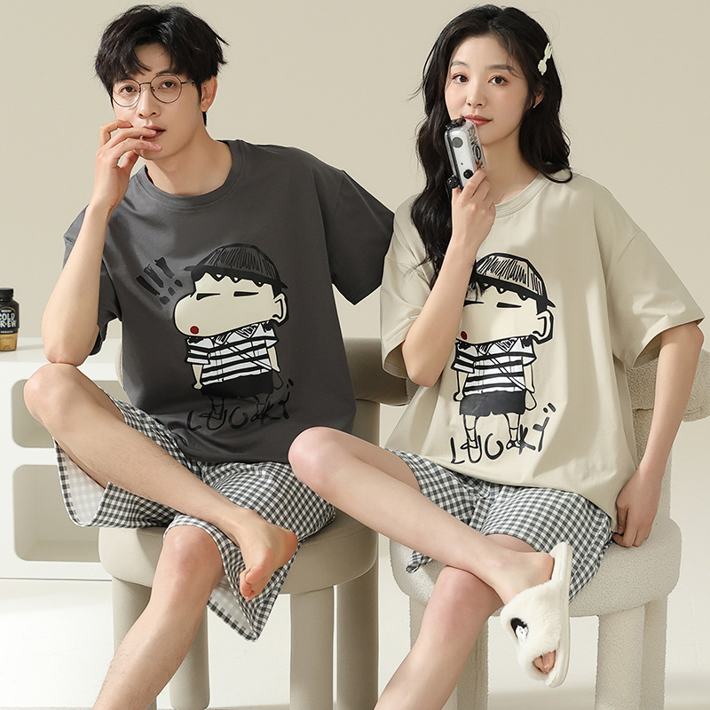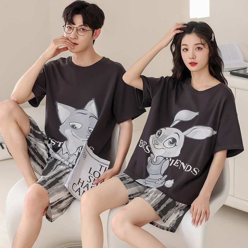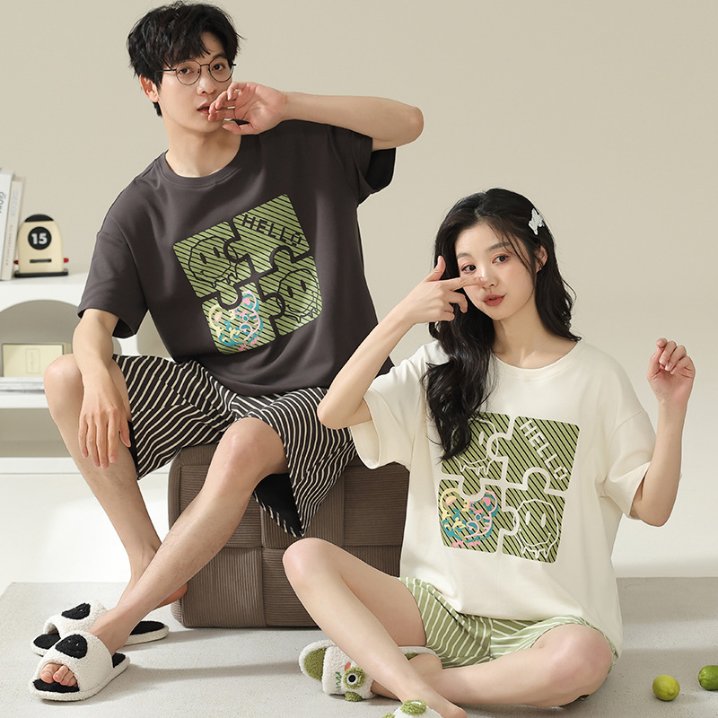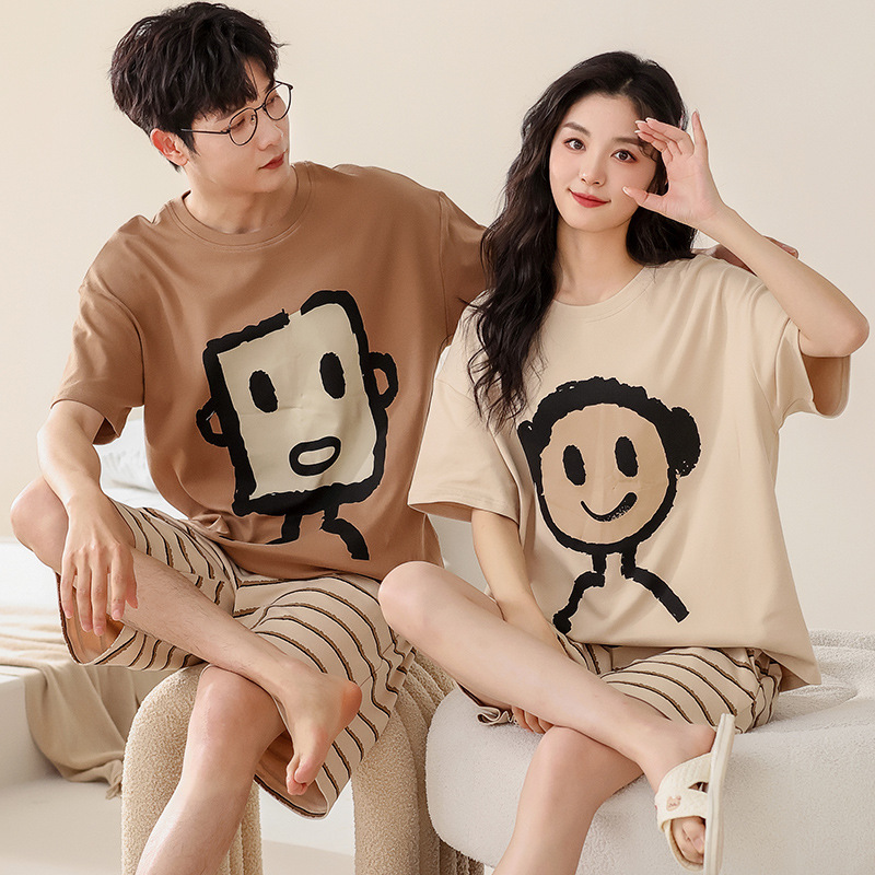 커플 잠옷 여름 순수한면 만화 귀여운 반팔 반바지 얇은 외부 입고 남성과 여성 학생 홈 의류 세트