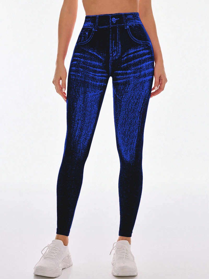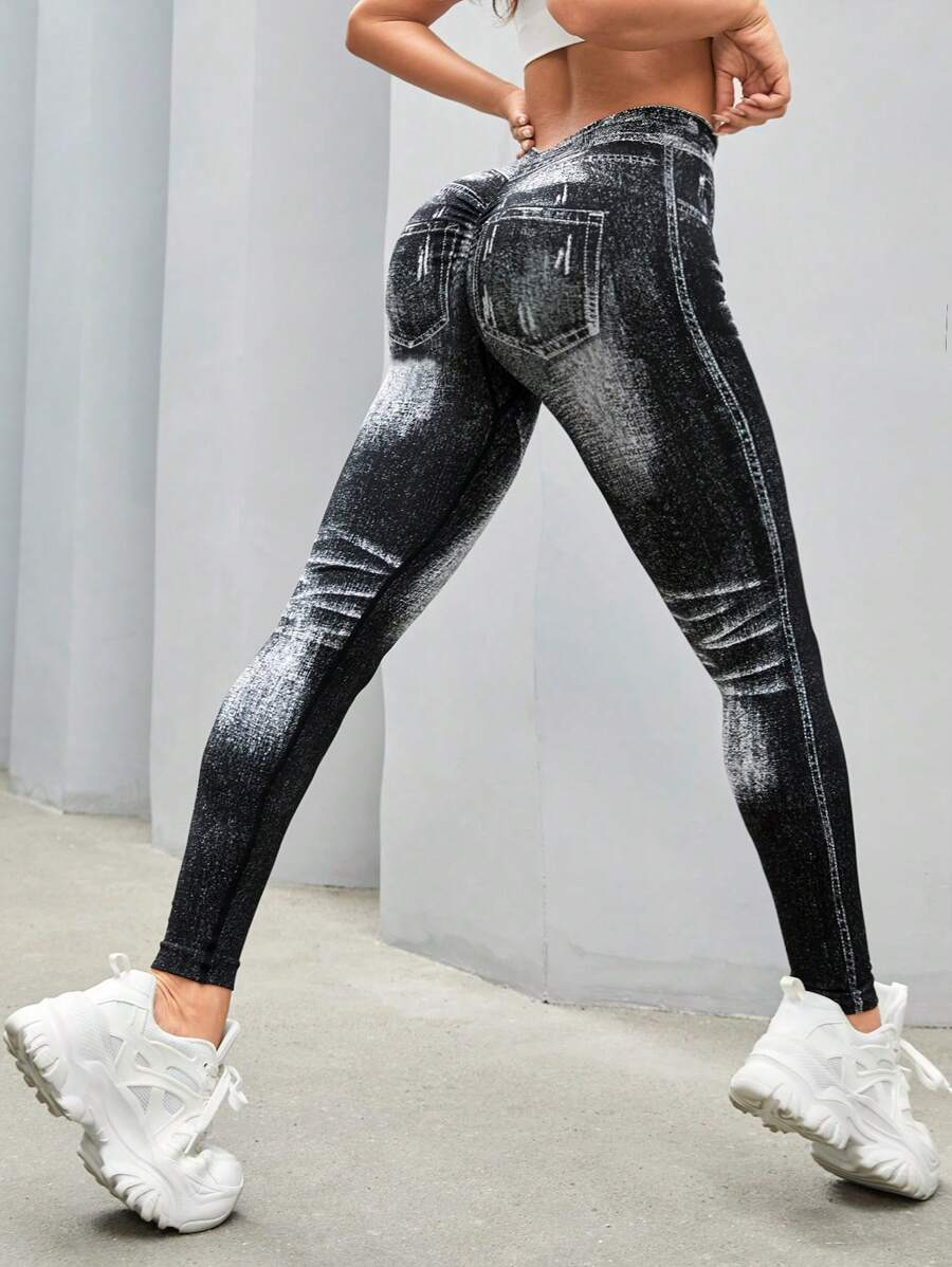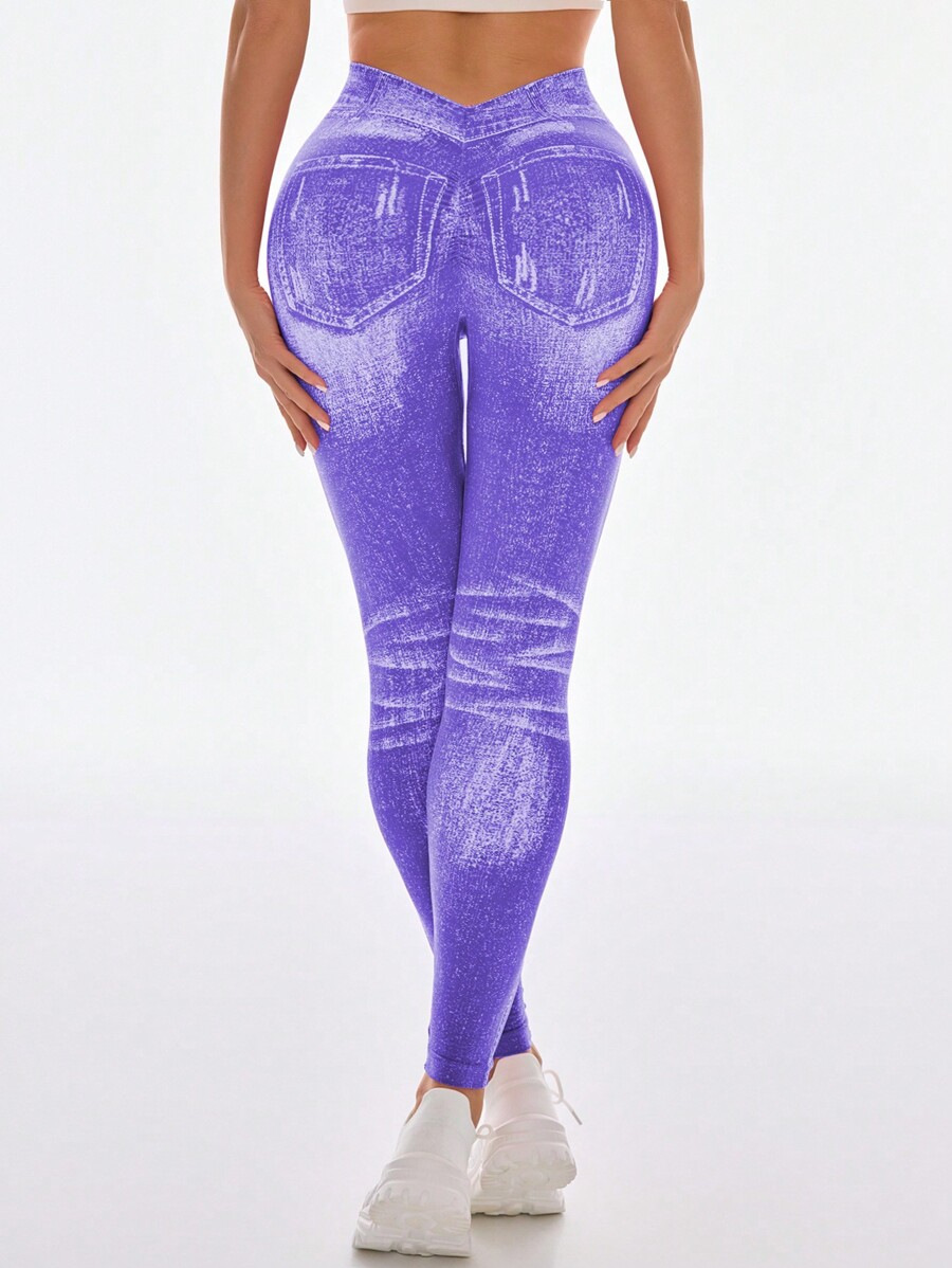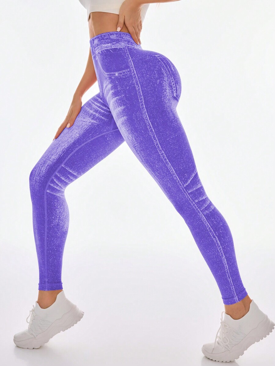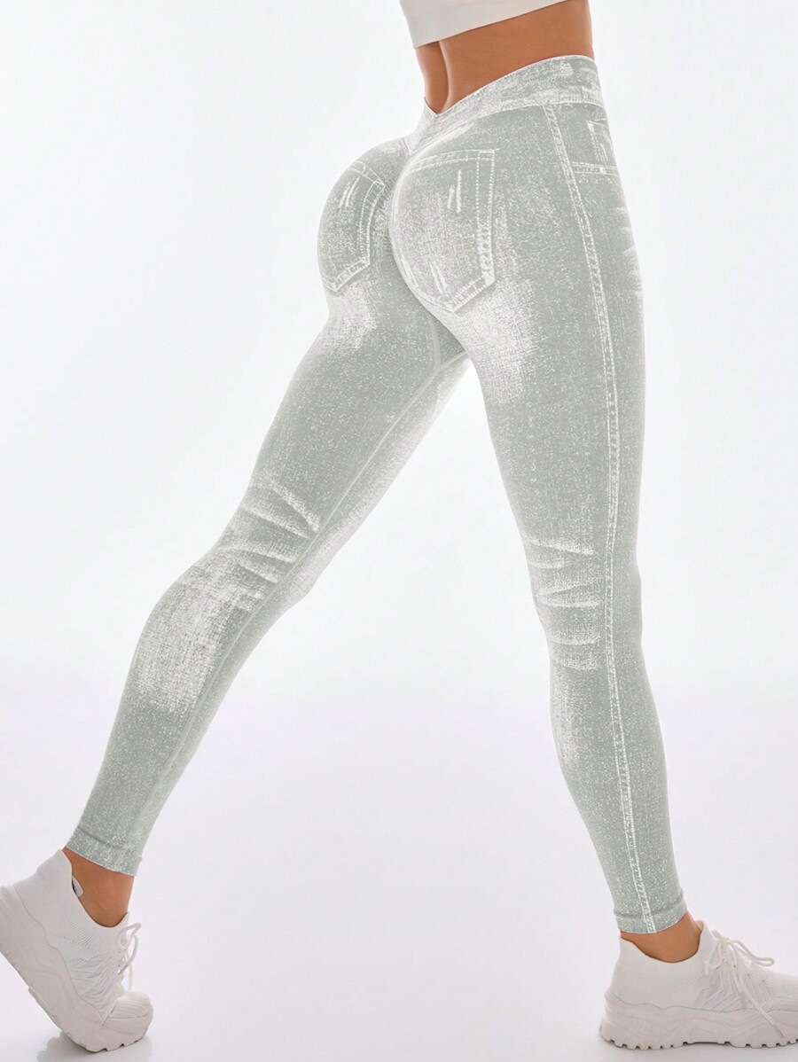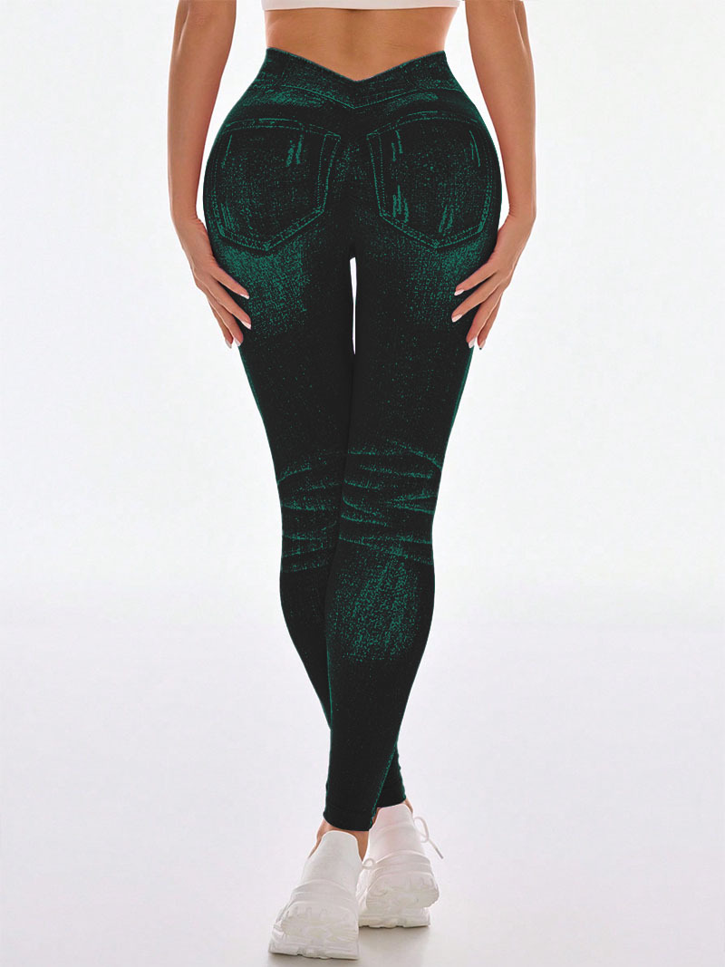 유럽과 미국의 모방 데님 고탄성 피트니스 팬츠 원활한 리어 V 복숭아 힙 슬림 러닝 요가 바지 여성