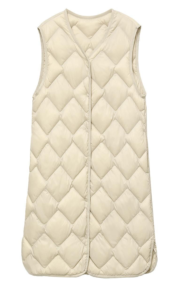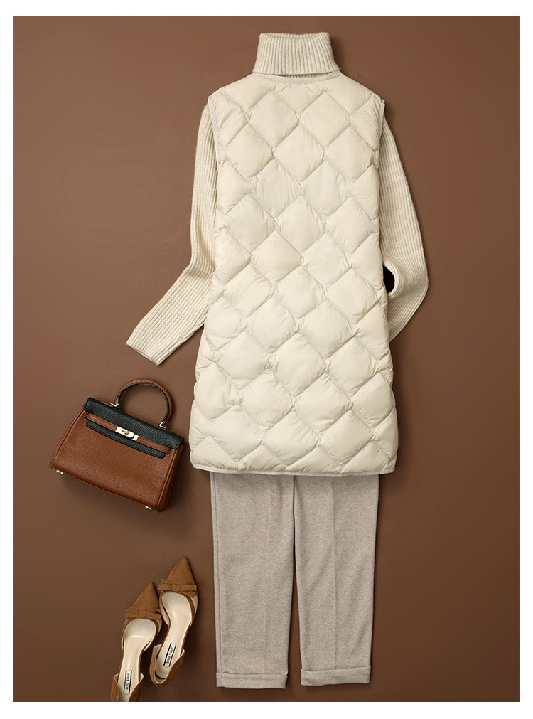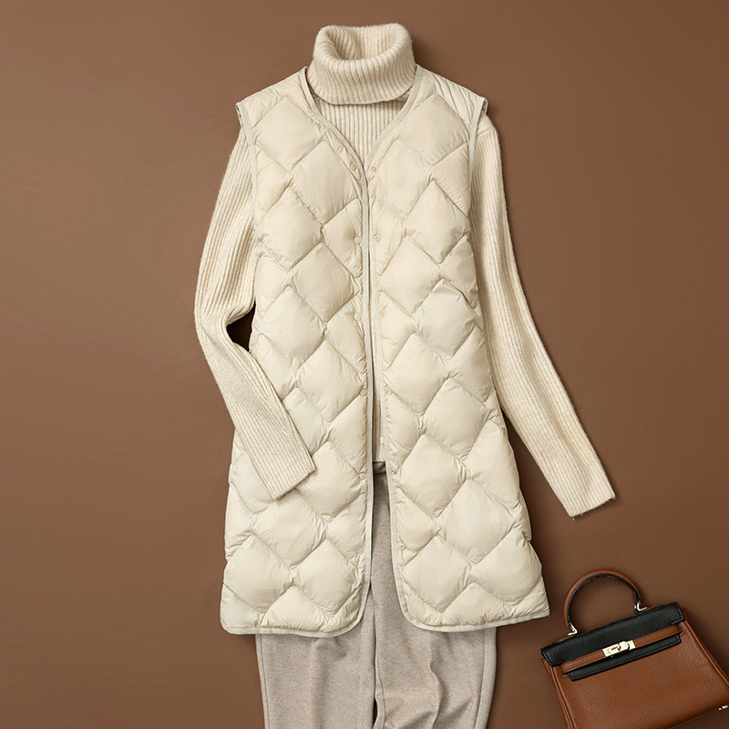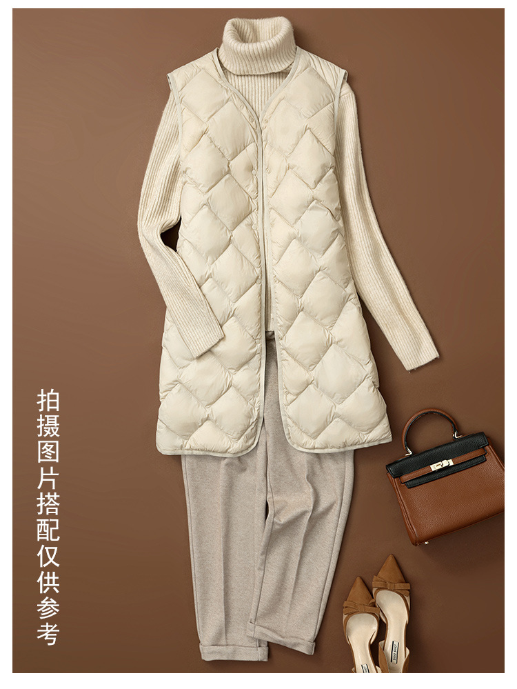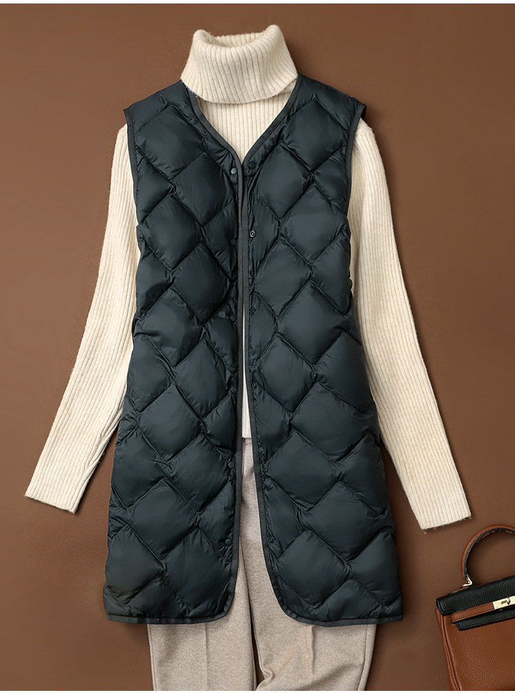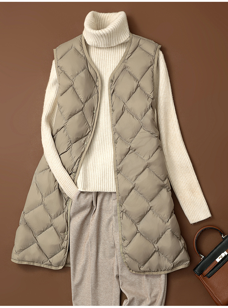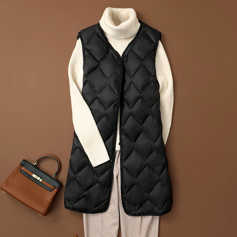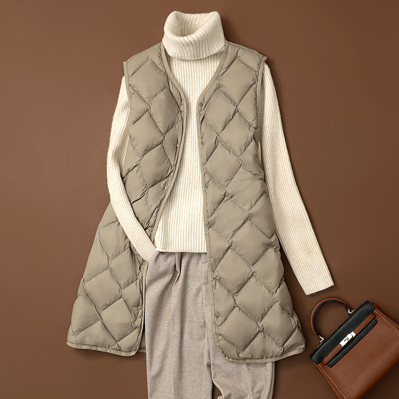 국경 간 2025 가을, 겨울 새로운 경량 다운 조끼 여성 중간 길이 대형 마름모 다운 라이너 양복 조끼