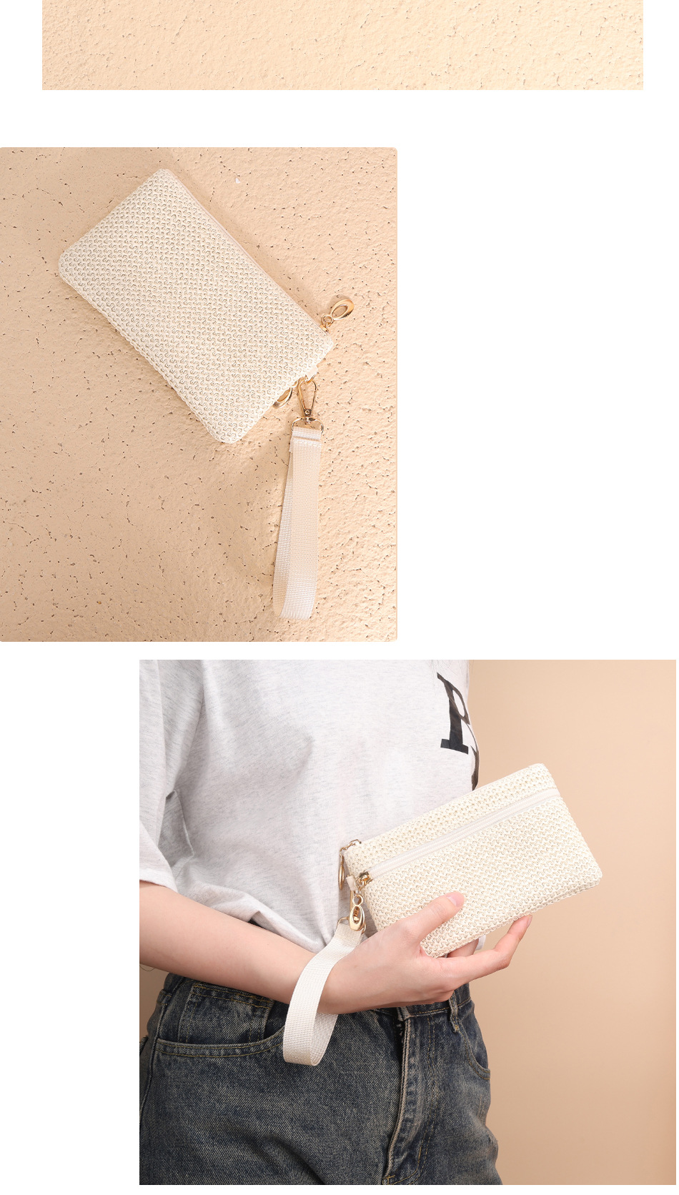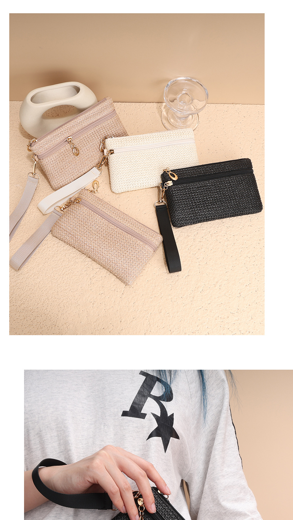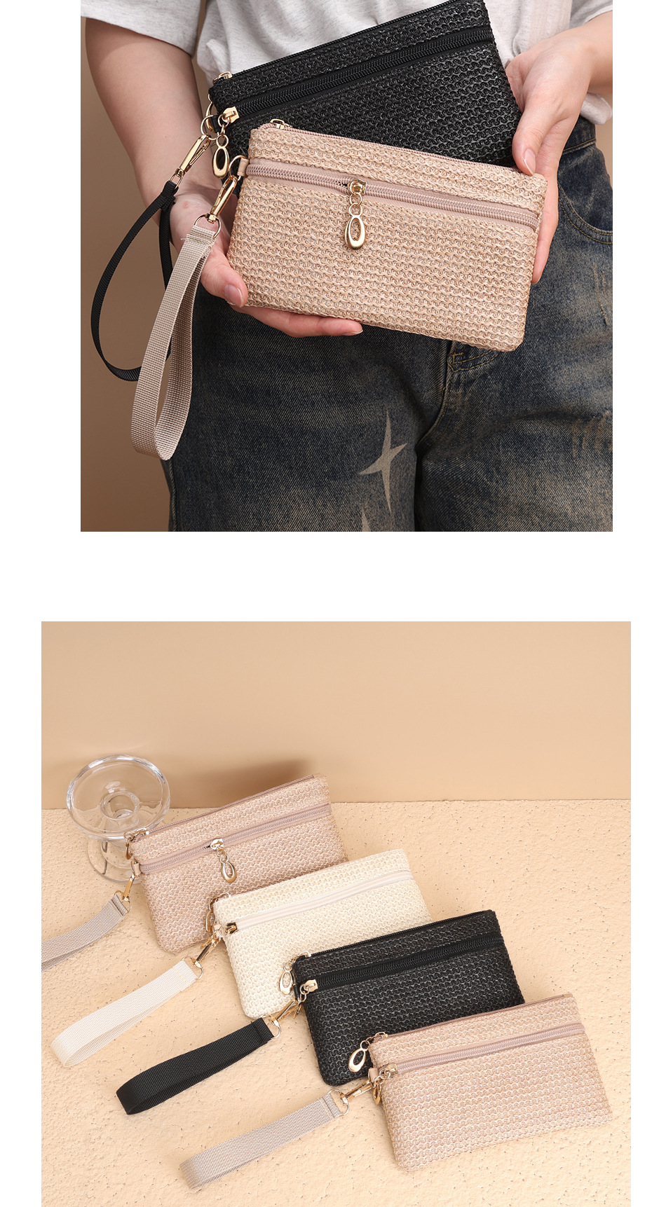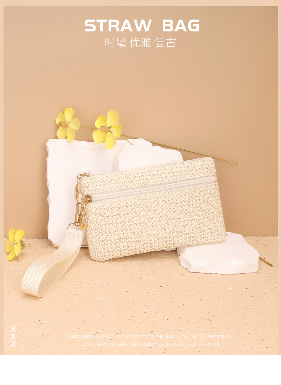 2025년 신상품 밀짚 지갑 동전 지갑 장지갑 동전 키 카드 지갑 여성용 지갑 더블 지퍼 핸드백