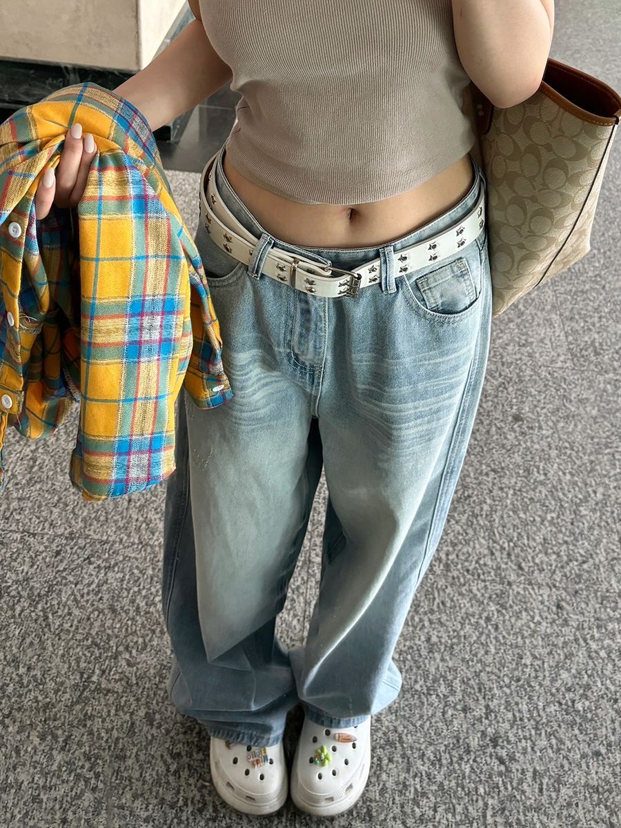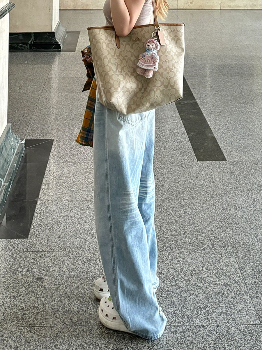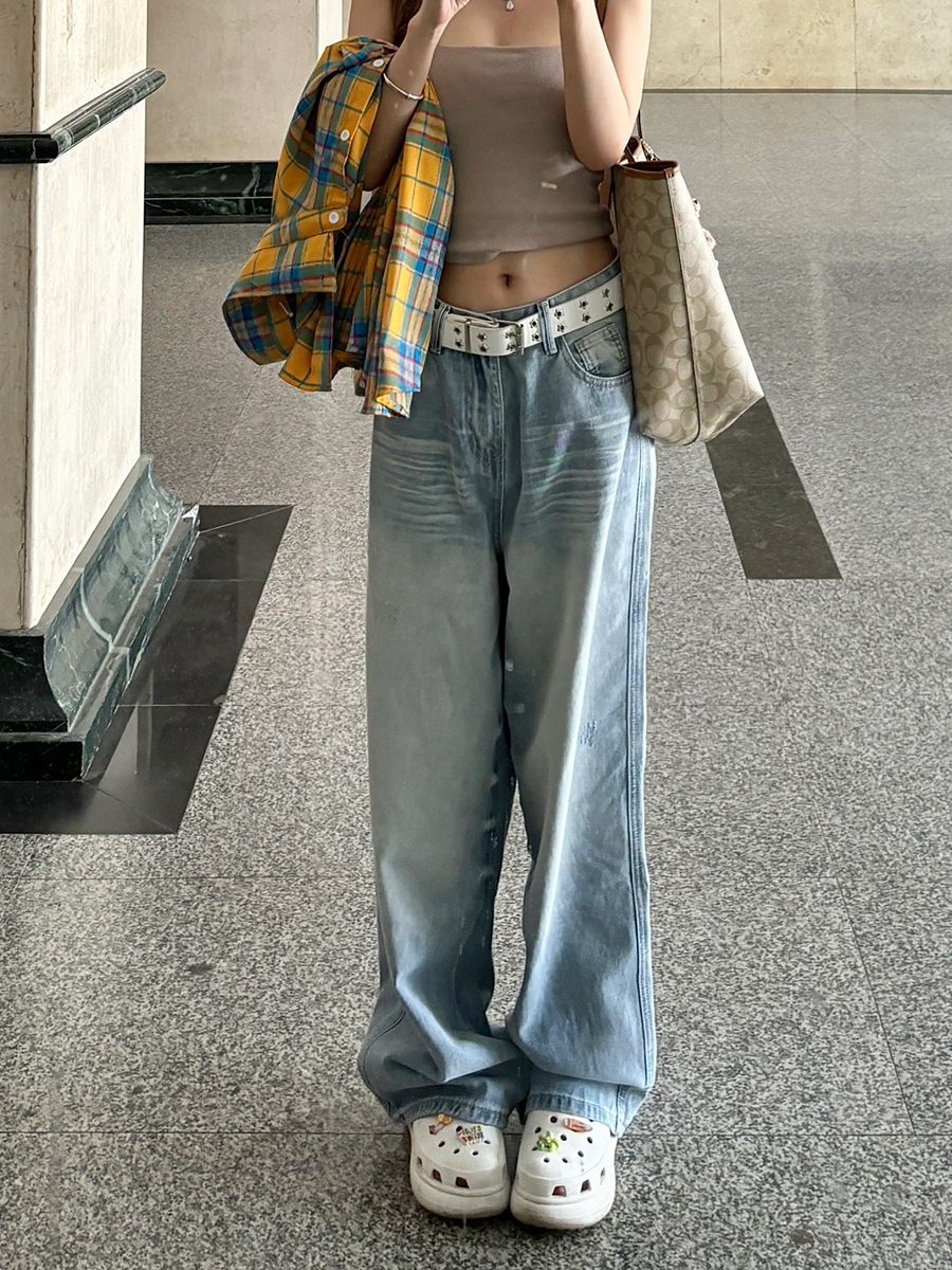 아메리칸 스타일 라이트 블루 넓은 다리 청바지 여성용 느슨한 슬리밍 하이 스트리트 2024 여름 새로운 스트레이트 바지스토어 가기