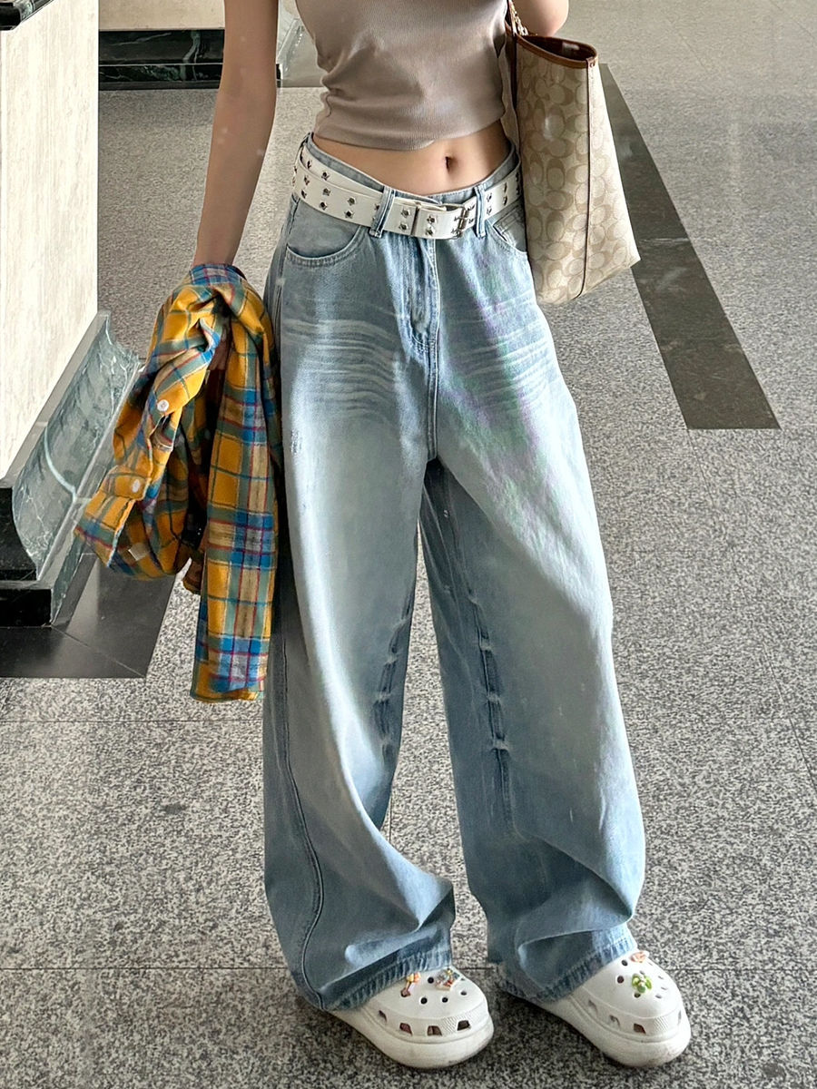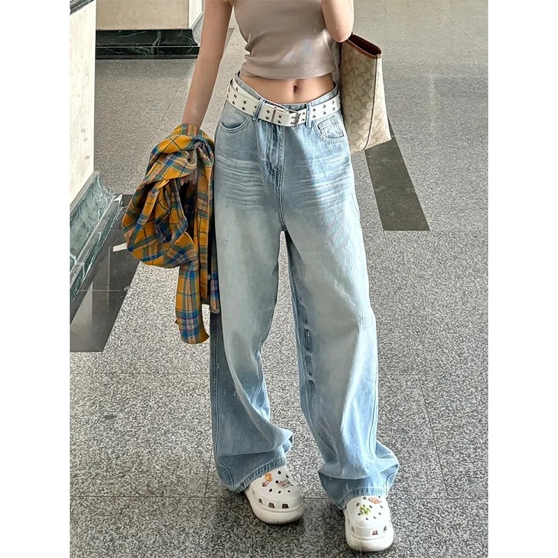 아메리칸 스타일 라이트 블루 넓은 다리 청바지 여성용 느슨한 슬리밍 하이 스트리트 2024 여름 새로운 스트레이트 바지