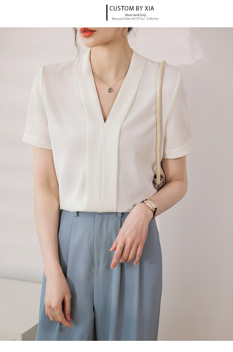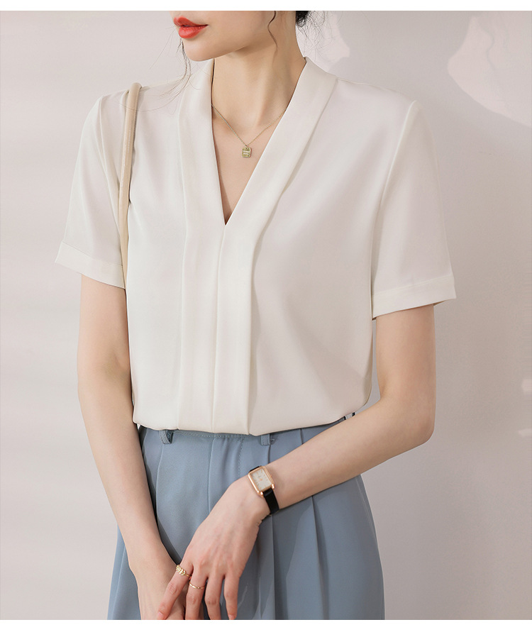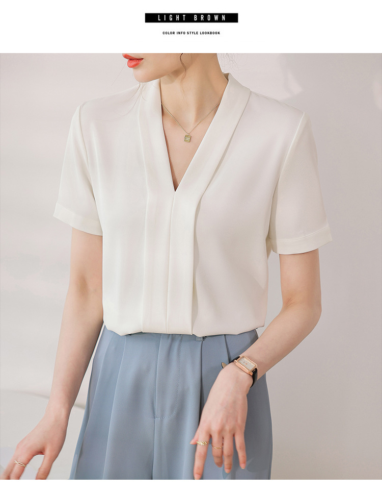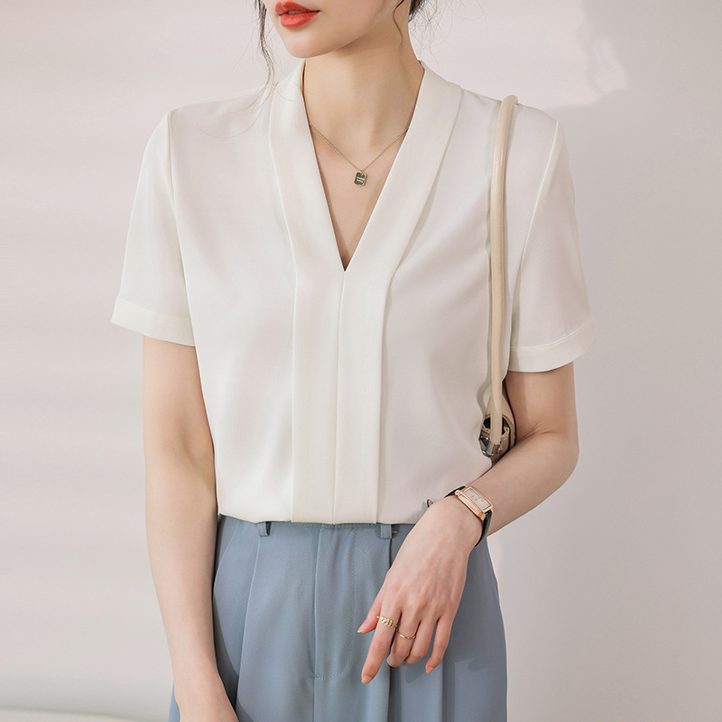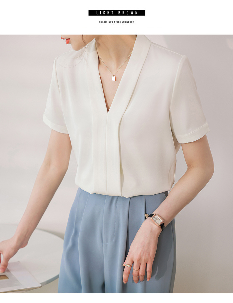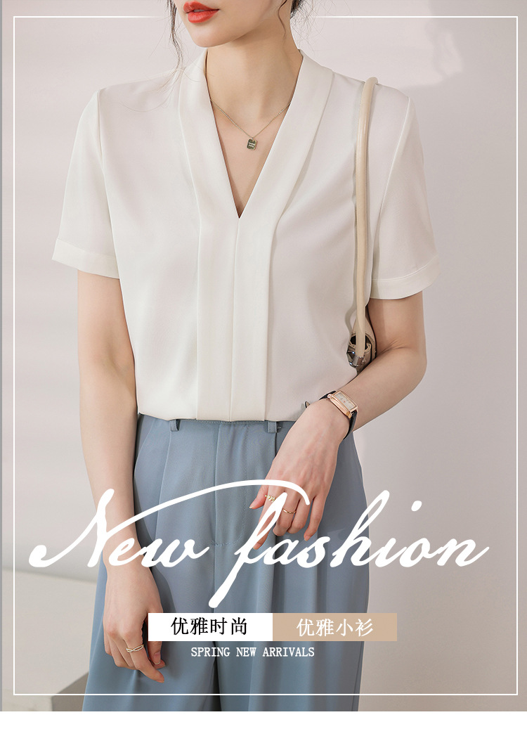2024 시폰 셔츠 여성 디자인 센스 틈새 비즈니스 착용 통근 셔츠 여름 새로운 반팔 V 넥 탑스토어 가기