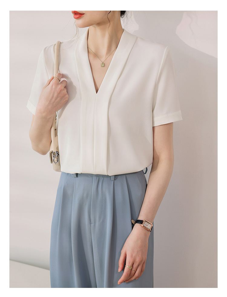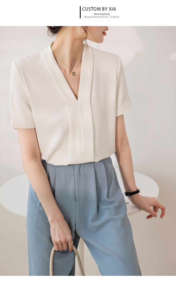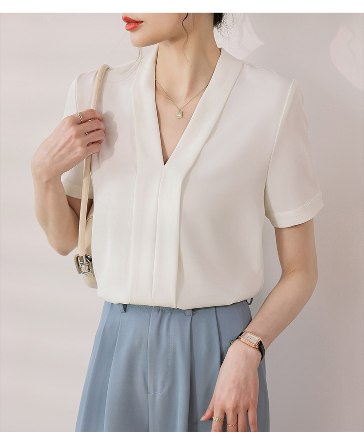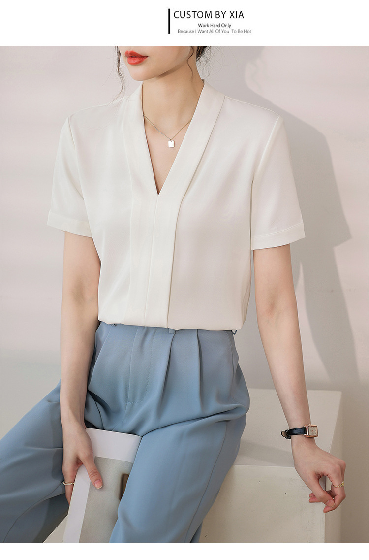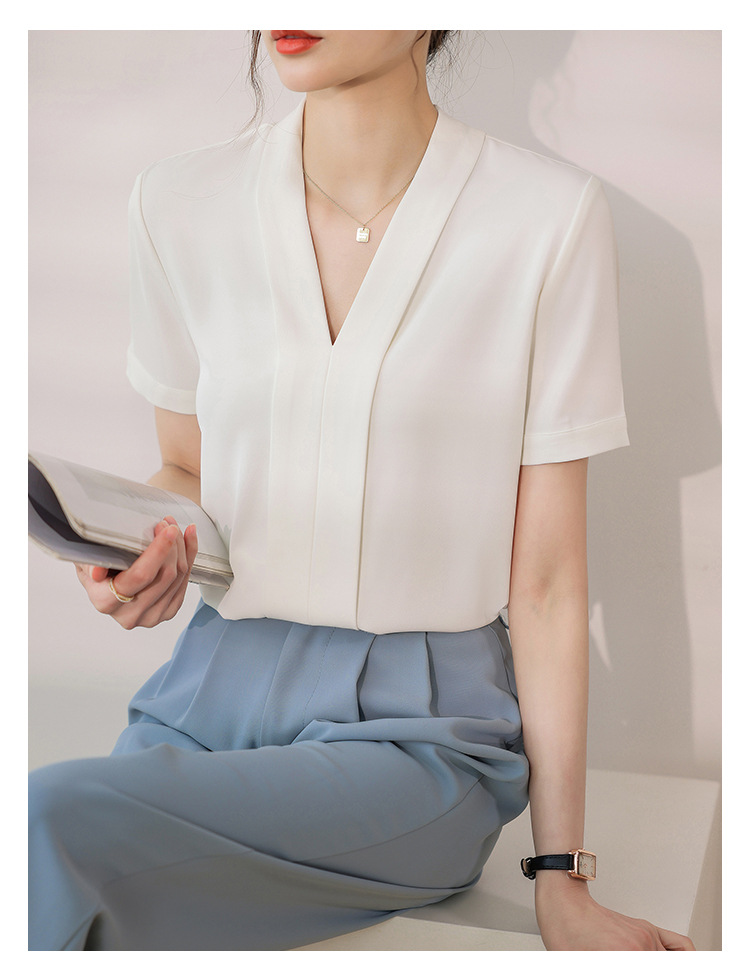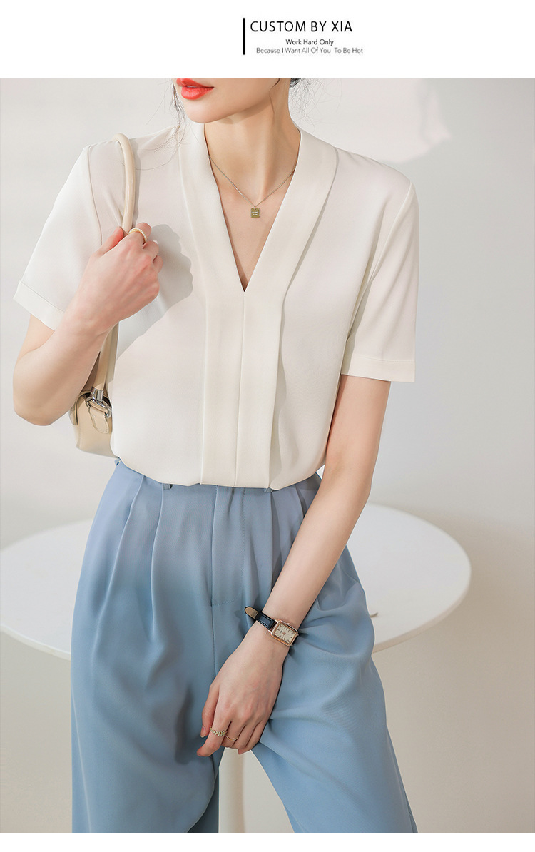 2024 시폰 셔츠 여성 디자인 센스 틈새 비즈니스 착용 통근 셔츠 여름 새로운 반팔 V 넥 탑스토어 가기