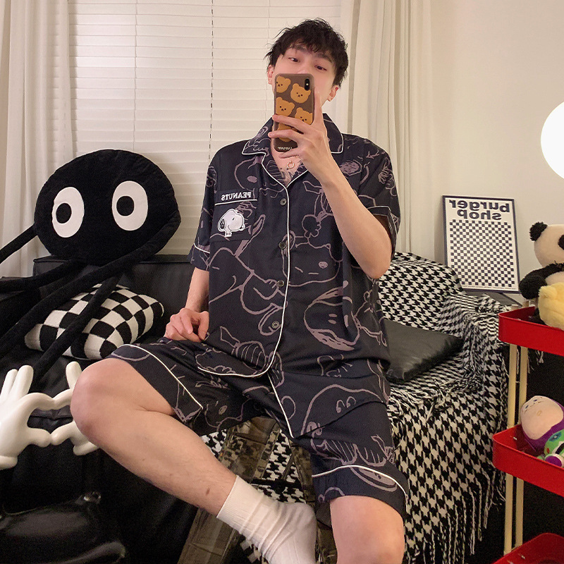 새로운 만화 스누피 파자마 남성 모조 면 여름 카디건 짧은 소매 반바지 십대 홈 의류 세트